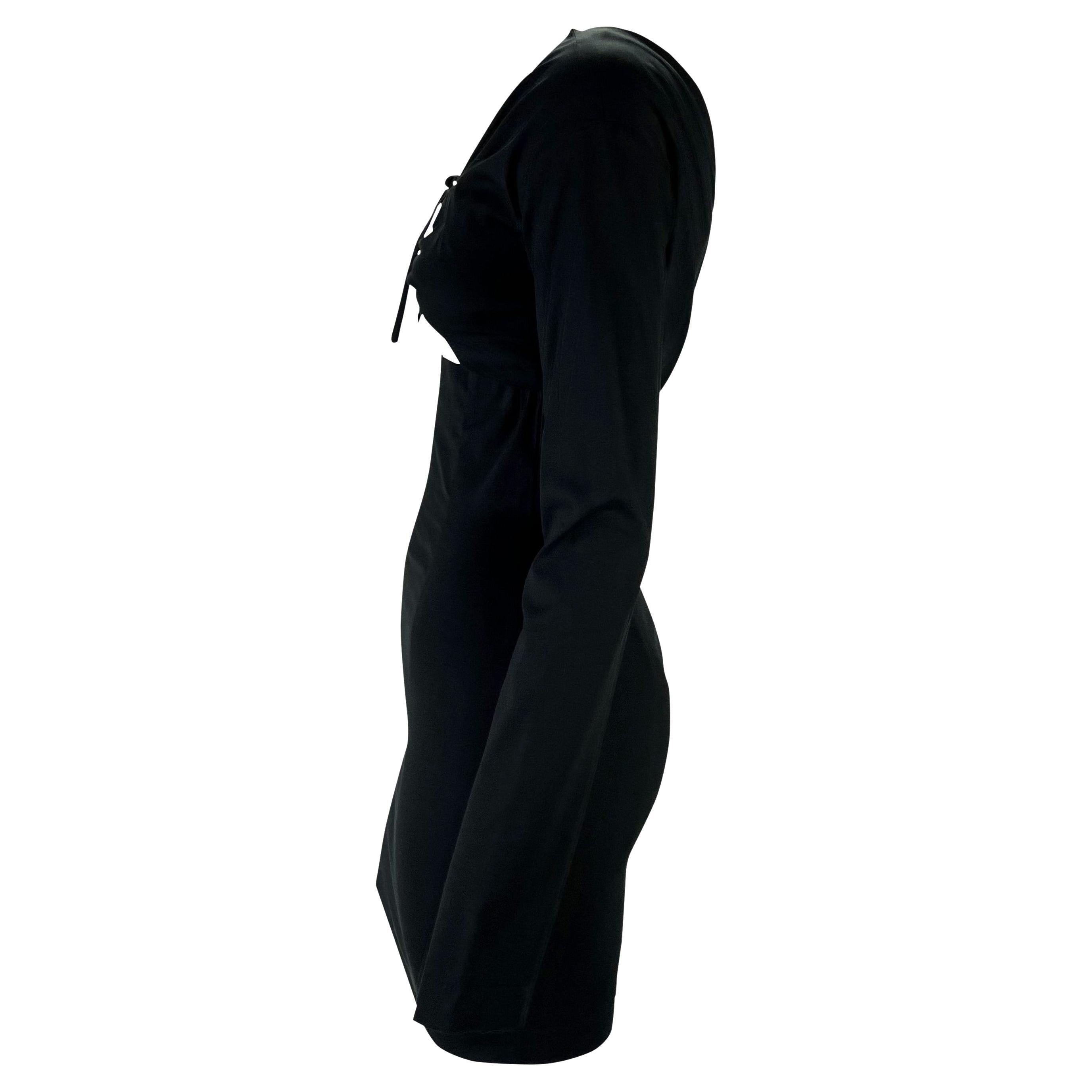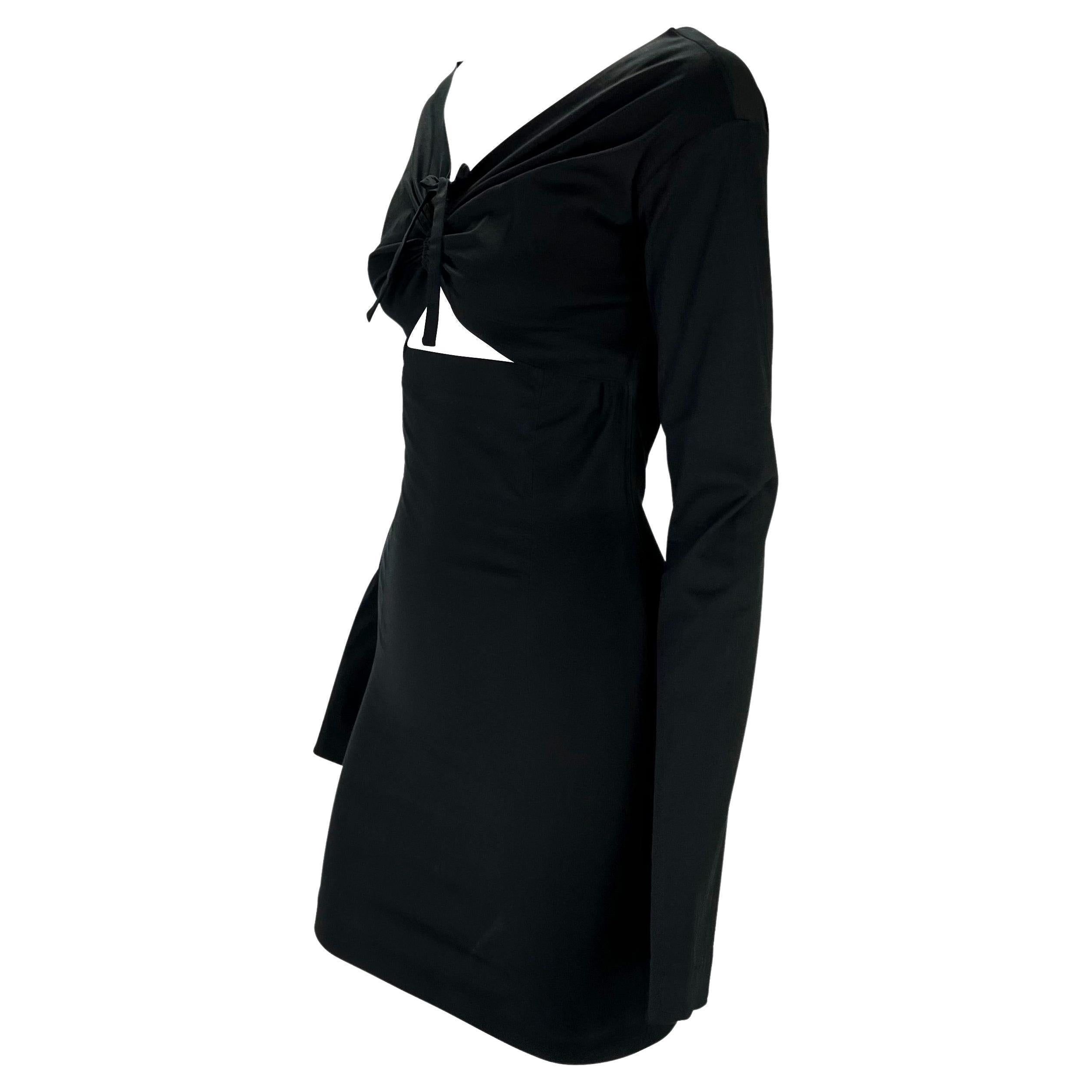 Presenting a gorgeous black formfitting Dolce and Gabbana mini dress. From the Spring/Summer 1992 collection, this sexy wrap effect dress features a fitted skirt that wraps around the bust from the back. A similar dress was worn by Cindy Crawford on the season's runway. The dress is made complete with long sleeves, an opening below the bust, and a pull tie between the breasts. An absolutely fabulous early 1990s piece by Dolce and Gabbana, this effortlessly chic and sexy dress remains modern more than 30 years later!
