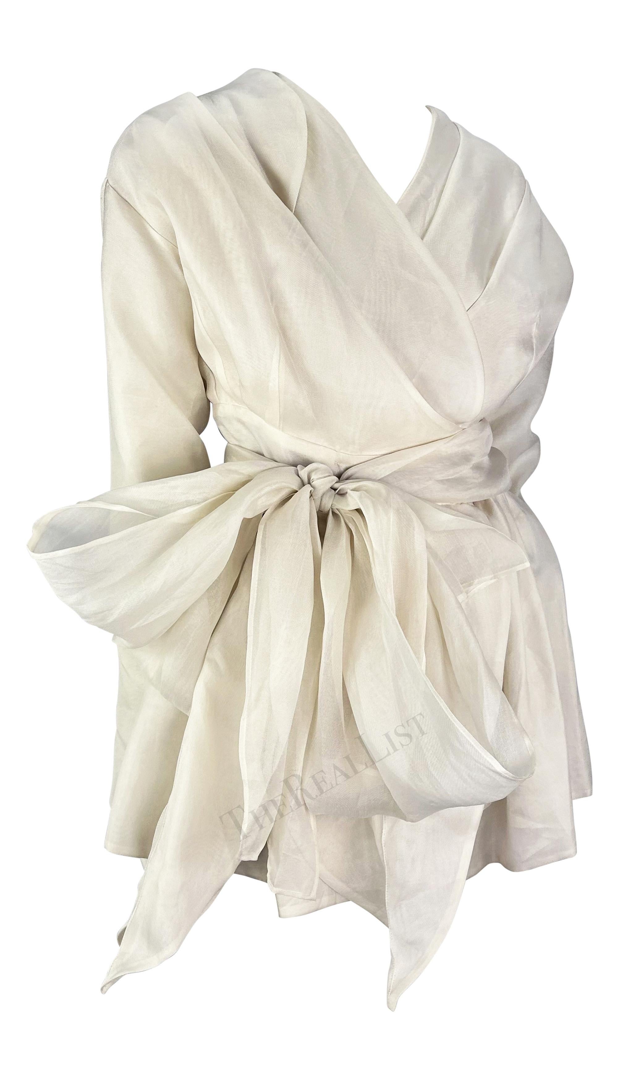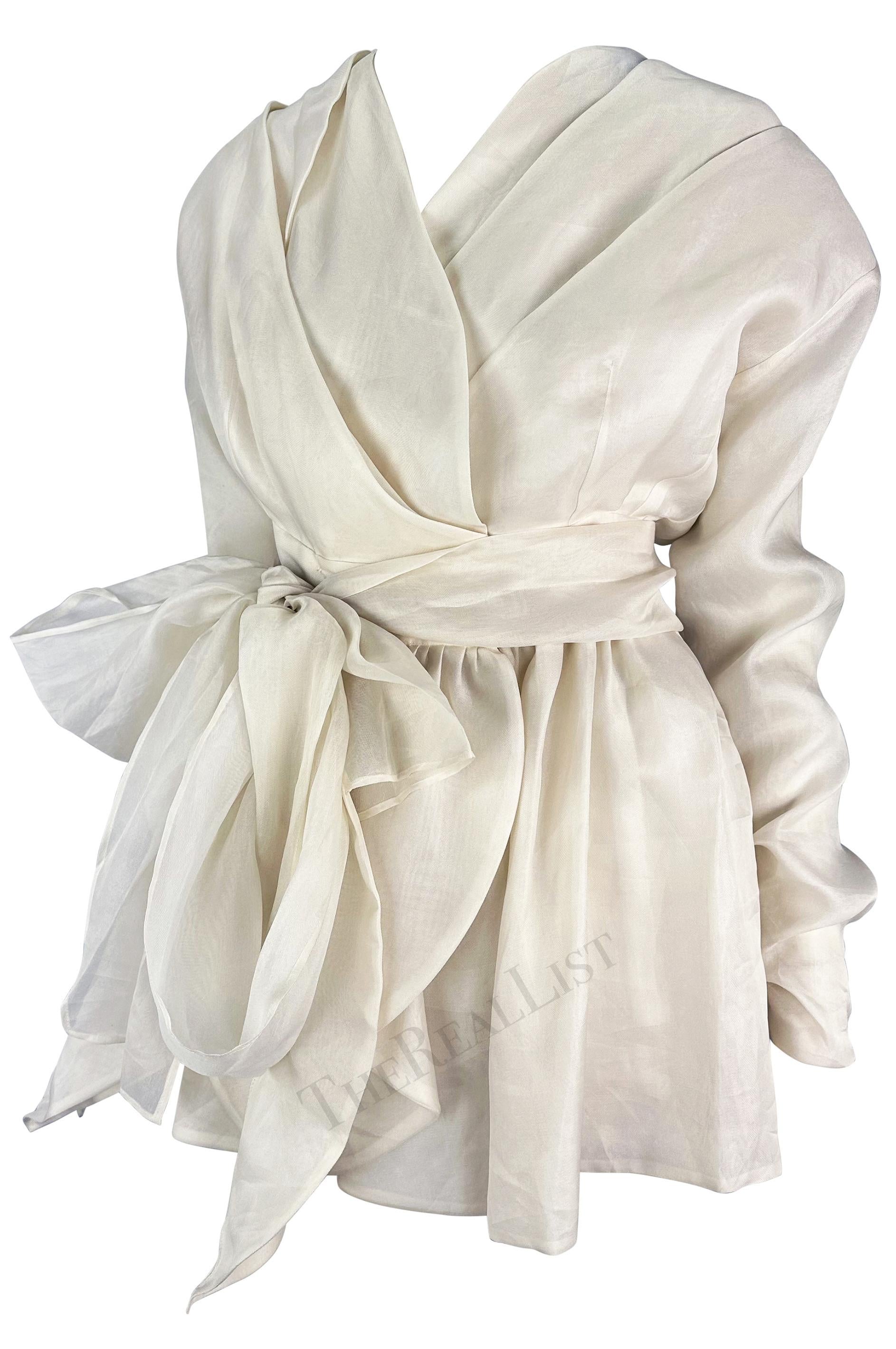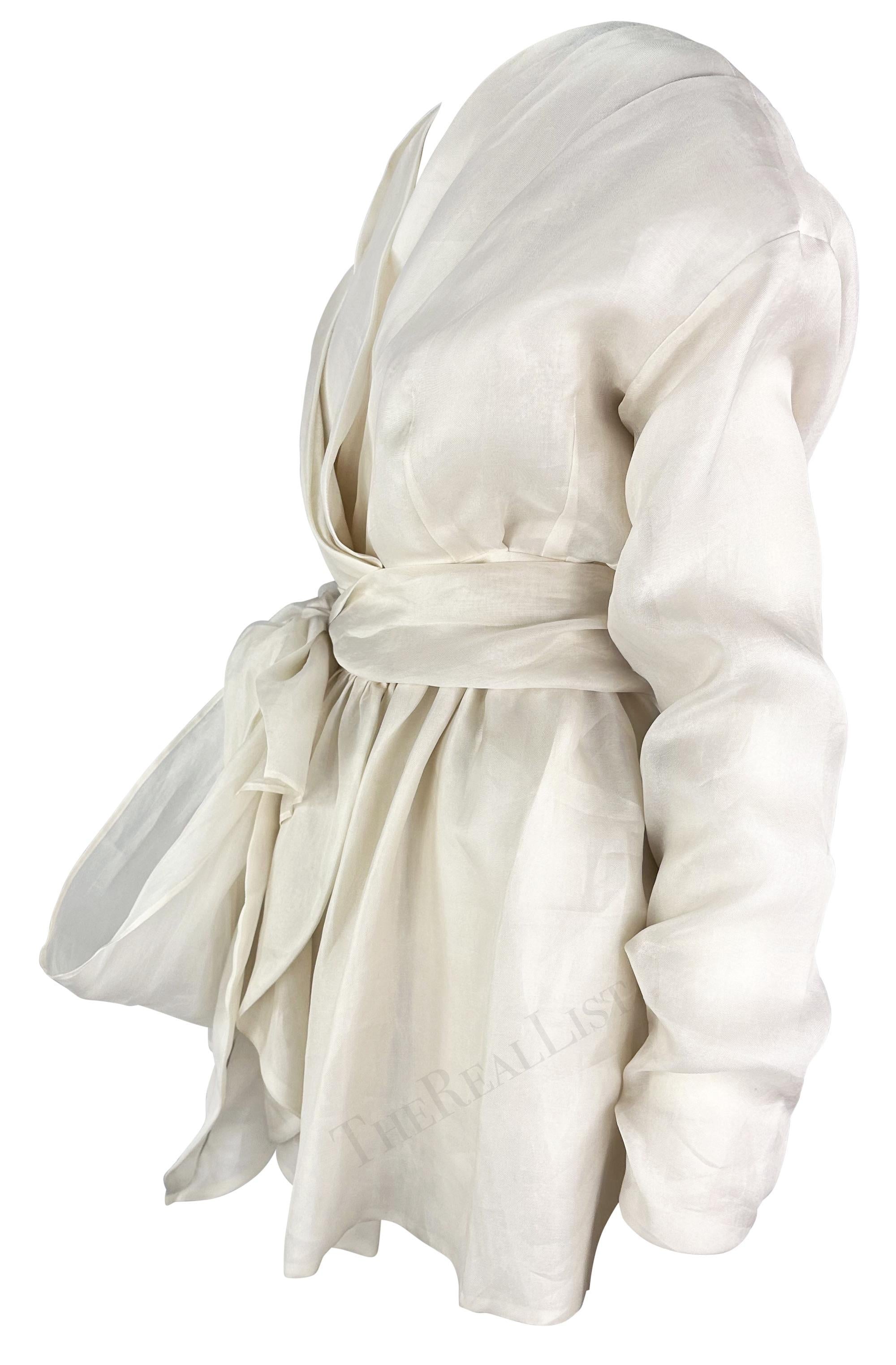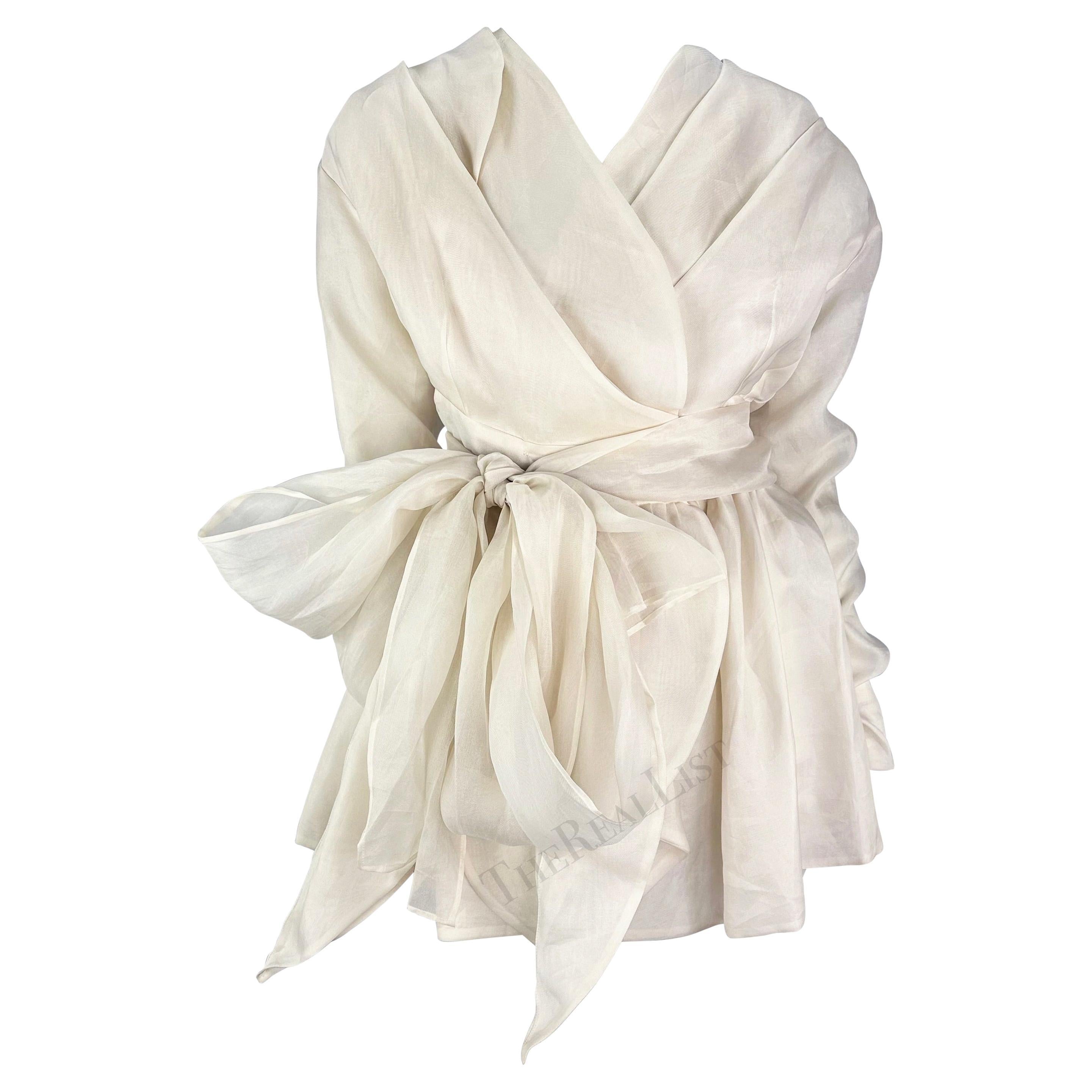 Presenting a fabulous white silk Dolce & Gabbana flowy blouse. From the Spring/Summer 1992 collection, a version of this top debuted on the season's runway. Constructed using an abundance of white silk, this long-sleeve top features a wrap closure and structured wrap waist belt. Perfectly chic, this vintage Dolce & Gabbana top is the perfect addition to any refined wardrobe!