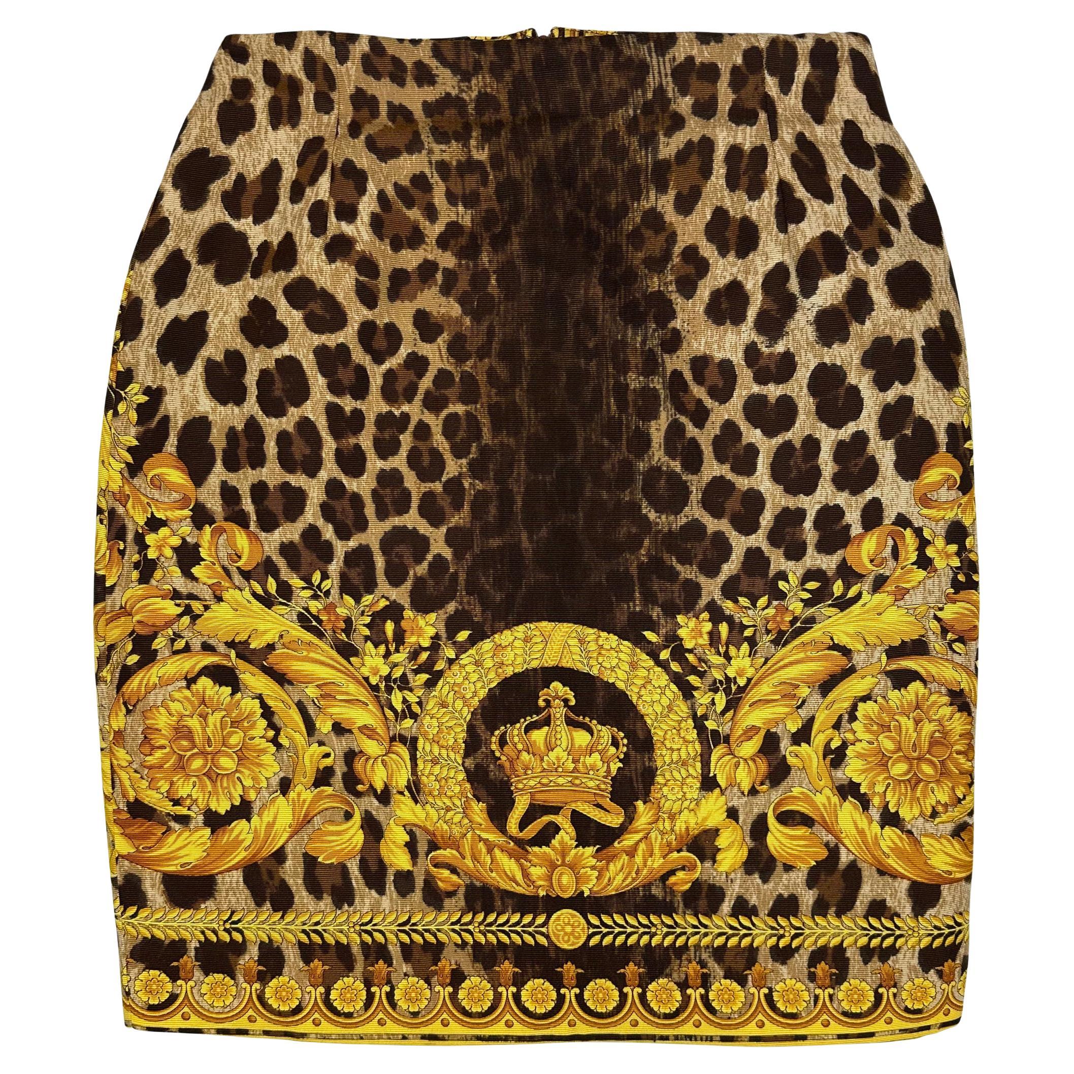 Introducing a Gianni Versace mini skirt featuring a distinctive baroque print. Designed by Gianni Versace for the Spring/Summer 1992 collection, this skirt combines a baroque pattern with a leopard print. This unique print first appeared in this collection and later became a house code for the brand.