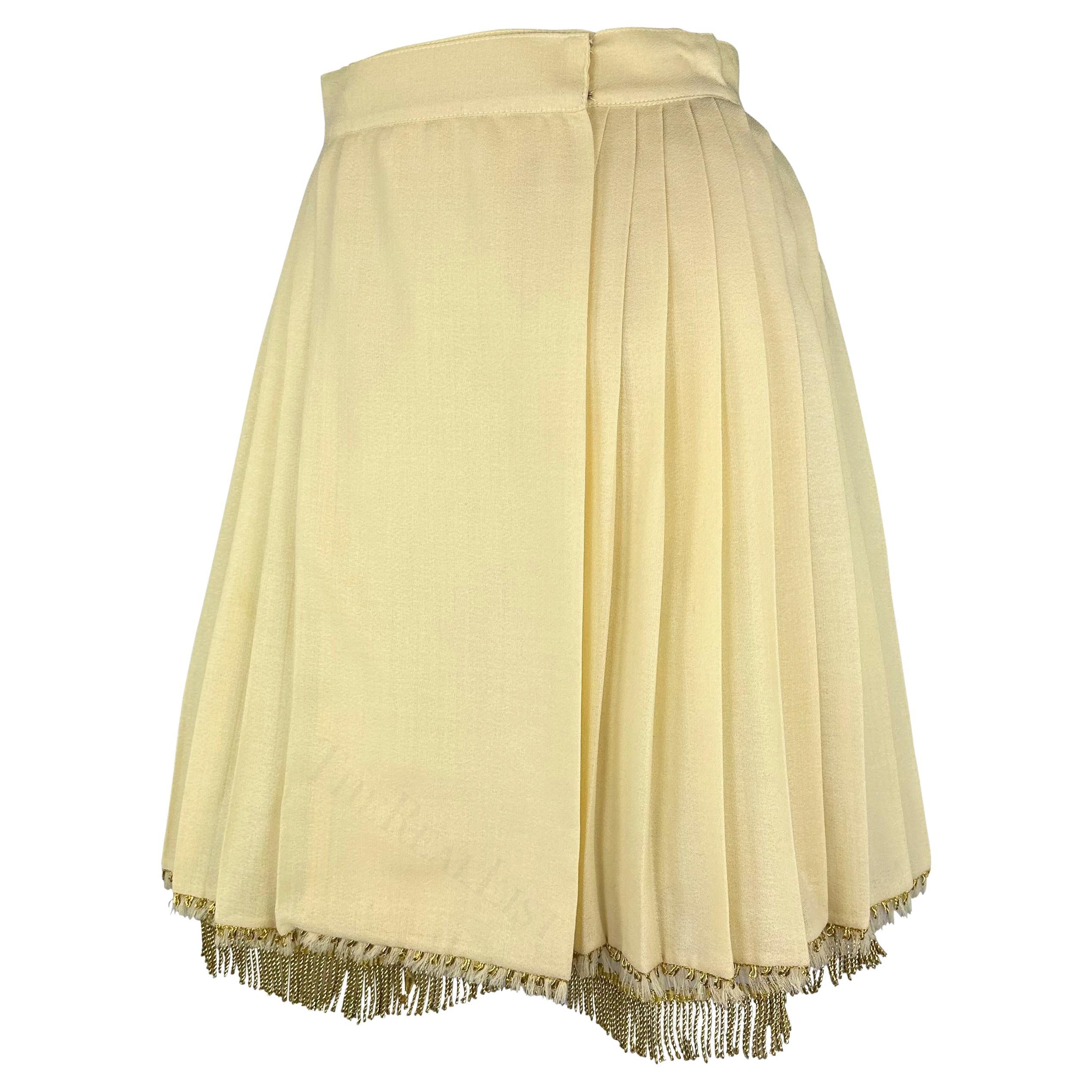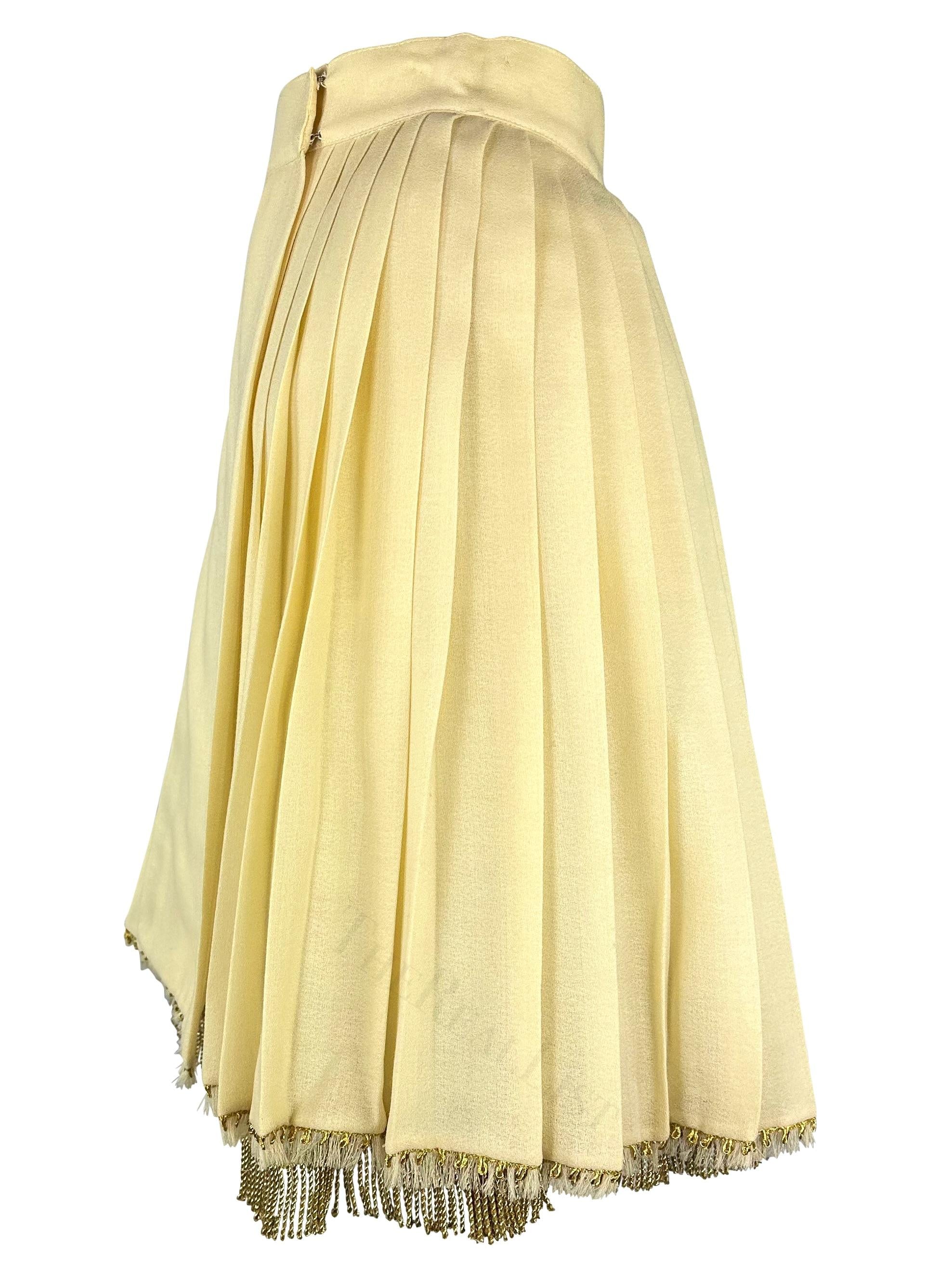 Presenting a rare skirt with its matching crinoline / petticoat underskirt designed by Gianni Versace for his Spring/Summer 1992 collection. This collection is remembered for. solidifying baroque and classical design elements are core to the house of Versace. The skirt itself is a lightweight pleated fabric that wraps around the waist. The structured mesh underskirt provides added volume to this flirty skirt and adds a peak of gold-tone fringe at the hemline. Follow our storefront for more archival Versace!