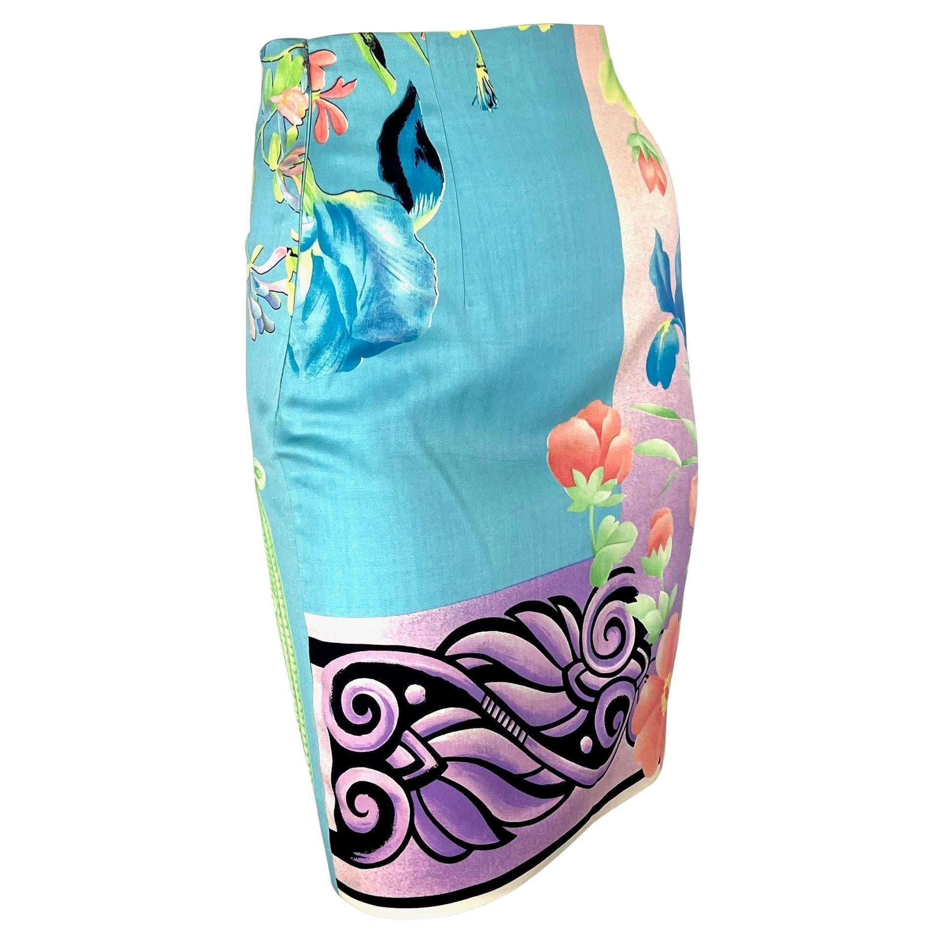 S/S 1992 Gianni Versace Couture Pastel Floral Mask Print Blue Pencil Skirt