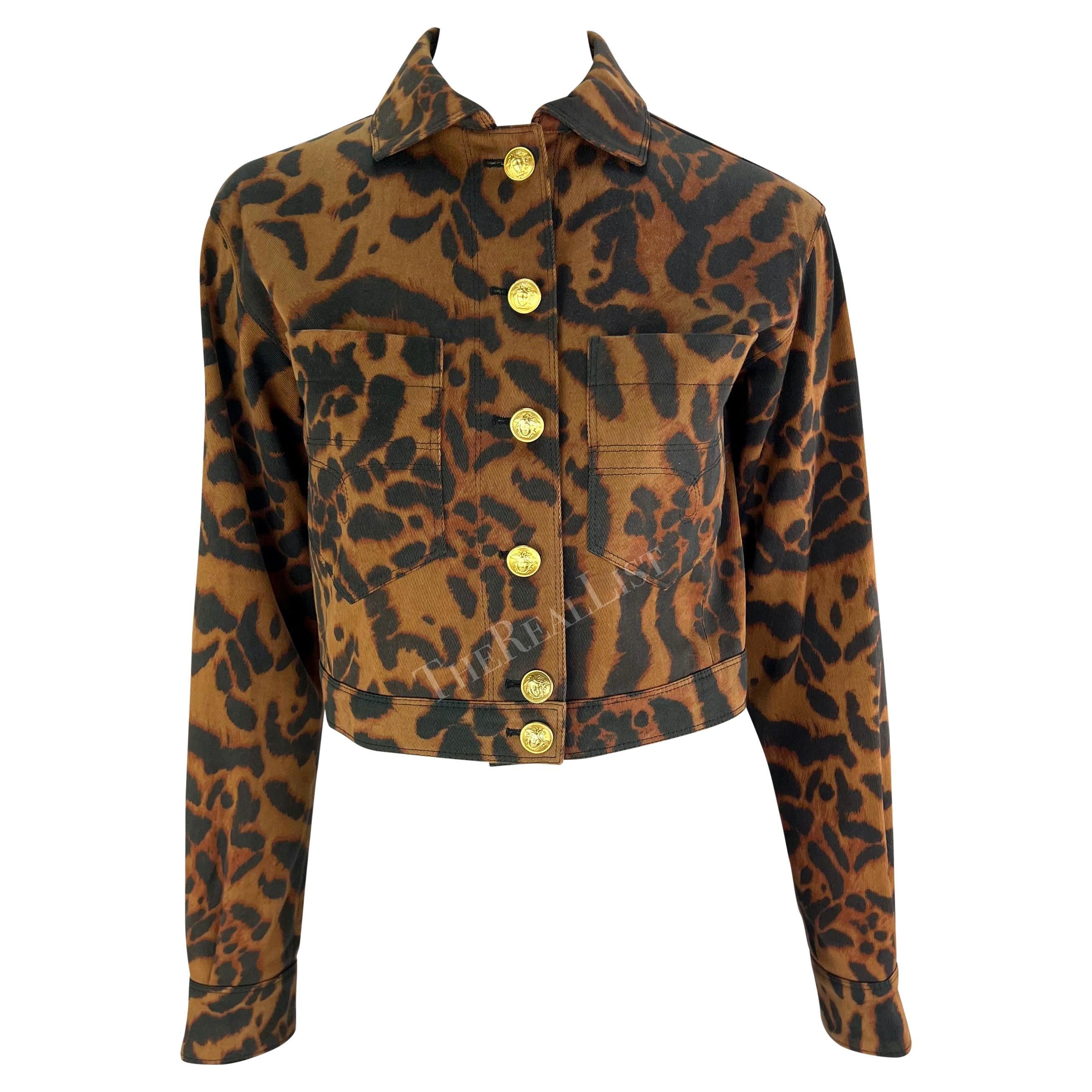 Presenting a fabulous brown Gianni Versace cropped jacket, designed by Gianni Versace. From the Spring/Summer 1992 collection, this jacket debuted on the season's runway as part of look 19, modeled by Linda Evangelista. Covered in a distinctive cheetah animal print, this jacket unmistakably embodies the signature style of Versace. Notably, it sports two sizable front pockets, secured by eye-catching gold metal Medusa buttons, mirroring the same opulent button design adorning the cuffs.