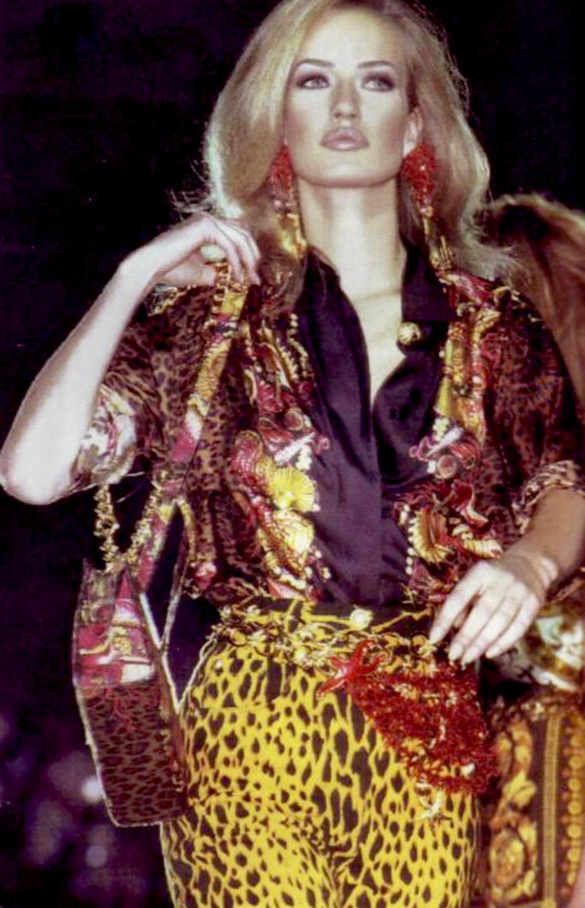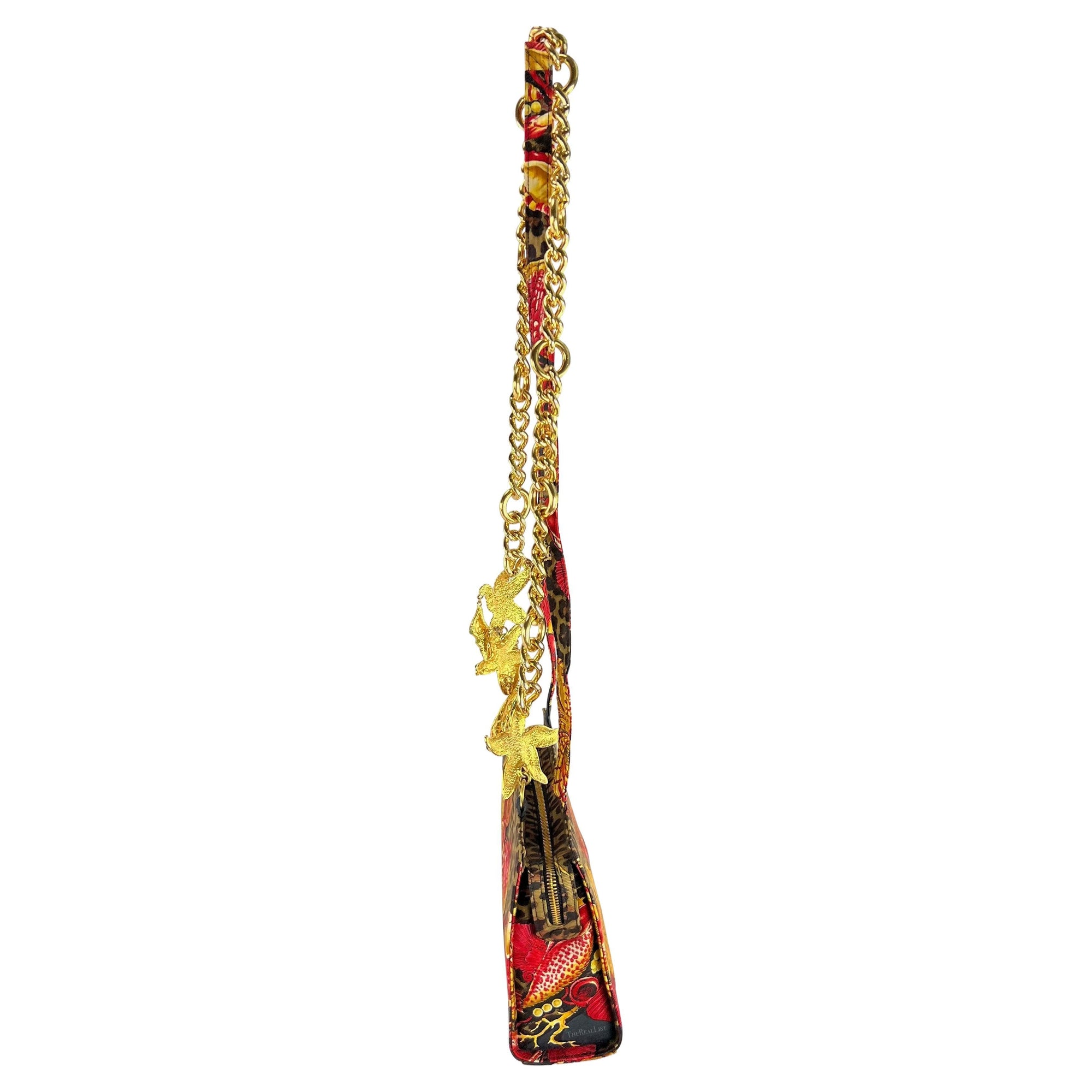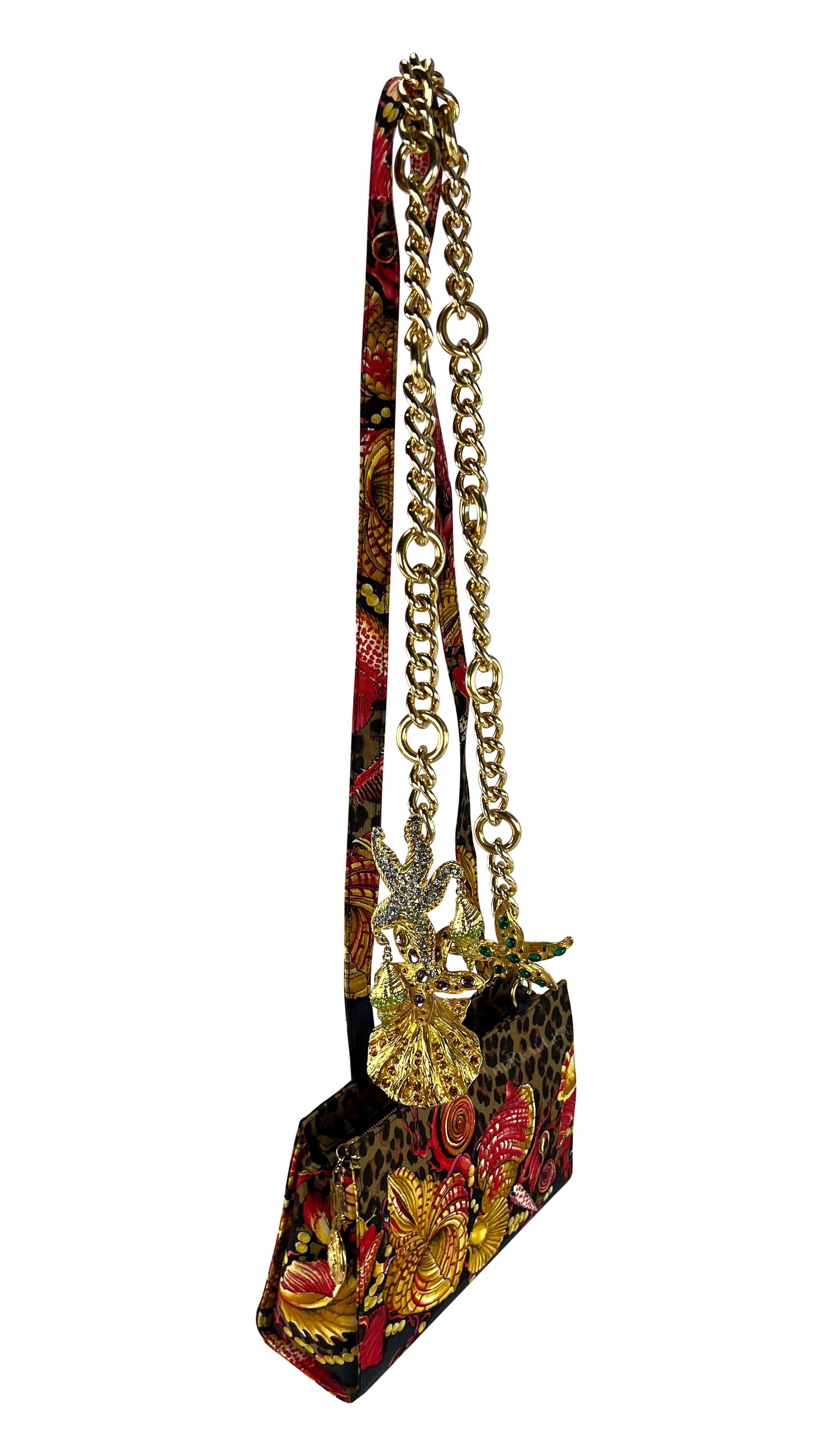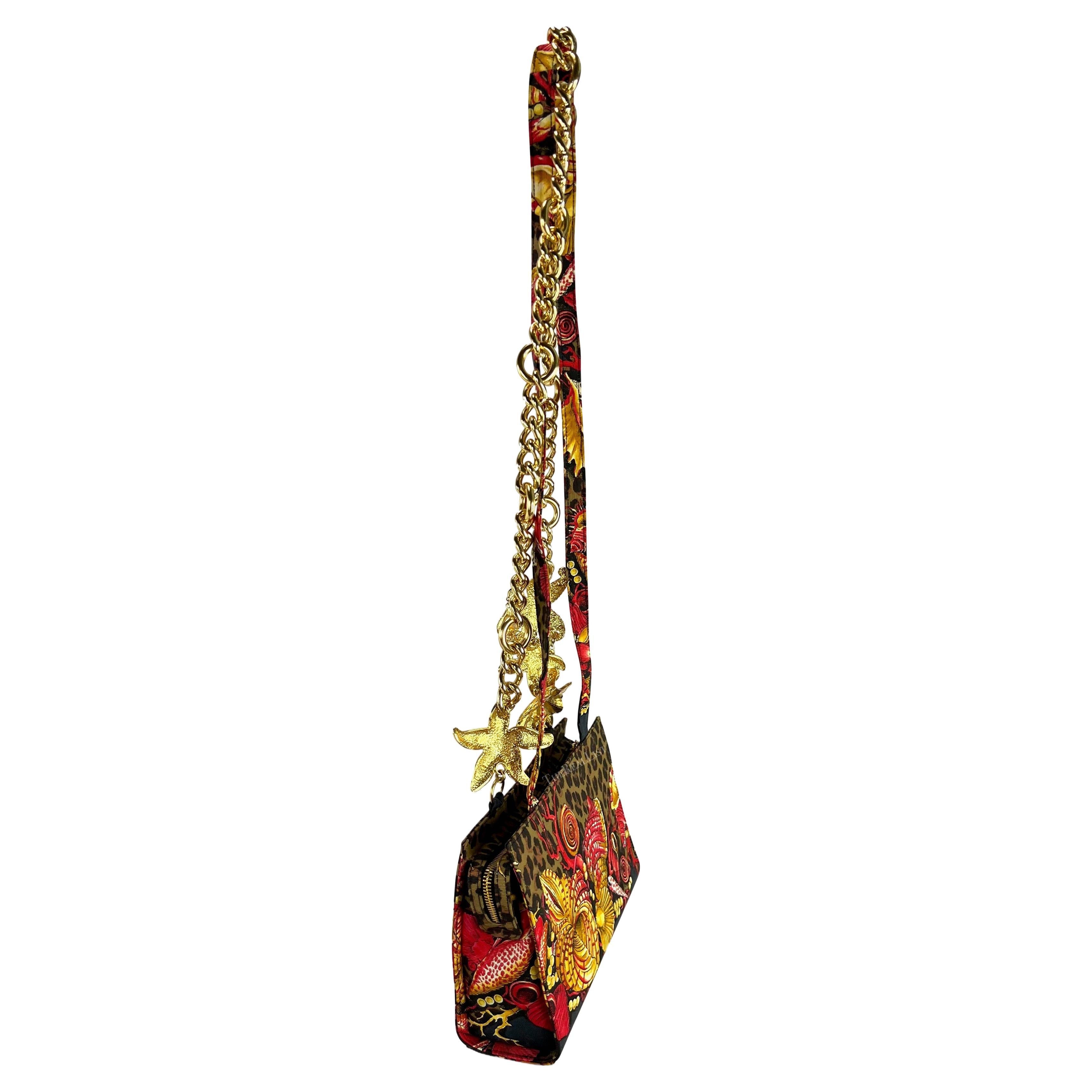 Presenting a truly incredible sea motif Gianni Versace shoulder bag, designed by Gianni Versace. From the Spring/Summer 1992 collection, this bag debuted on the season's runway as part of look 22, modeled by Karen Mulder. This canvas bag features a leopard print with a vibrant gold and red tone marine motif print atop. The structured bag is made complete with a gold-tone chain strap decorated with a large rhinestone-covered shell and starfish accents. An ultra-rare find, this Gianni Versace runway bag is a must-have addition to any Versace lover's collection!