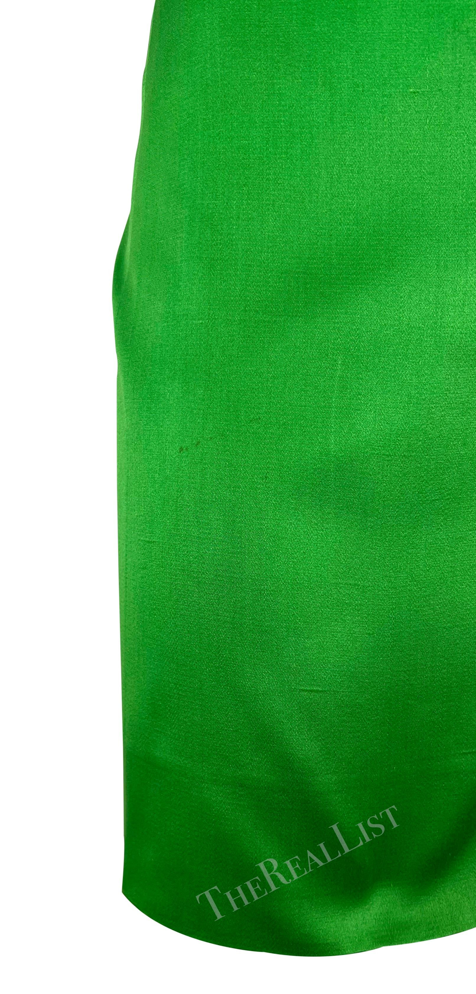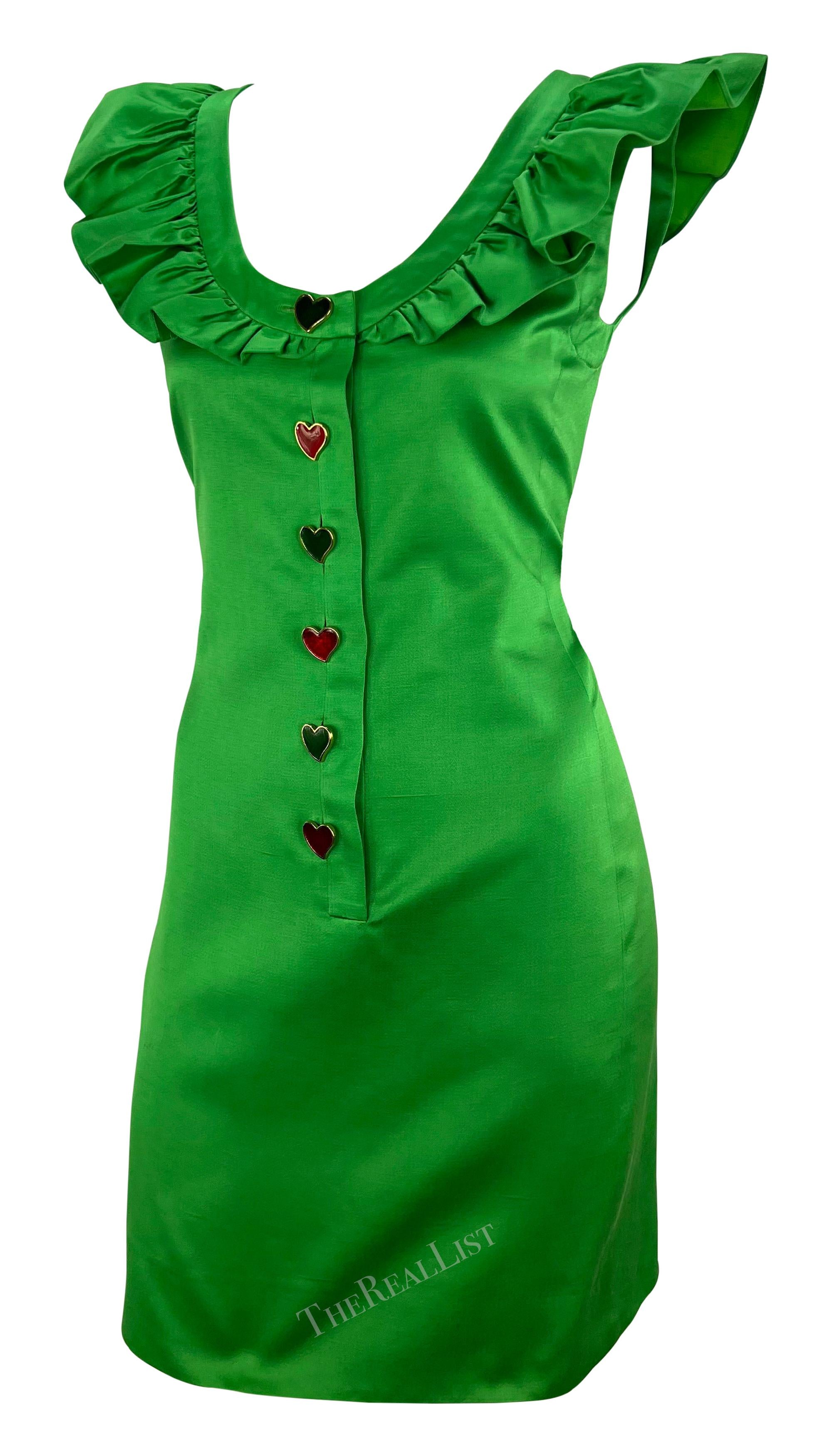 Presenting a fabulous bright green Yves Saint Laurent mini dress, designed by Yves Saint Laurent. From the Spring/Summer 1992 collection, this dress debuted on the season's runway in purple, on Tyra Banks, and in black. Karen Mulder wore the black version in the season's ad campaign, captured by Helmut Newton. This fitted sleeveless dress features a scoop neckline accented with ruffles around the neck. The mini dress is amped up with a button-down closure that runs down to the hips, adorned with alternating green and red enamel heart buttons. This YSL dress is a perfectly bright and girly addition to any wardrobe.