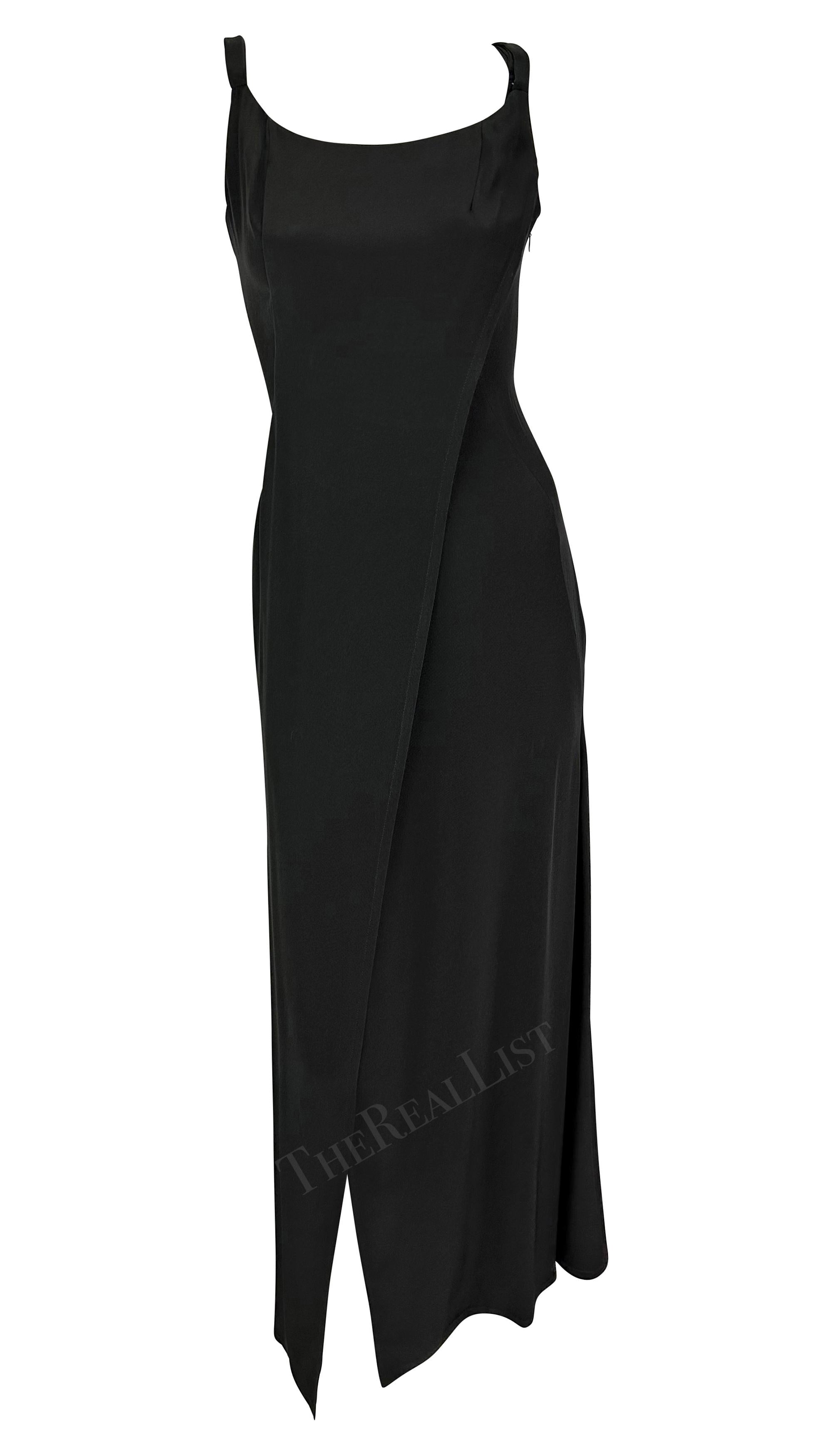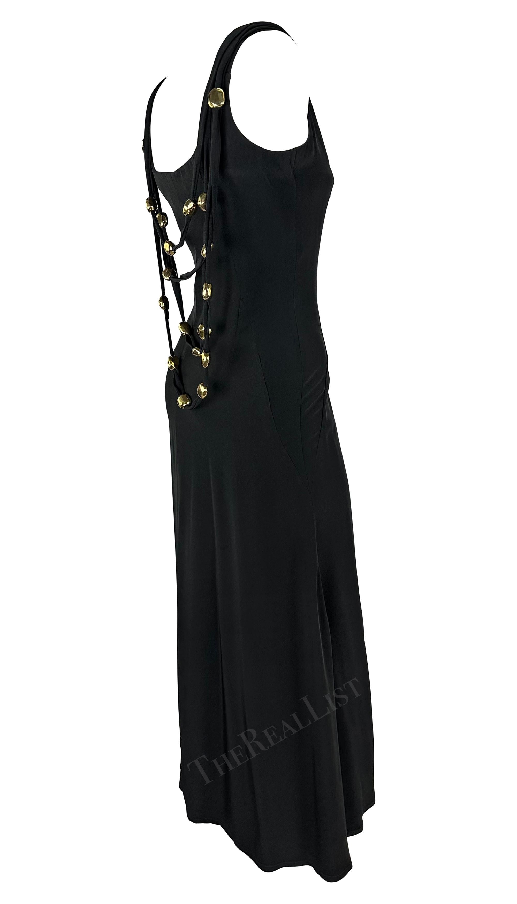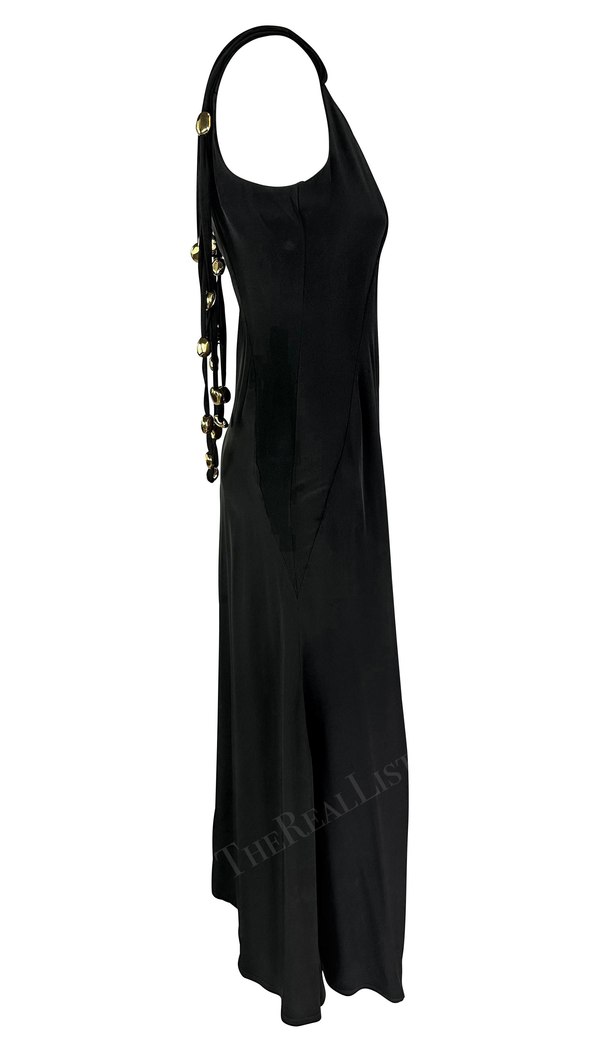 This black Christian Lacroix slip gown from the Spring/Summer 1993 collection debuted on the season’s runway, modeled by Yasmin Ghauri in a red variation. The floor-length gown features a sleeveless silhouette with a scoop neckline, a wrap accent at the front, and trailing fabric strands finished with sculptural gold-tone beads.