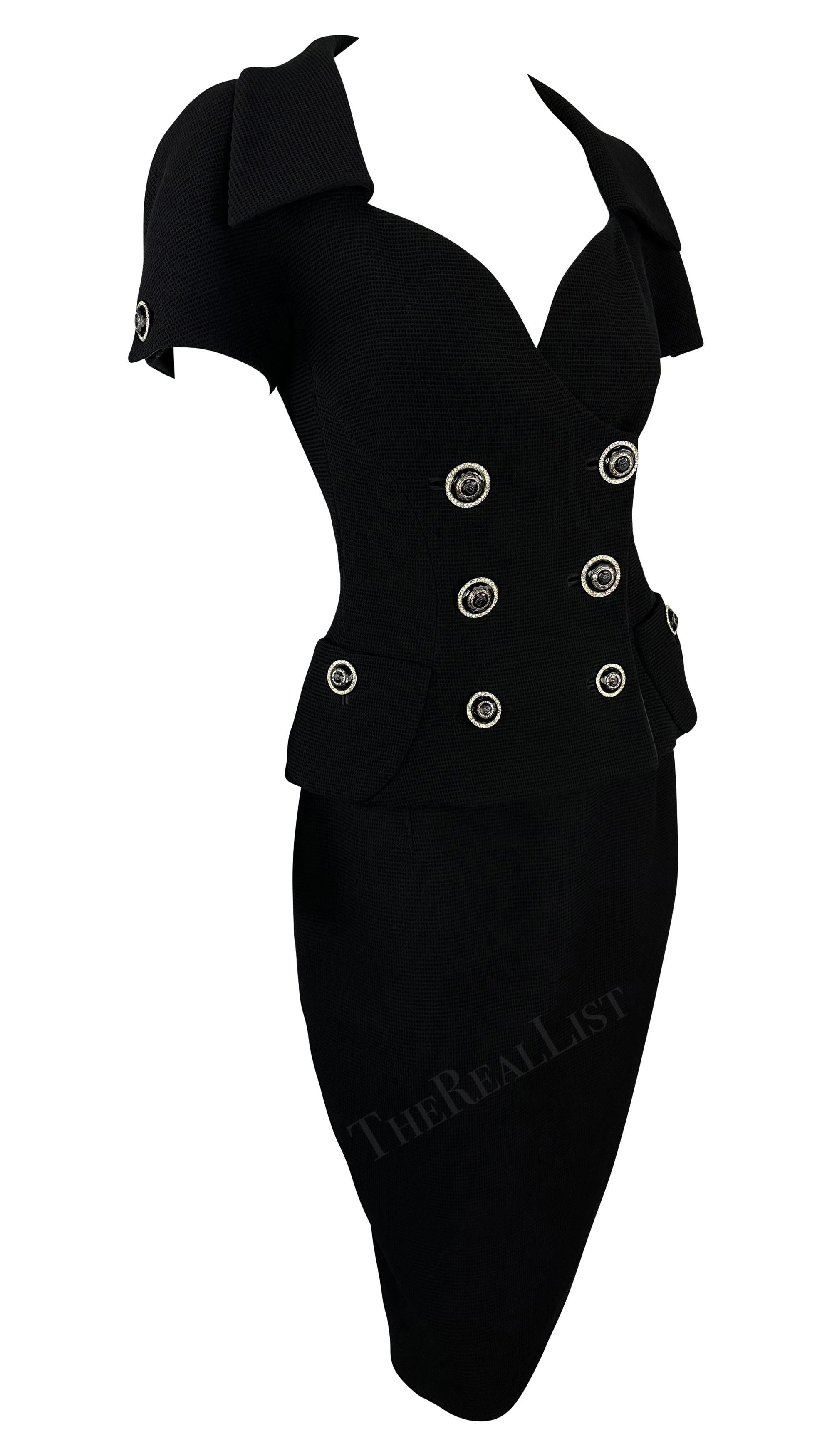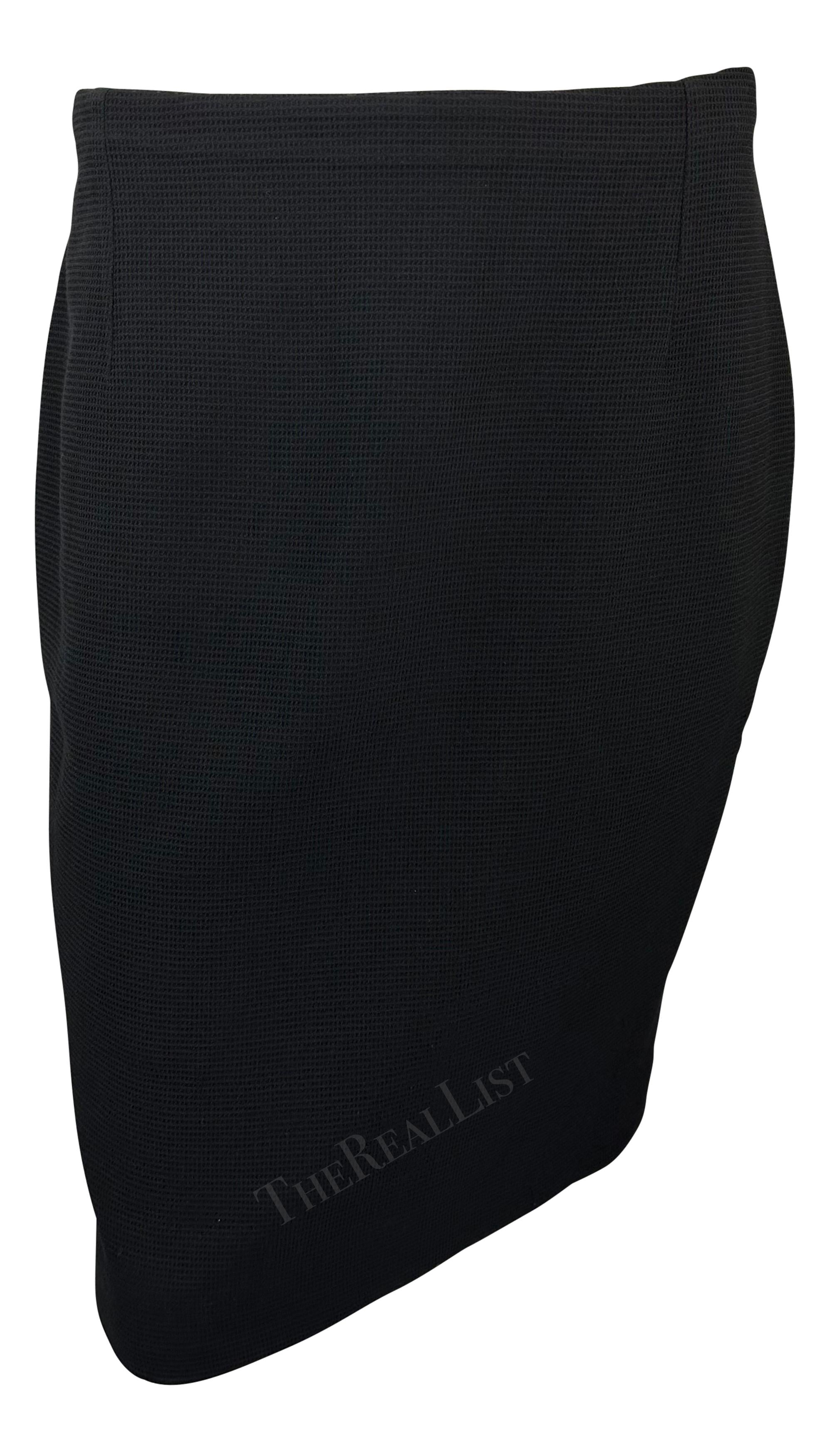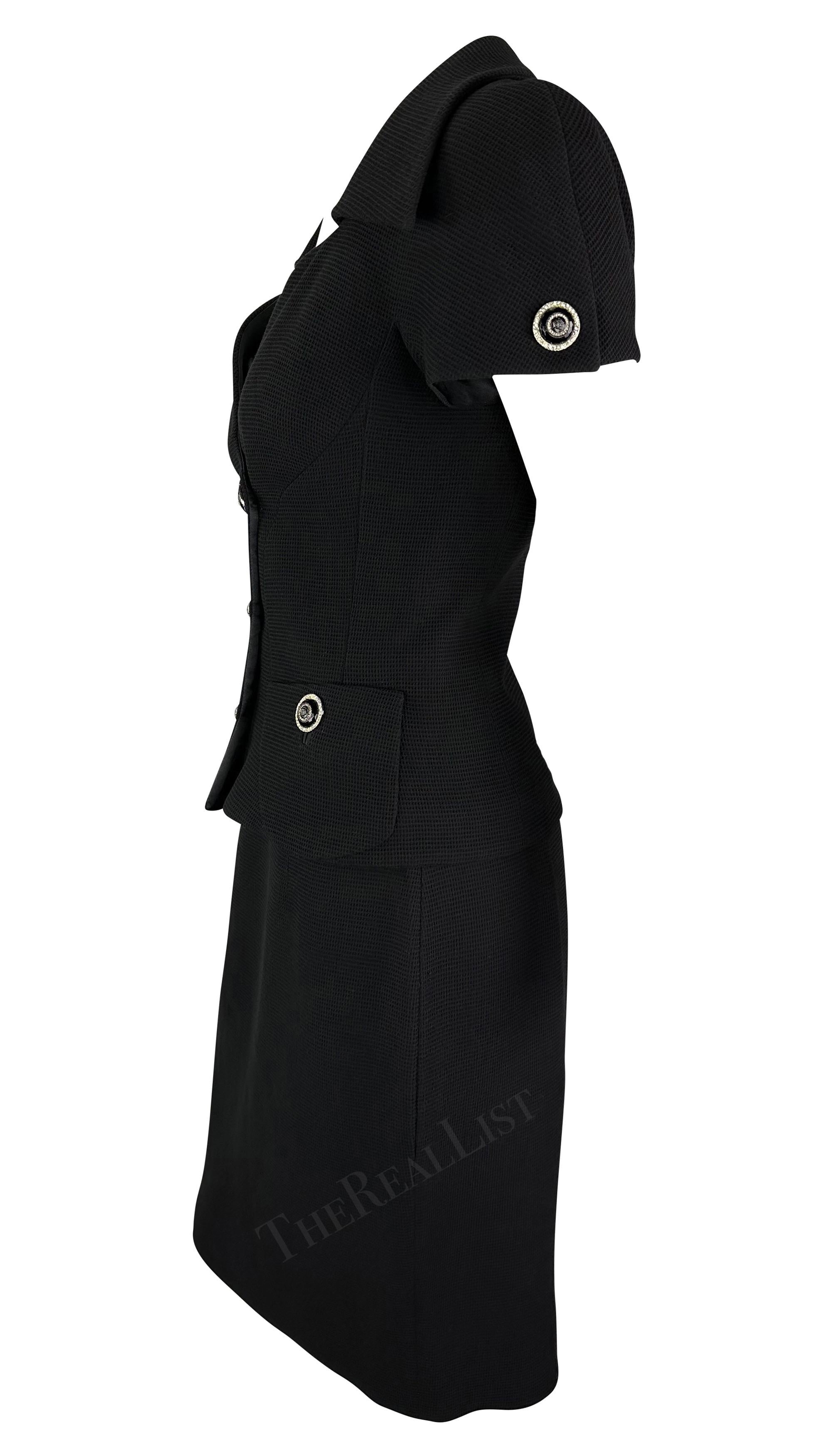 Presenting a fabulous black waffle knit Gianni Versace skirt suit designed by Gianni Versace. From the Spring/Summer 1993 collection, this skirt suit consists of a short-sleeved blazer and matching pencil skirt. The blazer features a double-breasted button closure featuring large silver-tone Versace Medusa relief rhinestone accented buttons; the same buttons are fastened at the hip pockets and arms. This fitted jacket is made complete with a sweetheart neckline and a sizeable foldover collar. The matching skirt is constructed of the same waffle knit and, like the blazer, perfectly morphs into the body. Add this chic warm-weather skirt suit to your fashion arsenal!