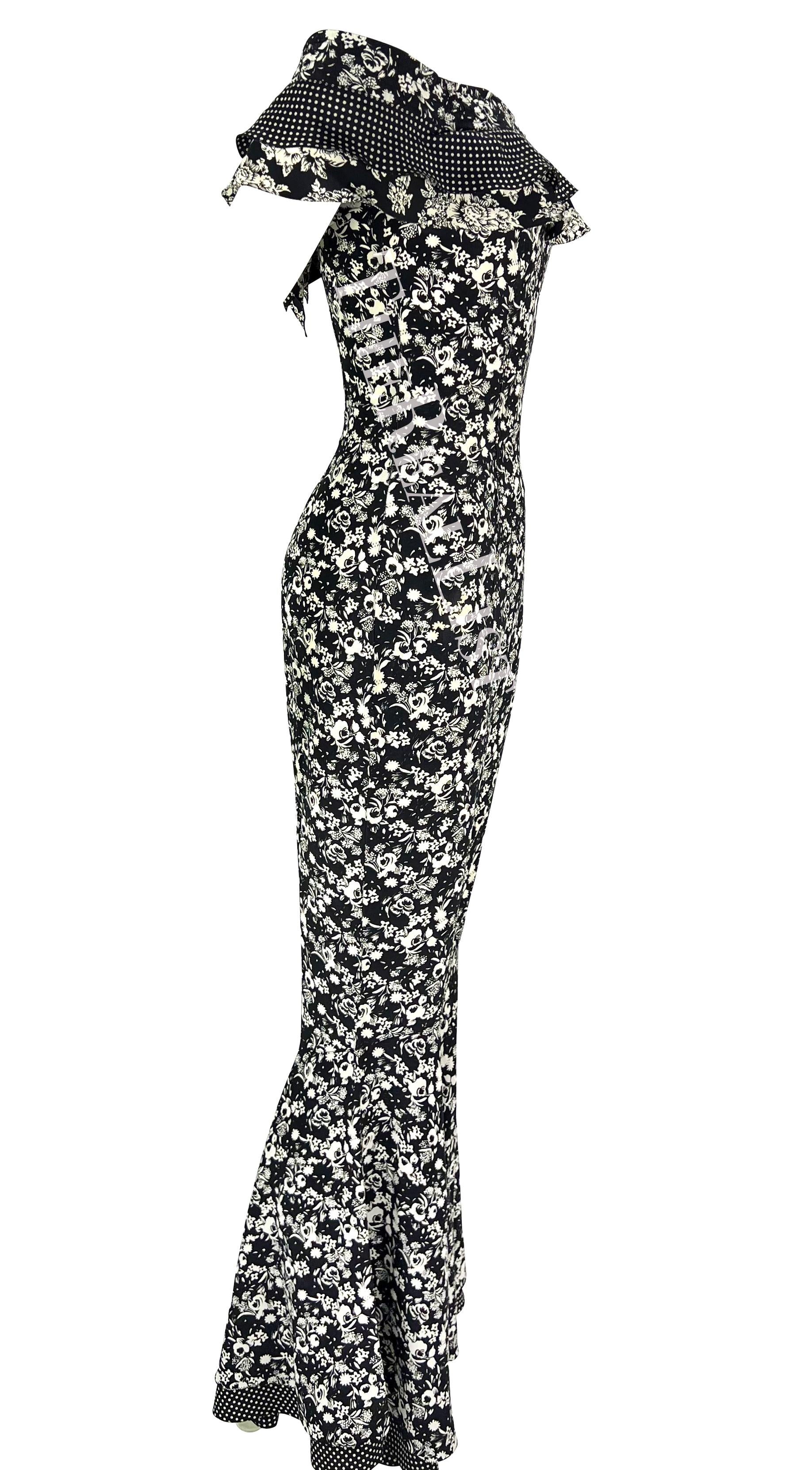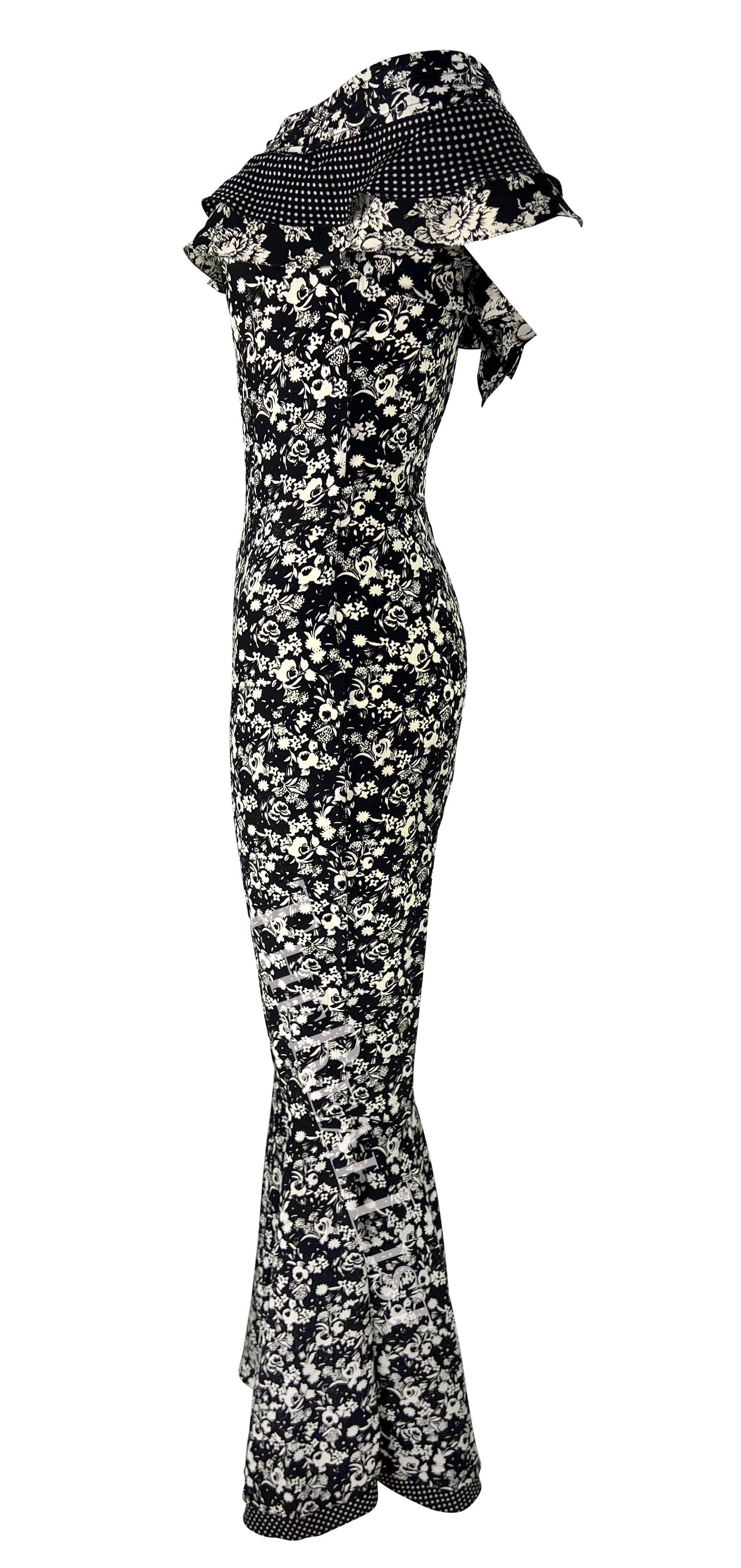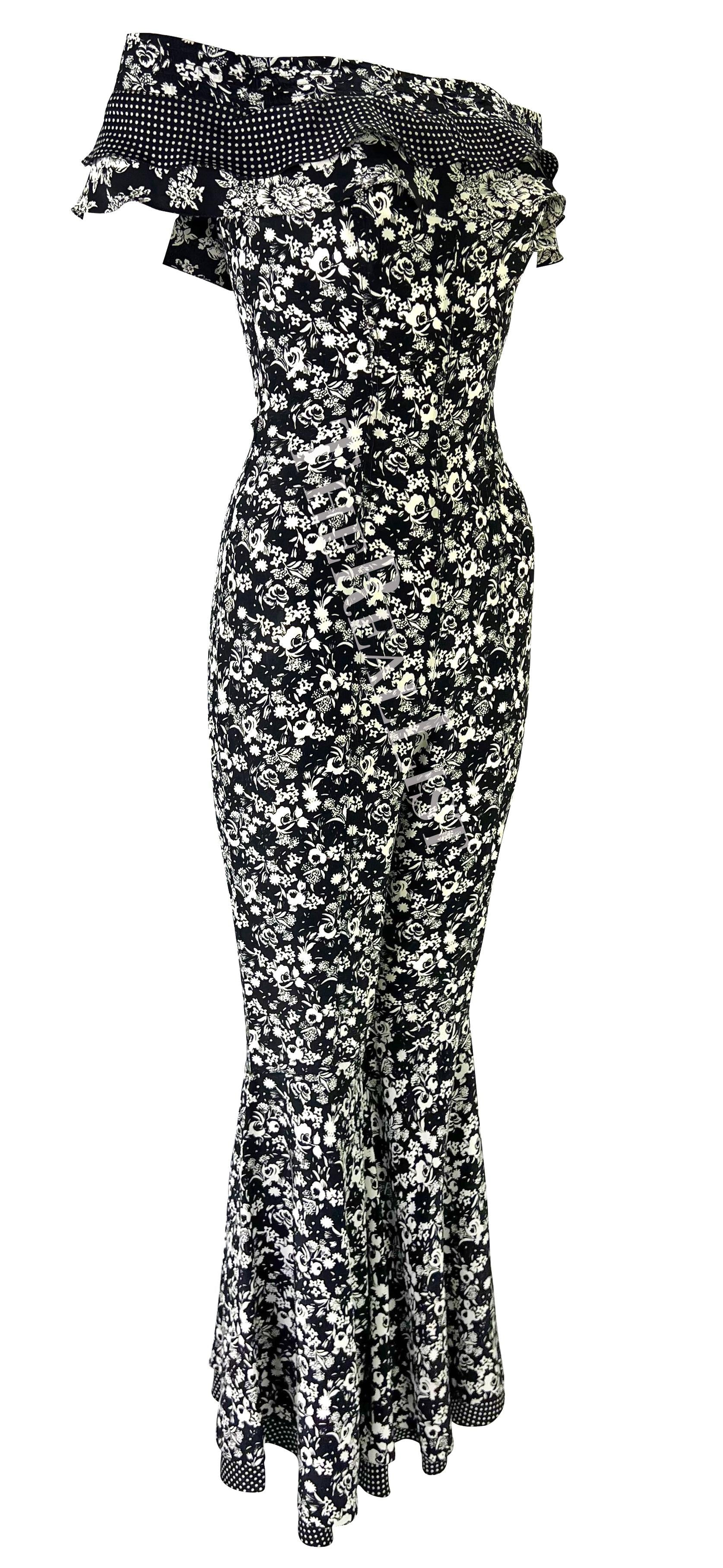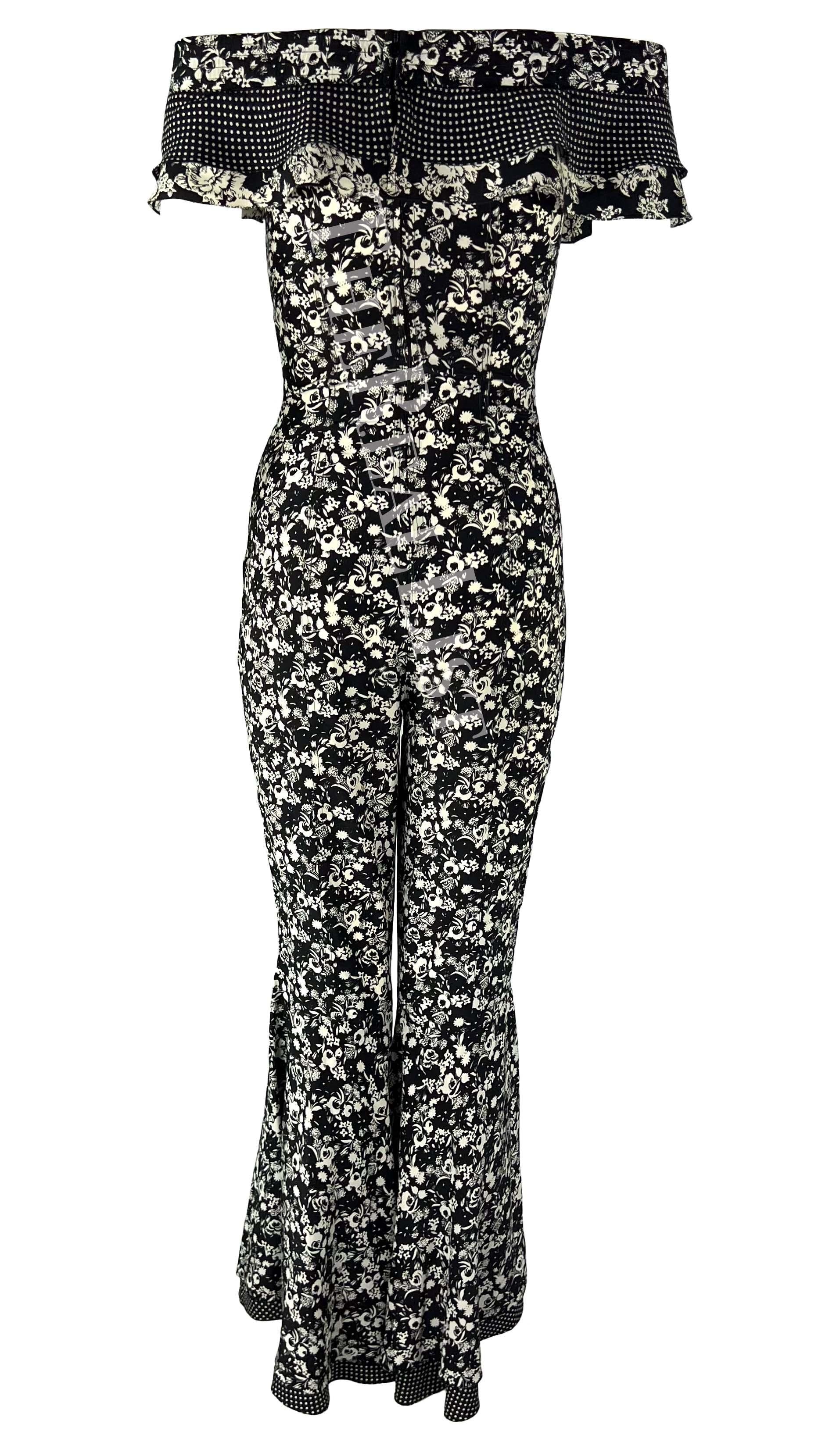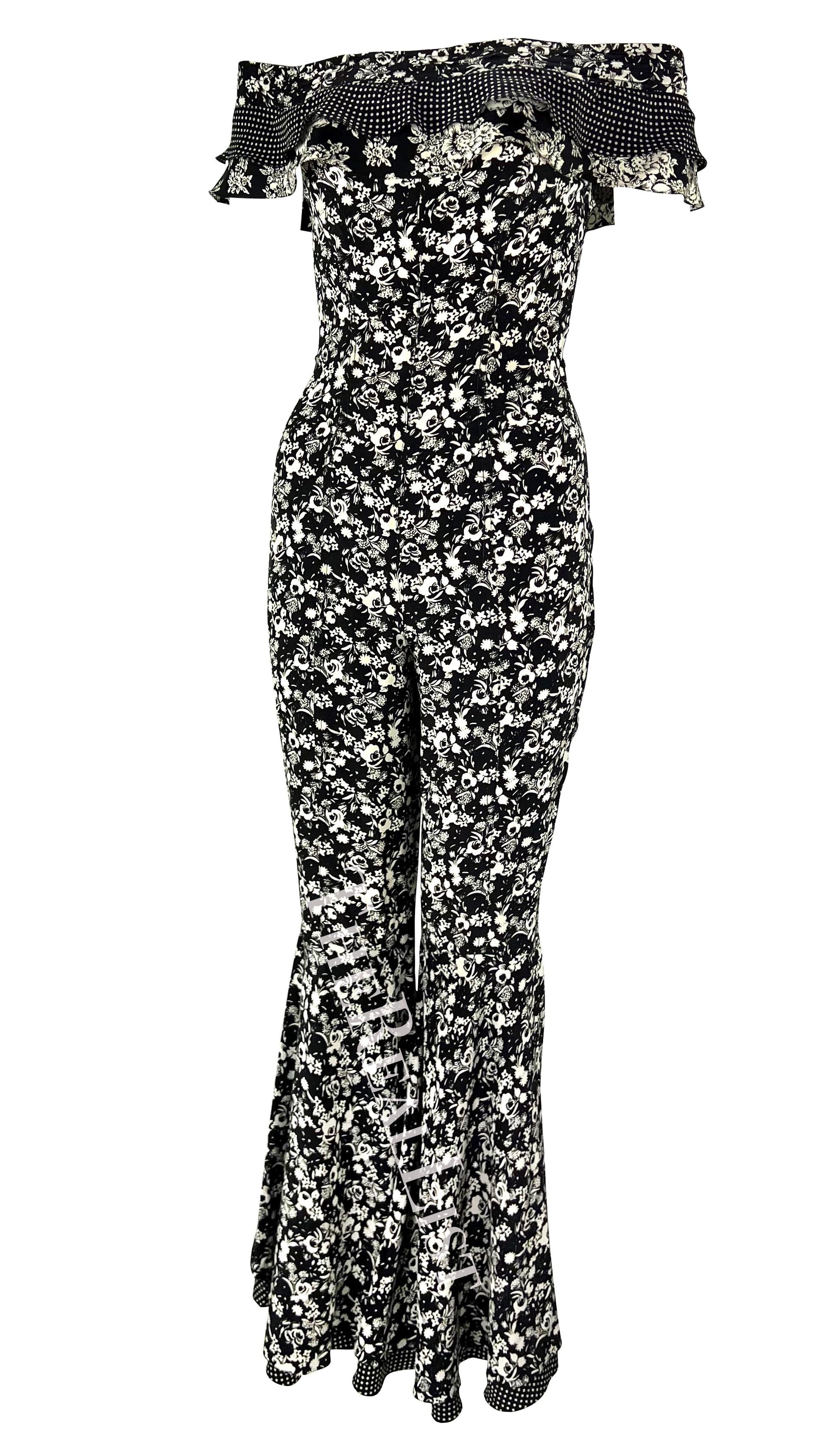 Presenting an incredible black and white floral Gianni Versace jumpsuit designed by Gianni Versace. From the Spring/Summer 1993 collection, this bohemian-inspired catsuit is covered in a black and white floral print that debuted on the season's runway. The ensemble features off-the-shoulder ruffle sleeves and a flare-cut leg. Truly a rare find, this sexy jumpsuit is the perfect addition to any Gianni Versace lover's collection or wardrobe.