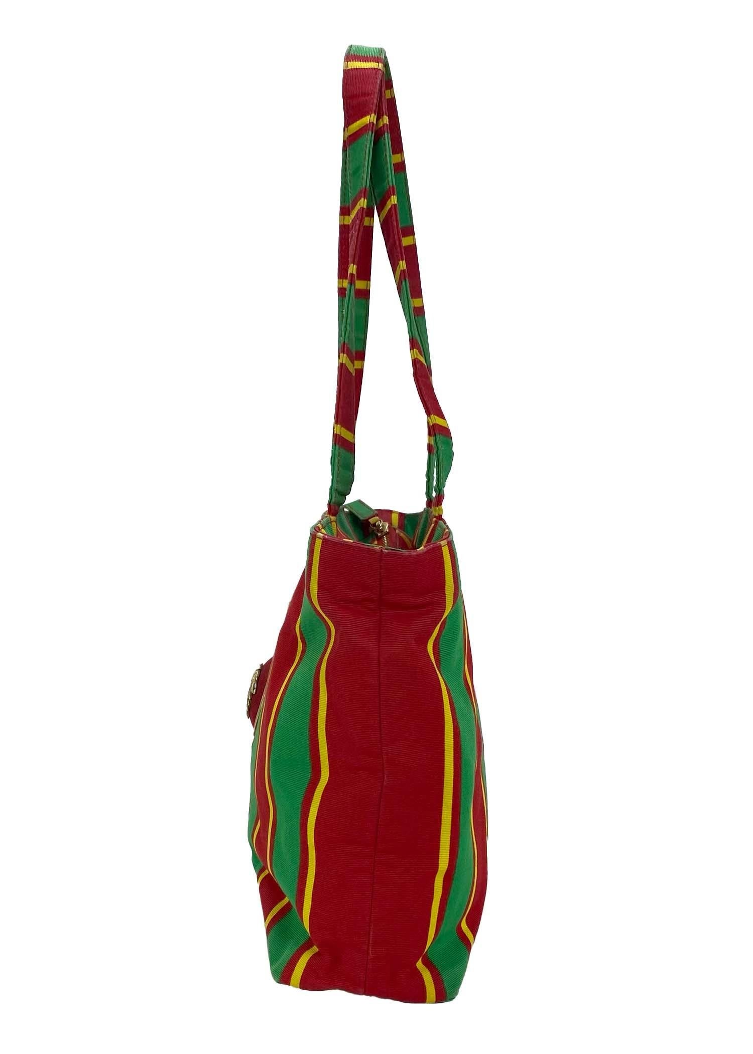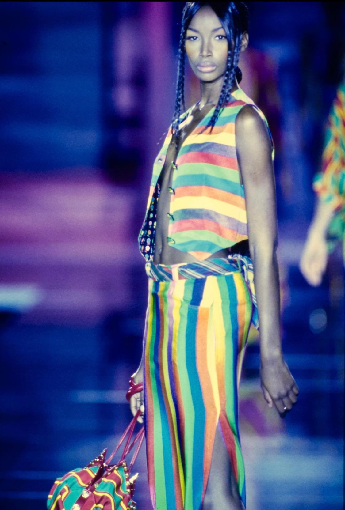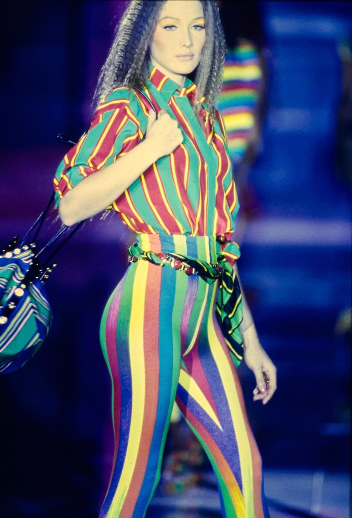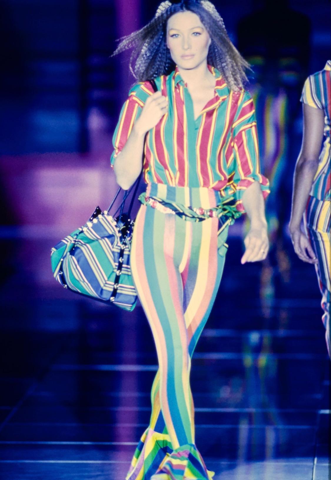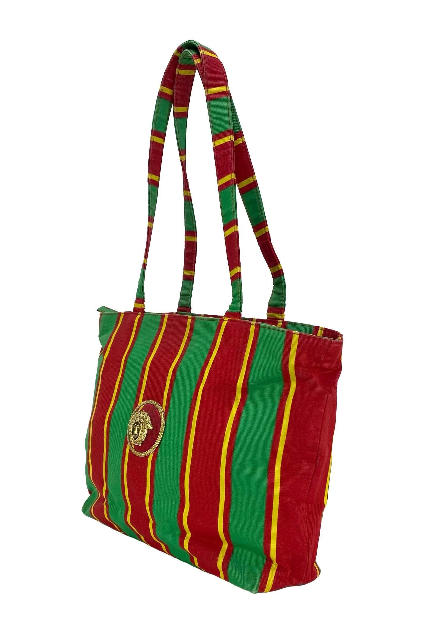 Presenting an iconic runway Gianni Versace Couture tote designed by Gianni Versace. From the Spring/Summer 1993 collection, the bag's bold stripe print was used on the runway in multiple looks, including number 59, modeled by Carla Bruni, and number 60, modeled by Beverly Pelle. Constructed of canvas, this stunning tote proudly features a gold Medusa logo in the middle of the bag. This tote is the perfect vintage runway piece and a must-have!