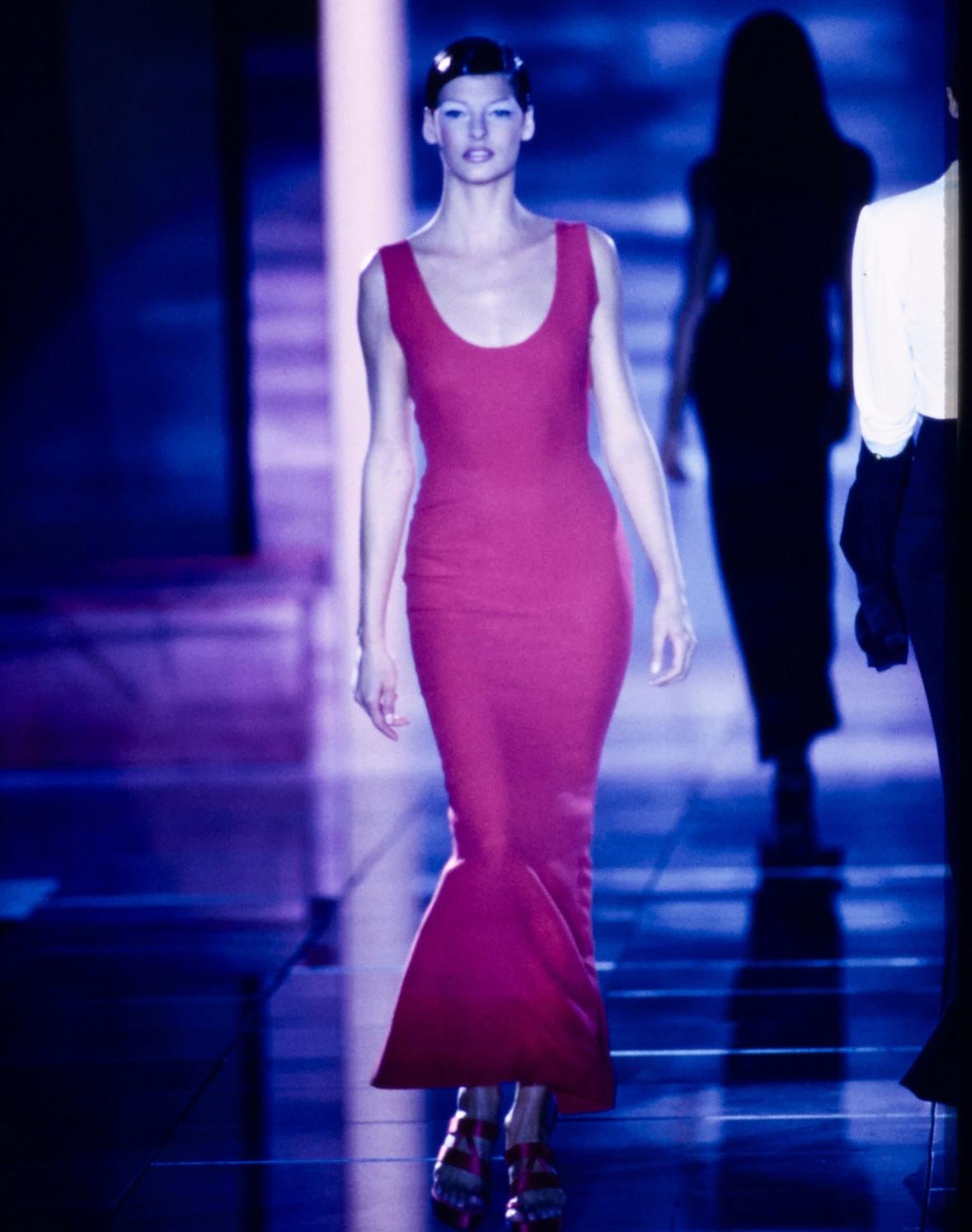Presenting a fabulous vibrant red maxi dress by Gianni Versace, designed by the Gianni Versace for the Spring/Summer 1993 collection. This dress made its debut on the season's runway, showcased by Linda Evangelista.. The dress was also highlighted in the season's ad campaign, modeled by Kristen McMenamy and captured by Richard Avedon. This alluring minimalist maxi dress falls just below the calf. It boasts a scoop neckline and a deep V-cut at the back, revealing the back. Add this documented Gianni Versace dress to your wardrobe or collection.