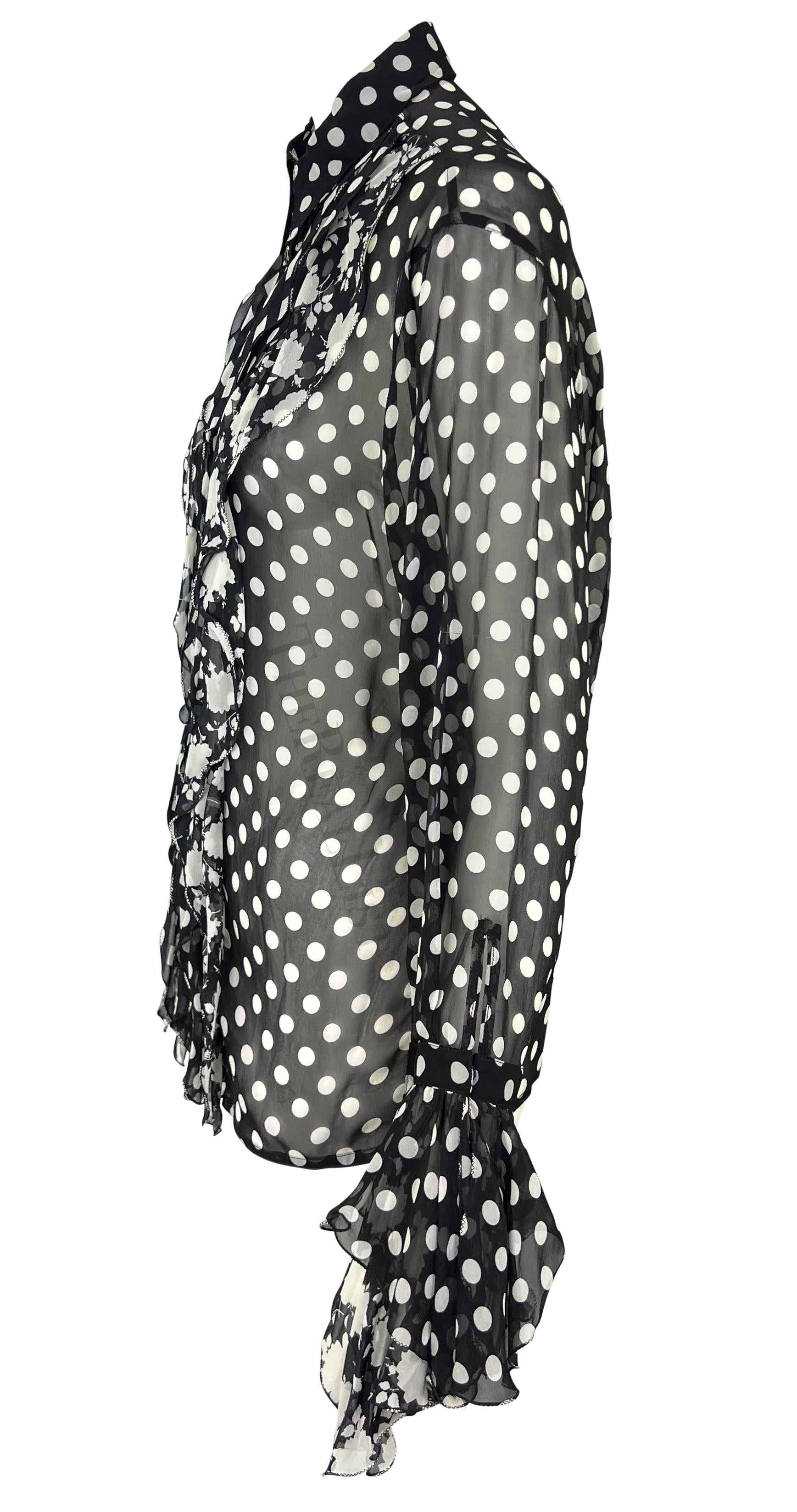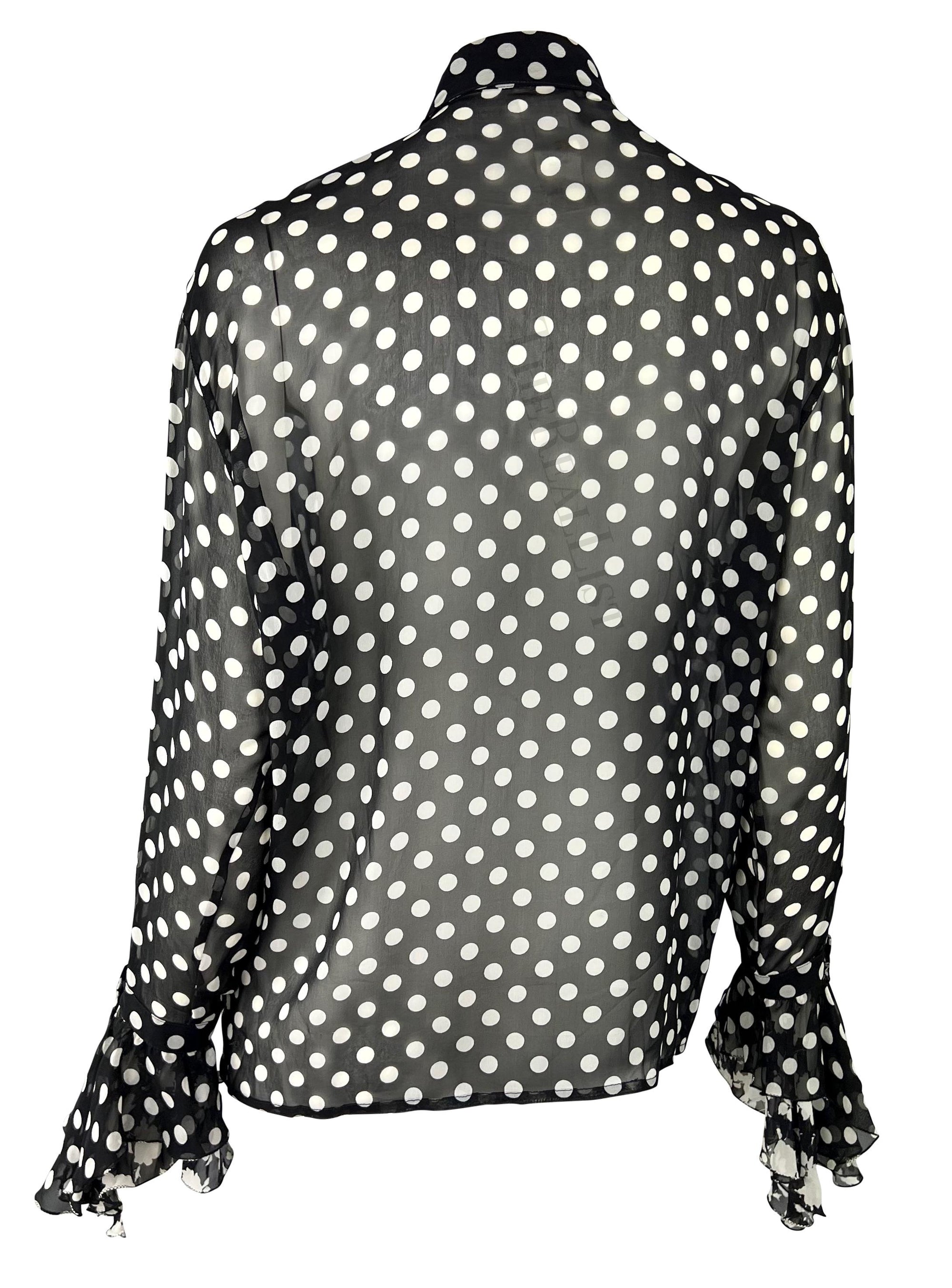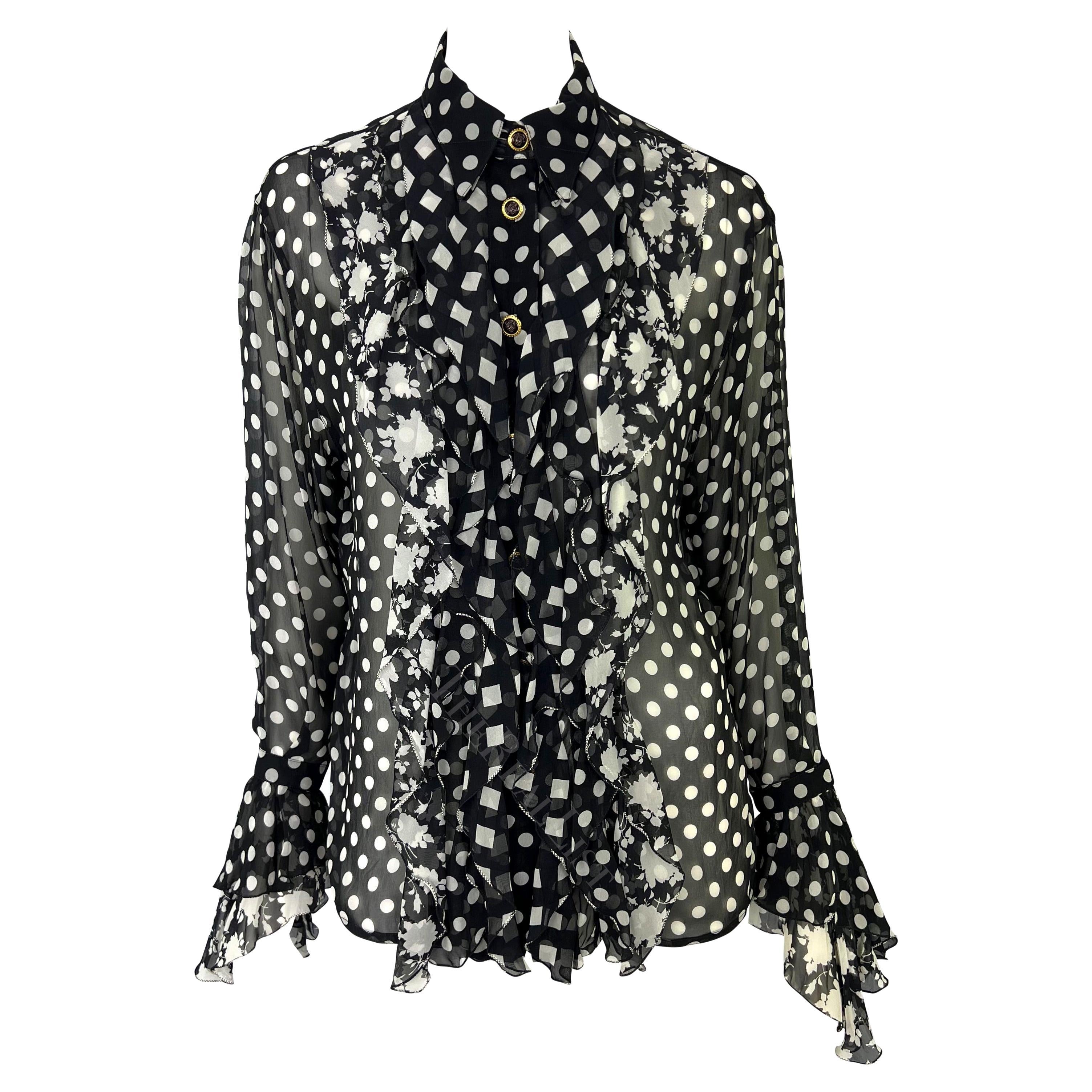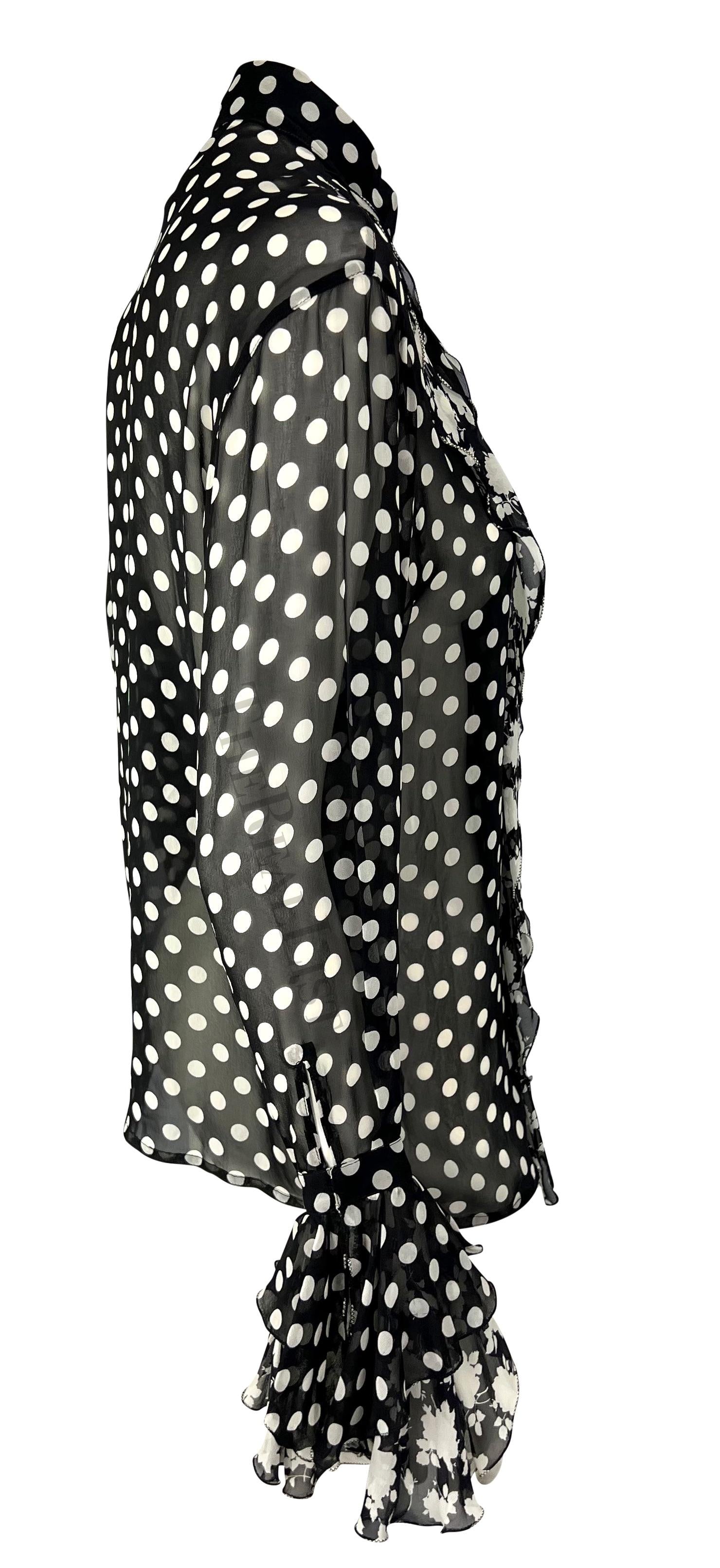 S/S 1993 Gianni Versace Runway Black White Sheer Polka Dot Floral Ruffle Button Up Top
