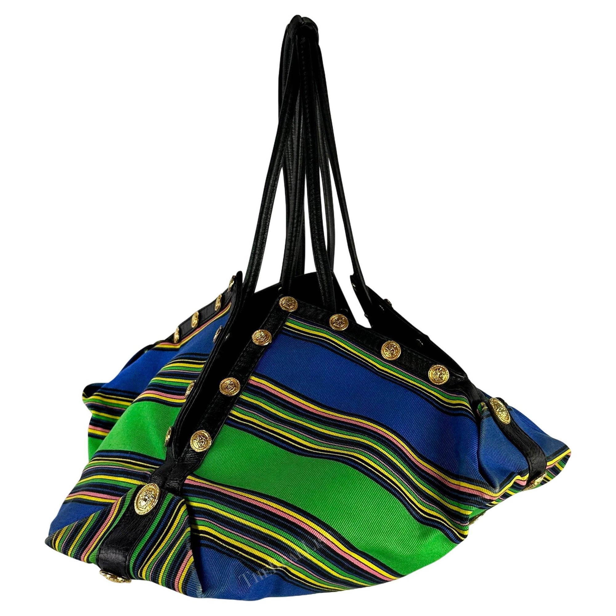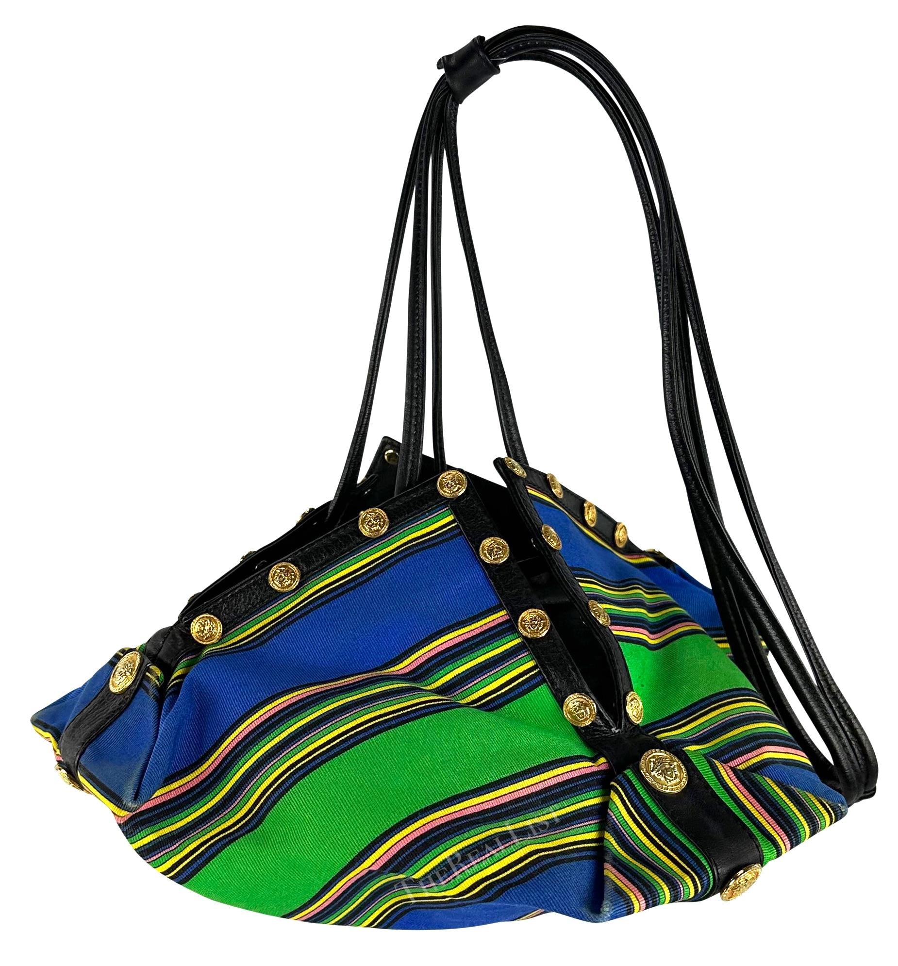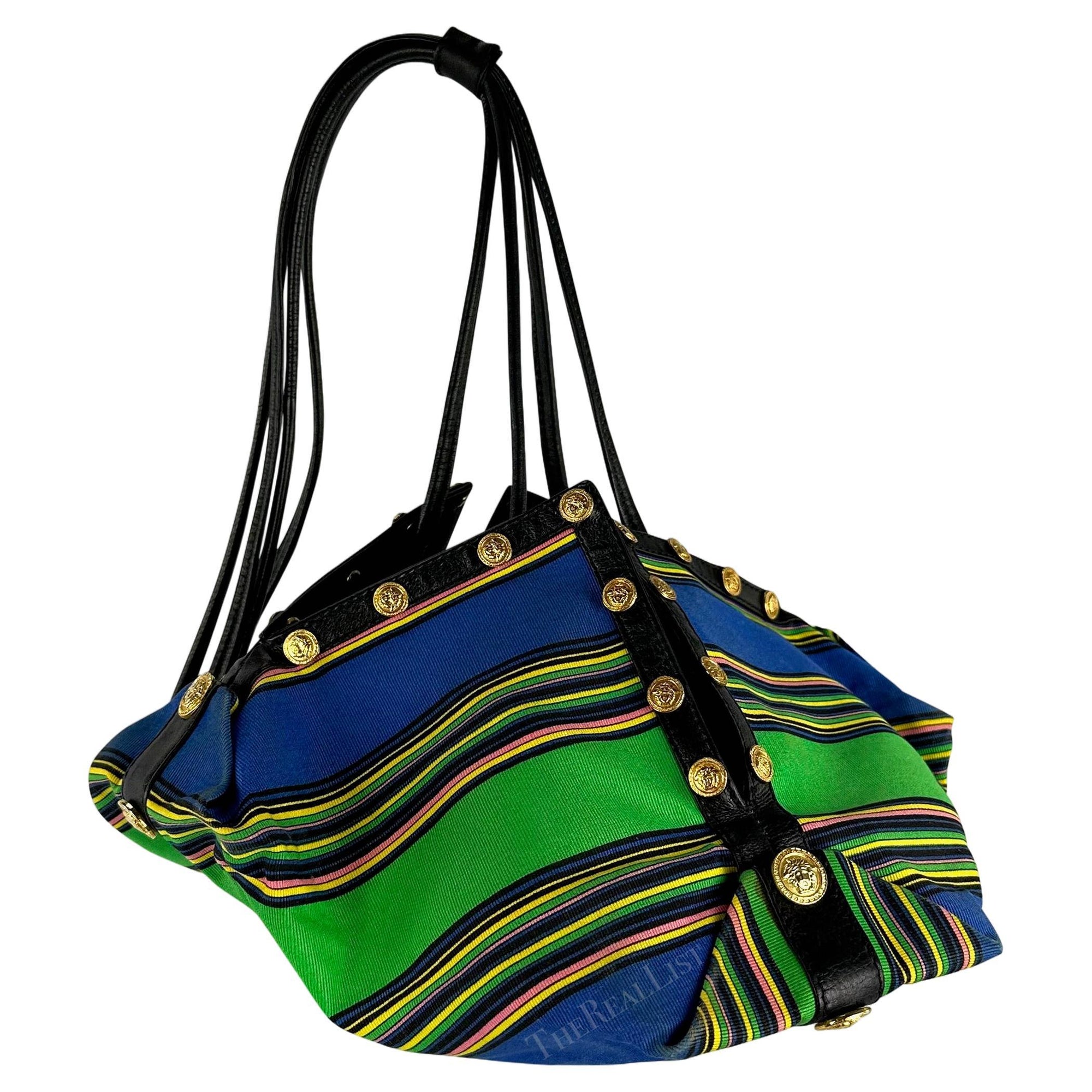 Presenting a green and blue canvas Gianni Versace drawstring bag designed by Gianni Versace. Part of the Spring/Summer 1993 collection, this bag made its runway debut as part of look 59, modeled by Carla Bruni. This vibrant bag features a colorful striped canvas base with black leather accents. Covered in small gold-tone Versace Medusa reliefs, this vintage runway bag comes complete with the original brand tags still attached.