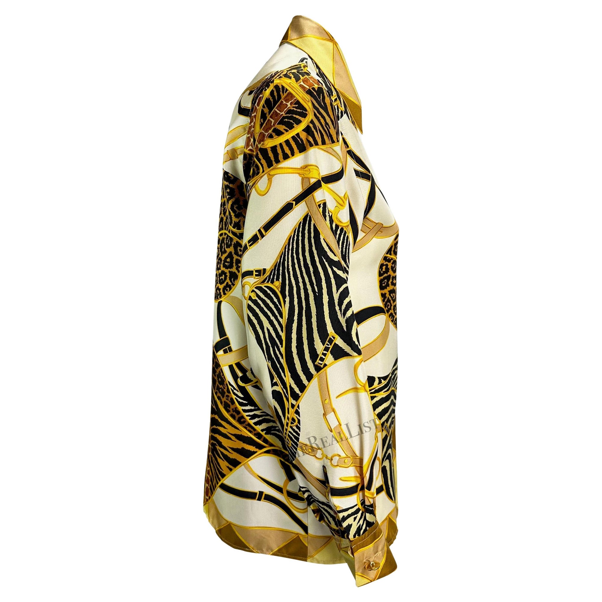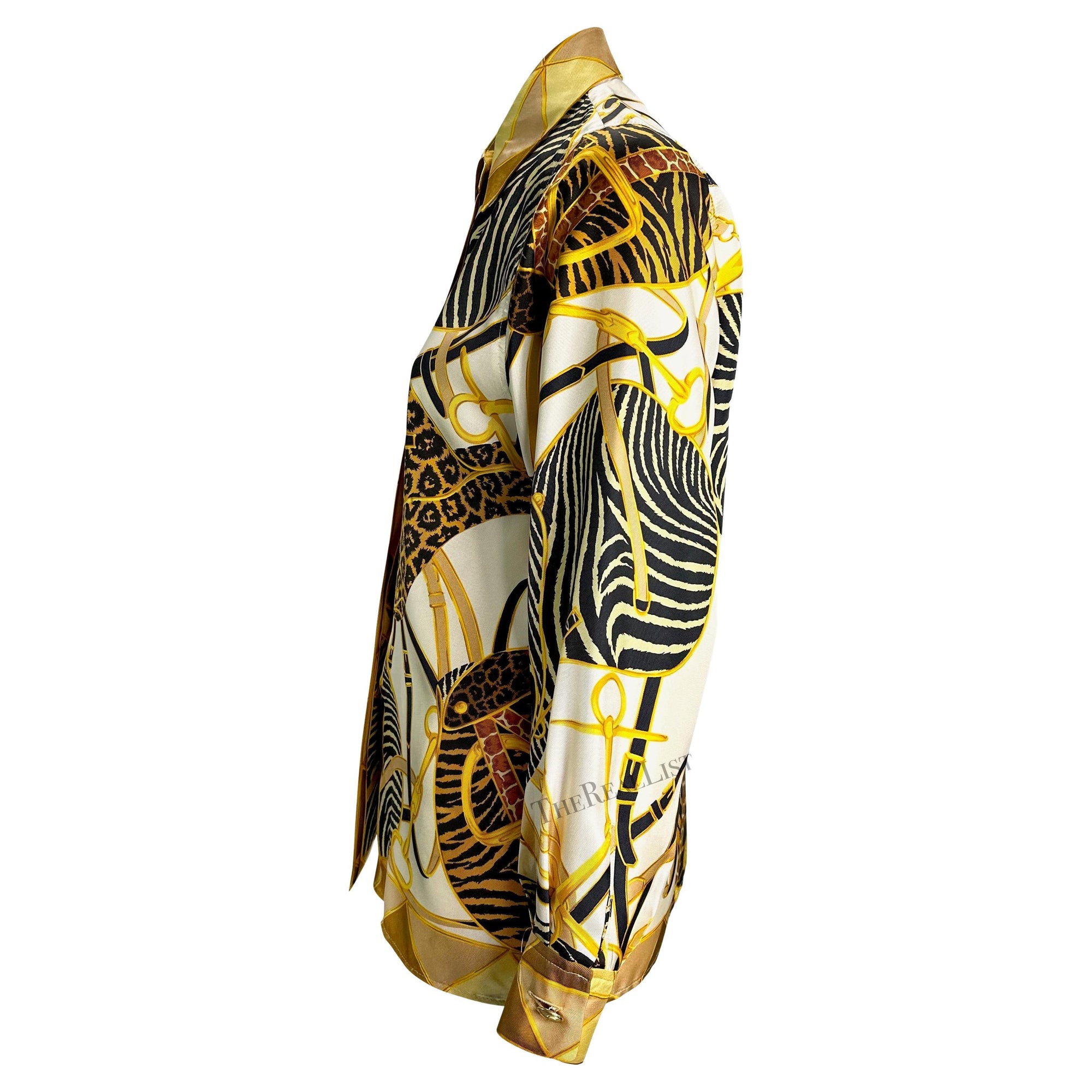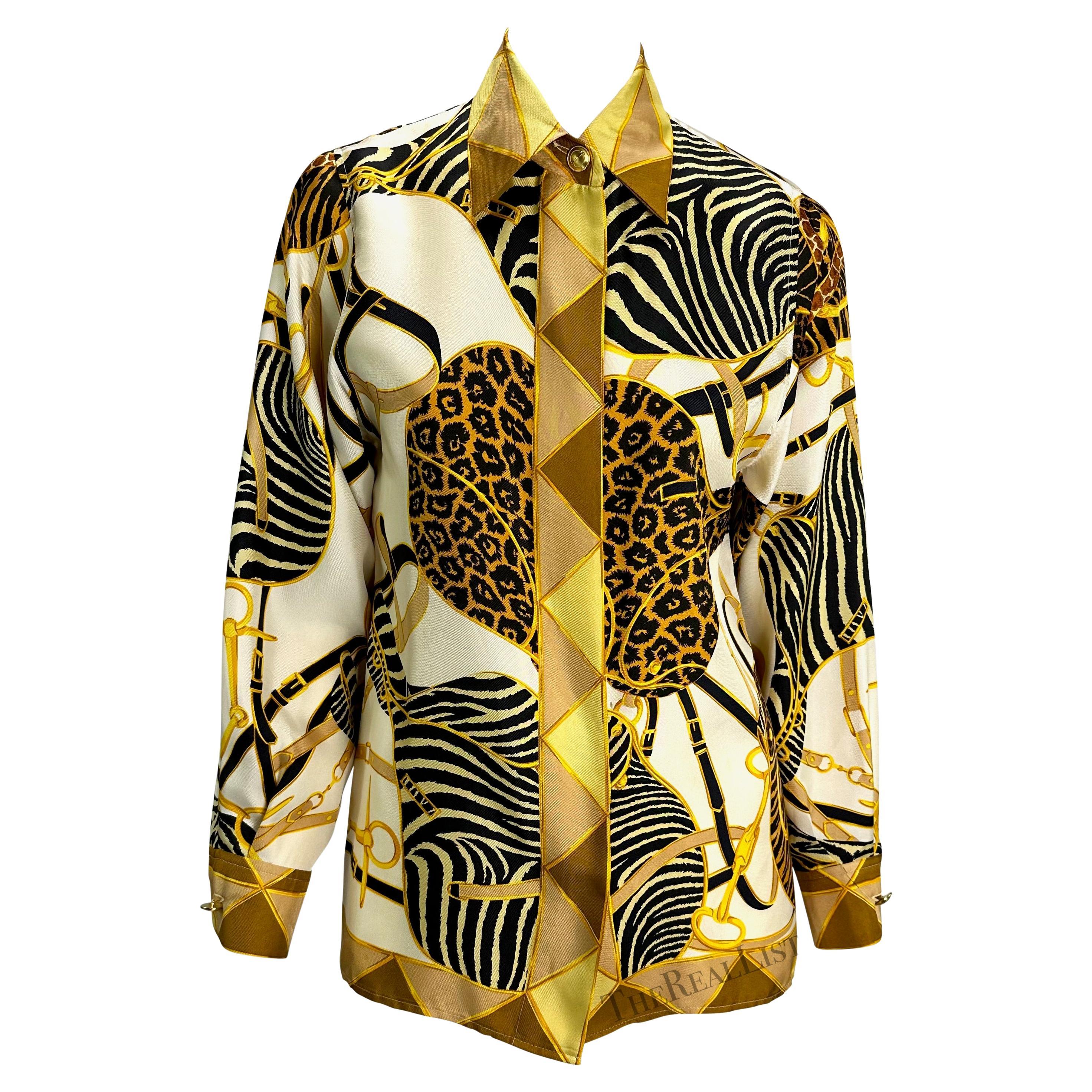 Presenting a beautiful animal print Gucci silk shirt. From the Spring/Summer 1993 collection, a pink version of this top debuted on the season's runway on Gail Elliott. Constructed of Silk, this piece features an equestrian motif with cheetah and zebra print saddles. This fabulous top is complete with large gold-tone 'GG' buttons at the neck and cuffs.