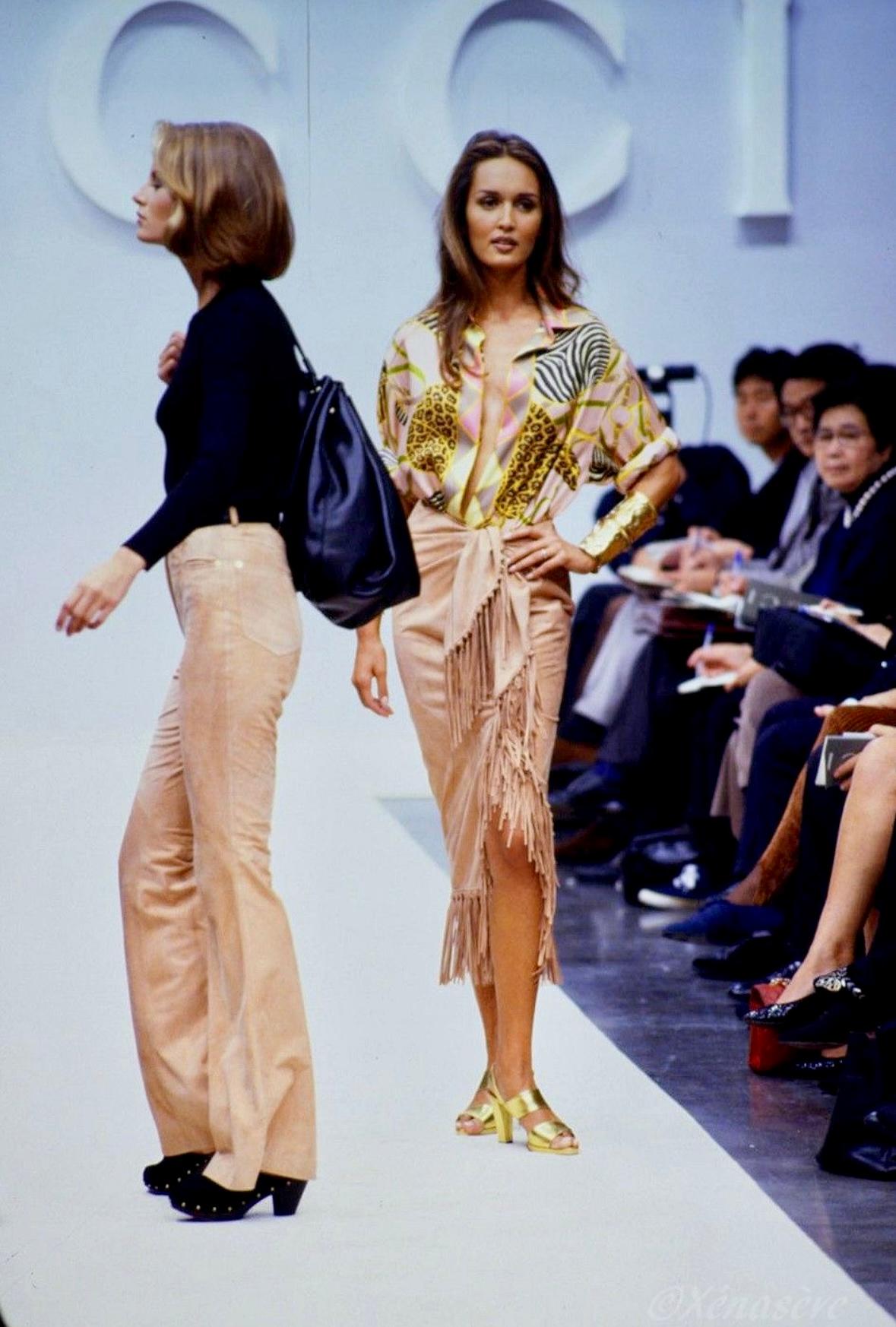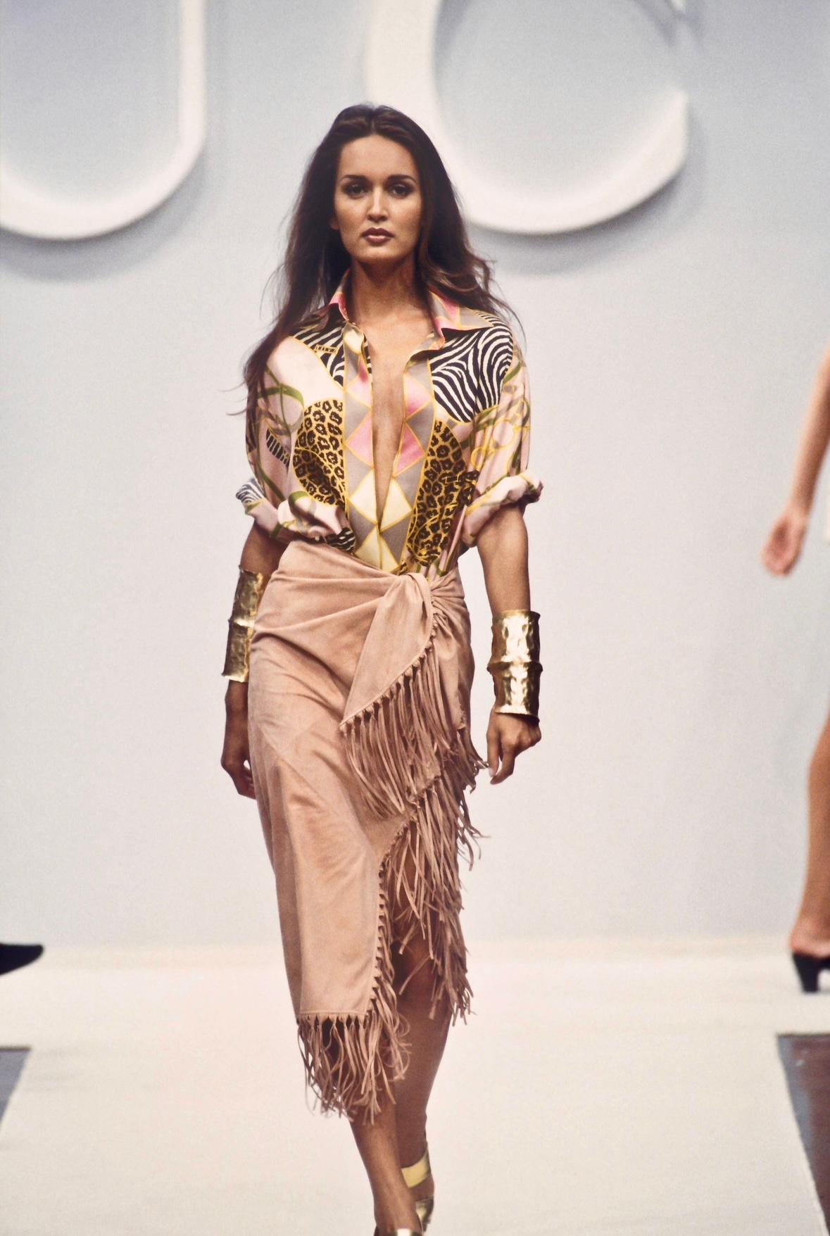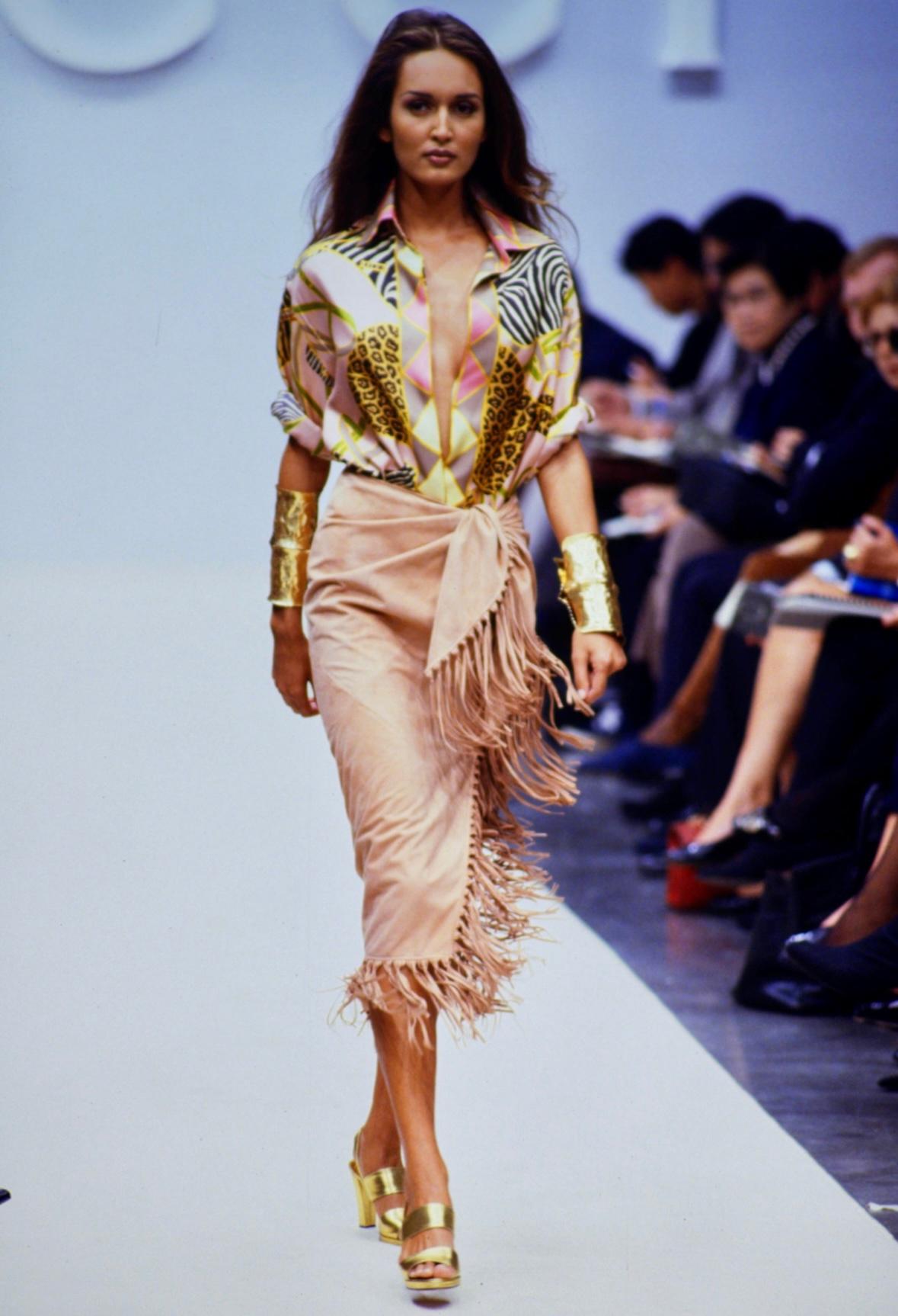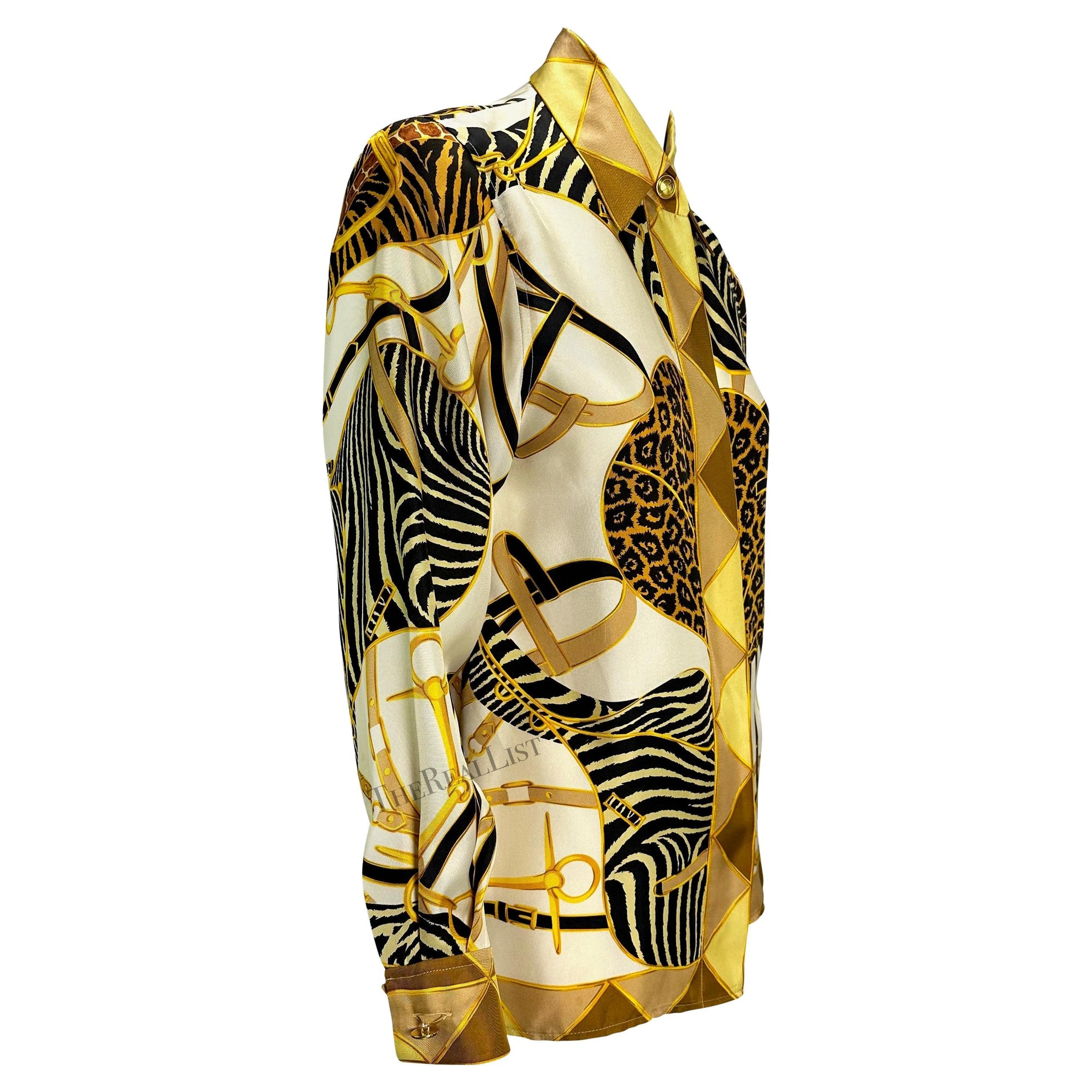 Presenting a beautiful animal print Gucci silk shirt. From the Spring/Summer 1993 collection, a pink version of this top debuted on the season's runway on Gail Elliott. Constructed of Silk, this piece features an equestrian motif with cheetah and zebra print saddles. This fabulous top is complete with large gold-tone 'GG' buttons at the neck and cuffs.