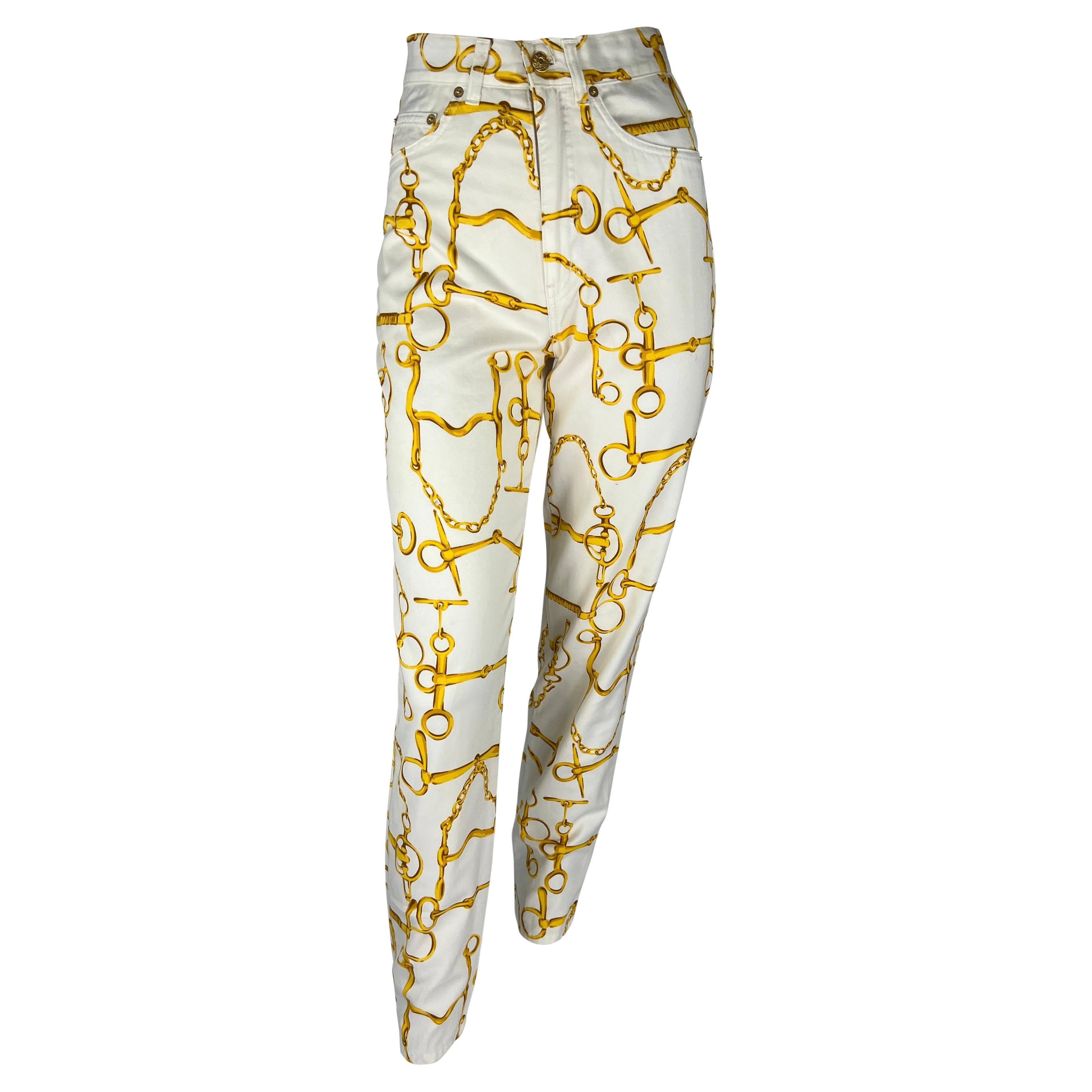 S/S 1993 Gucci White Gold Horsebit Chain Print High-Waisted Jean Pants