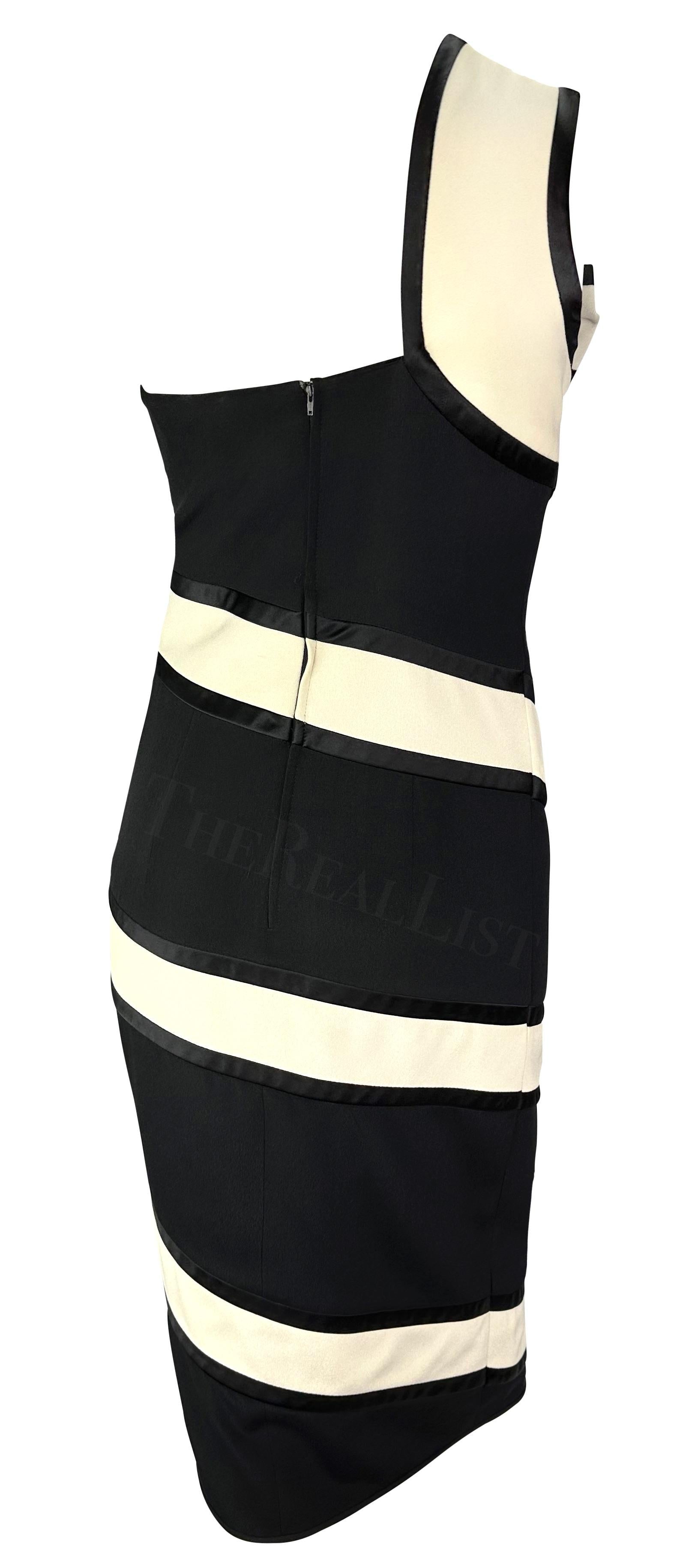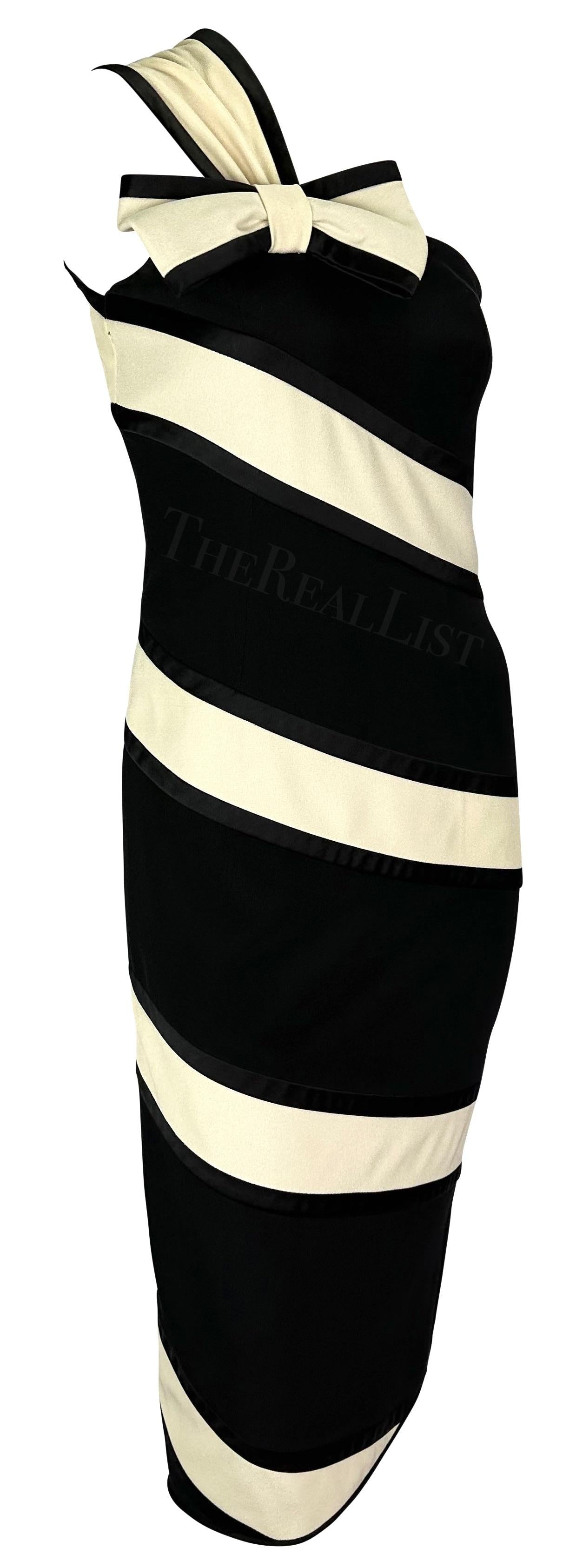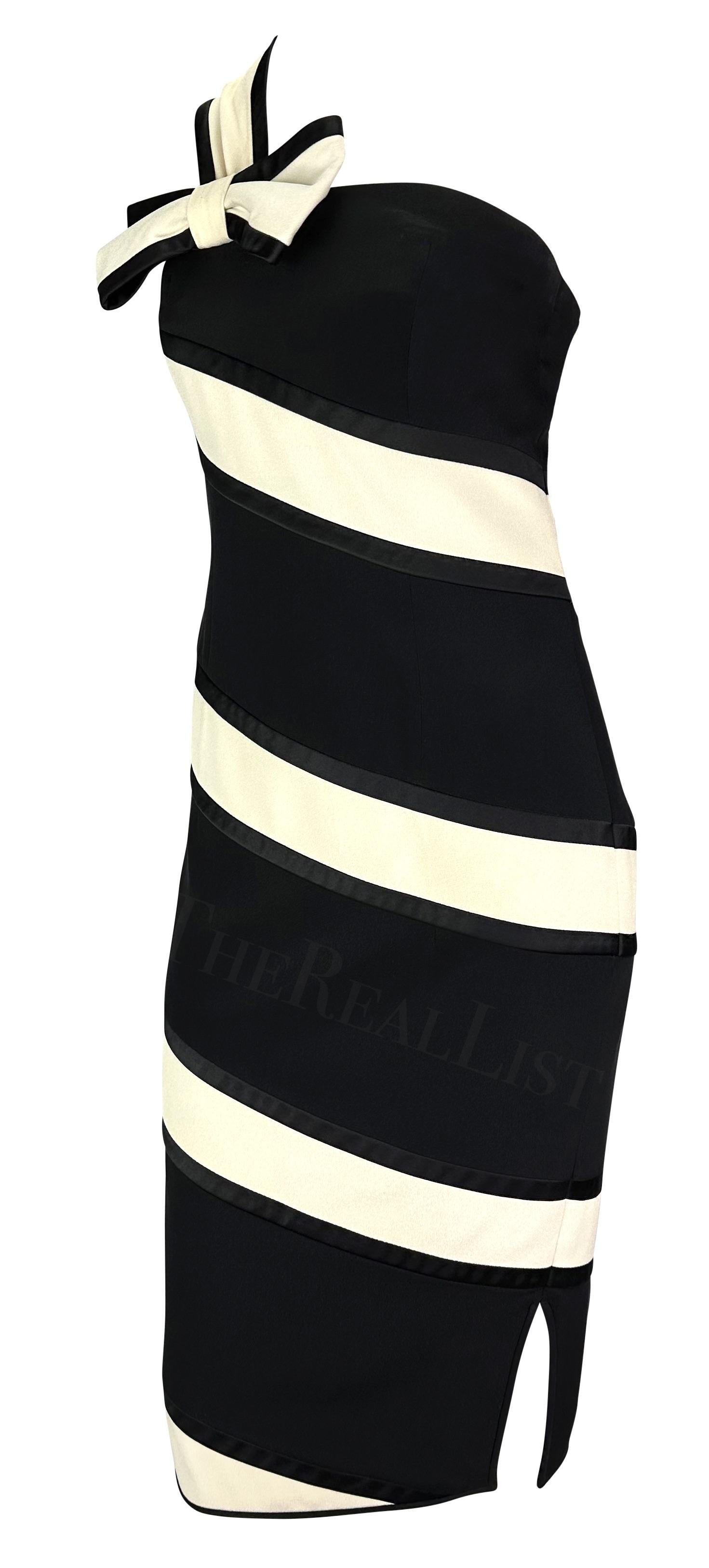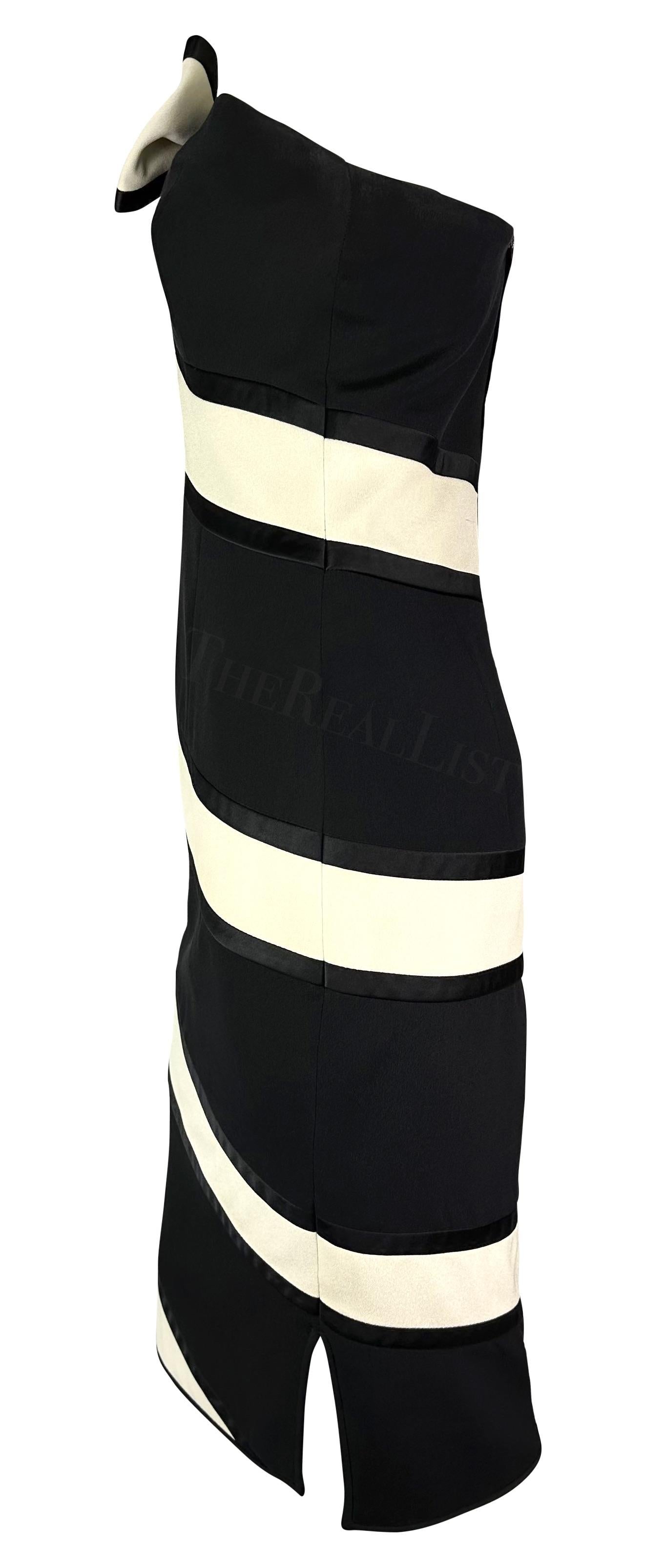 TheRealList presents: a black and white Valentino mini dress. From the Spring/Summer 1993 collection, this dress debuted on the season's runway on Katoucha Niane. The black silhouette is enlivened by a white ribbon, draped over one shoulder and tied off with a bow. A subtle front slit completes this chic single-shoulder piece. Follow us on Instagram! @_the_reallist_