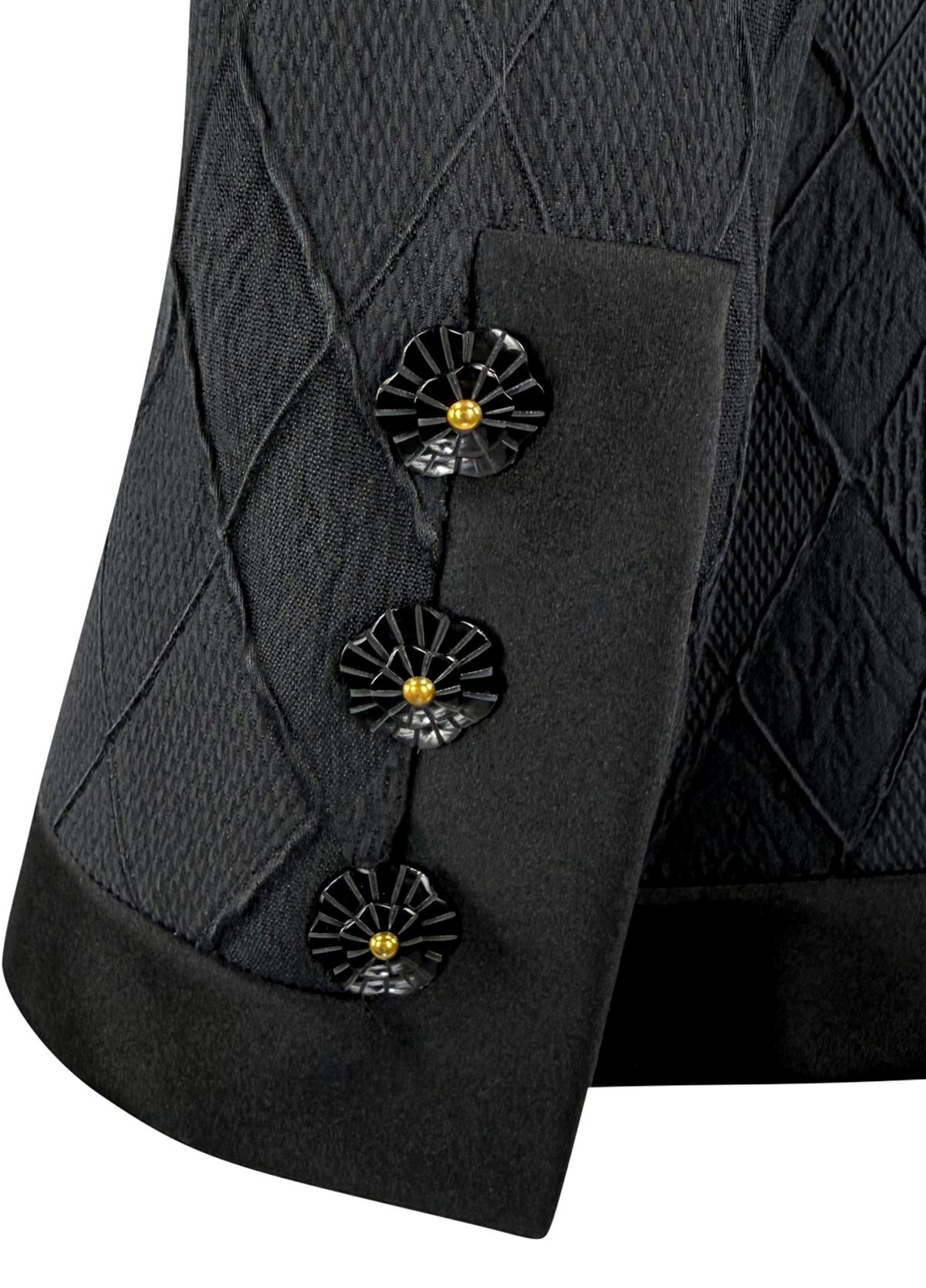 From Valentino’s Spring/Summer 1993 Haute Couture collection, this tailored black blazer jacket features a diamond-patterned jacquard fabric, satin lapels, and a dramatic silk bow tie closure. With a sharply notched hem and floral buttons, the handmade piece is effortlessly elegant. Modeled on the Haute Couture runway by Christy Turlington-Burns.