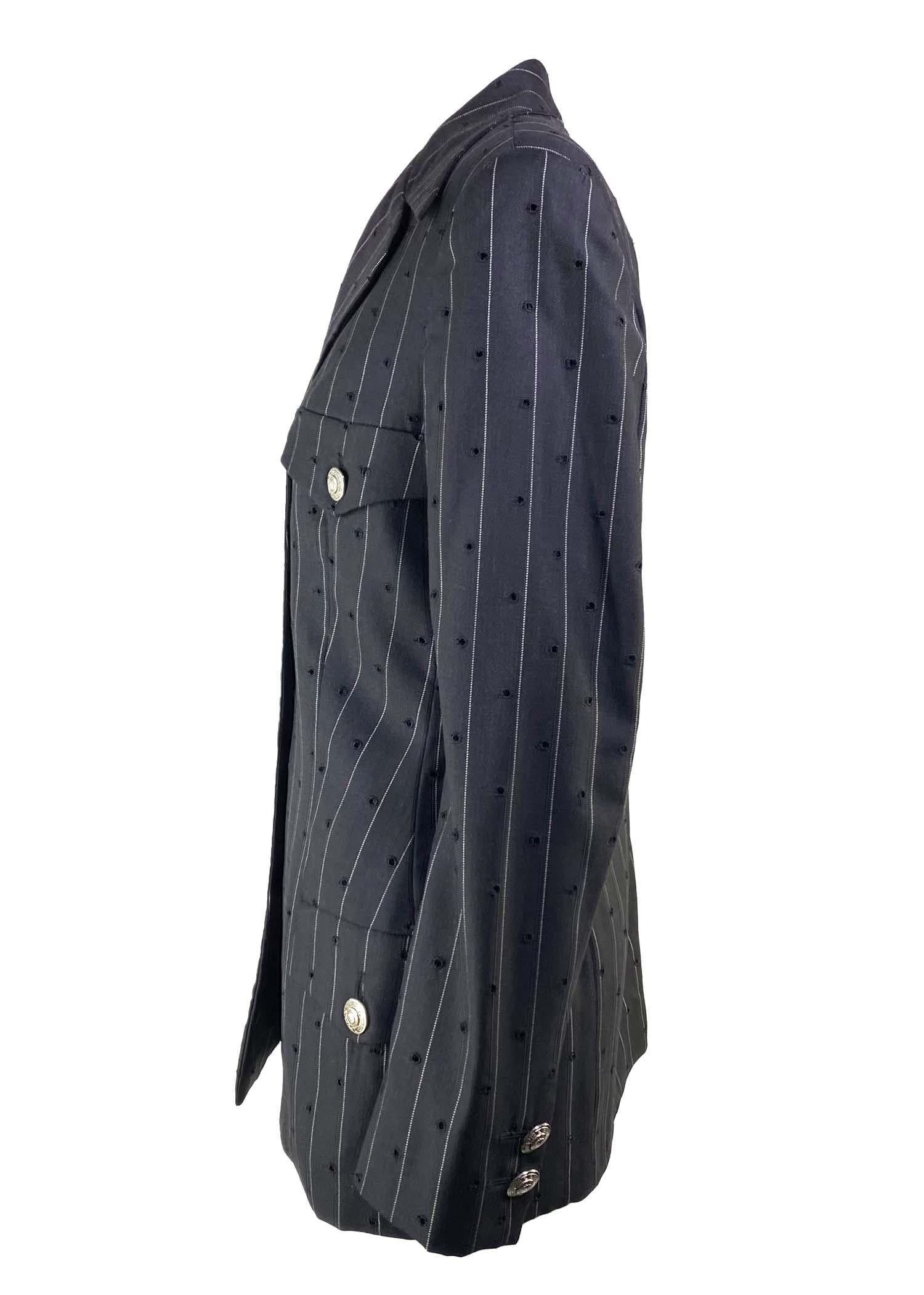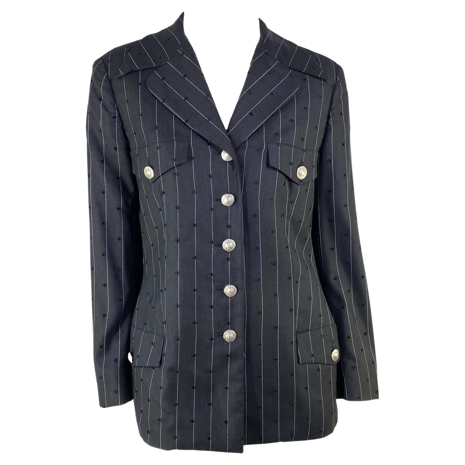 Presenting a pinstripe perforated Gianni Versace Couture blazer designed by Gianni Versace. This Spring/Summer 1994 collection piece features clean-cut designs in perforated fabric. This collection is remembered for its punk influences and the introduction of Versace's iconic safety pin designs. The blazer is complete with silver Medusa buttons at the closure, pockets, and cuffs.