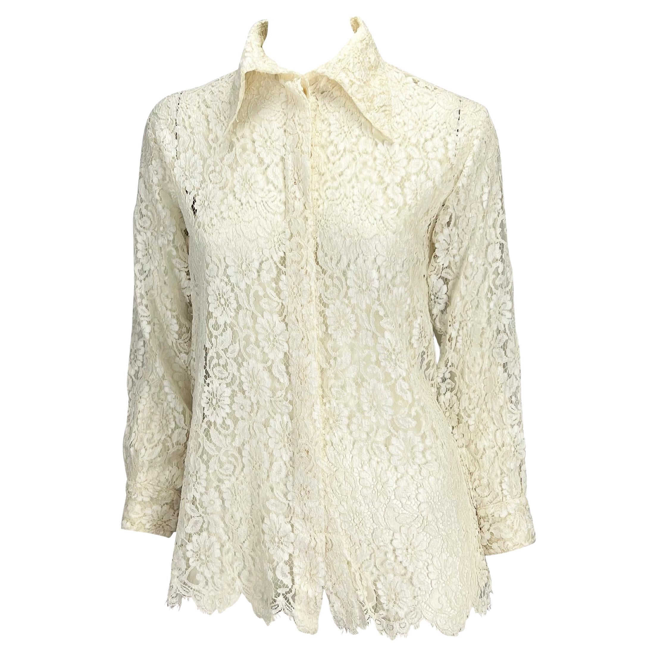 Presenting a beautiful white floral lace button-up Gianni Versace Couture top designed by Gianni Versace. A similar blouse from the Spring/Summer 1994 collection opened the season's runway, modeled by Kate Moss, and appeared in the ad campaign on Linda Evangelista, shot by Richard Avedon. The blouse is constructed entirely of lace and features an exaggerated collar, hidden button closures, and a scalloped hem. Made complete with silver Medusa Versace buttons at the cuffs, this top is a summer essential and the perfect delicate contrast to Gianni's punk-inspired collection.