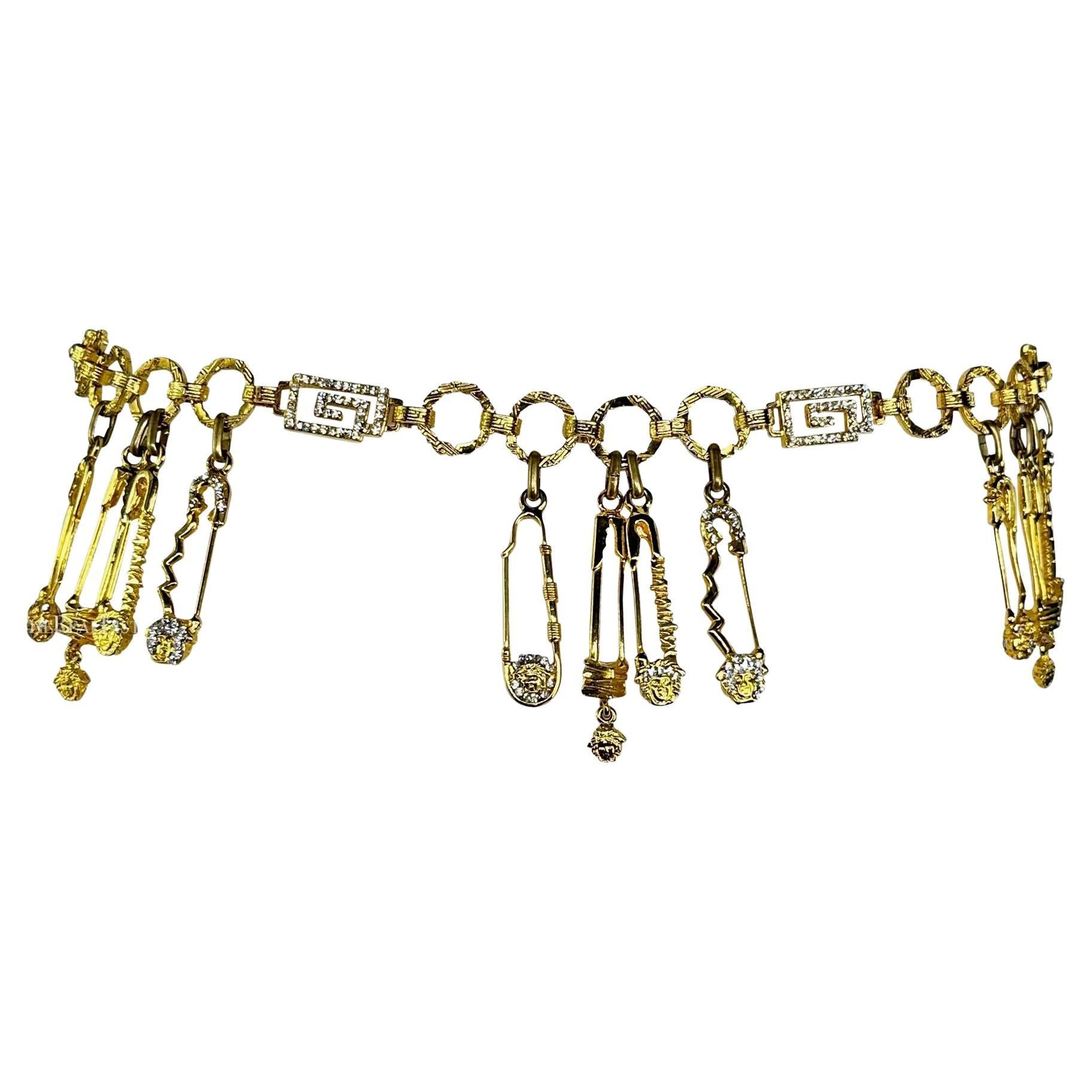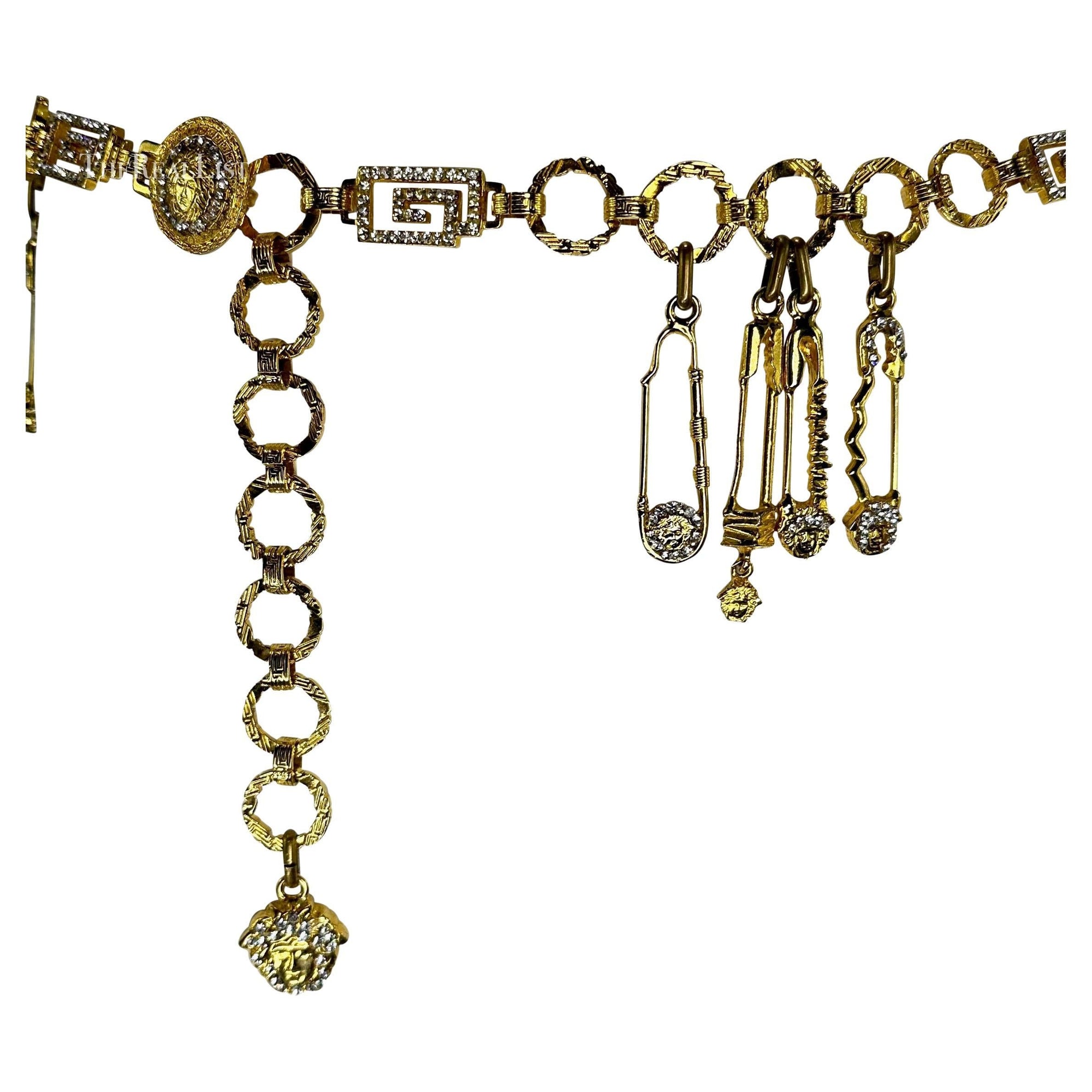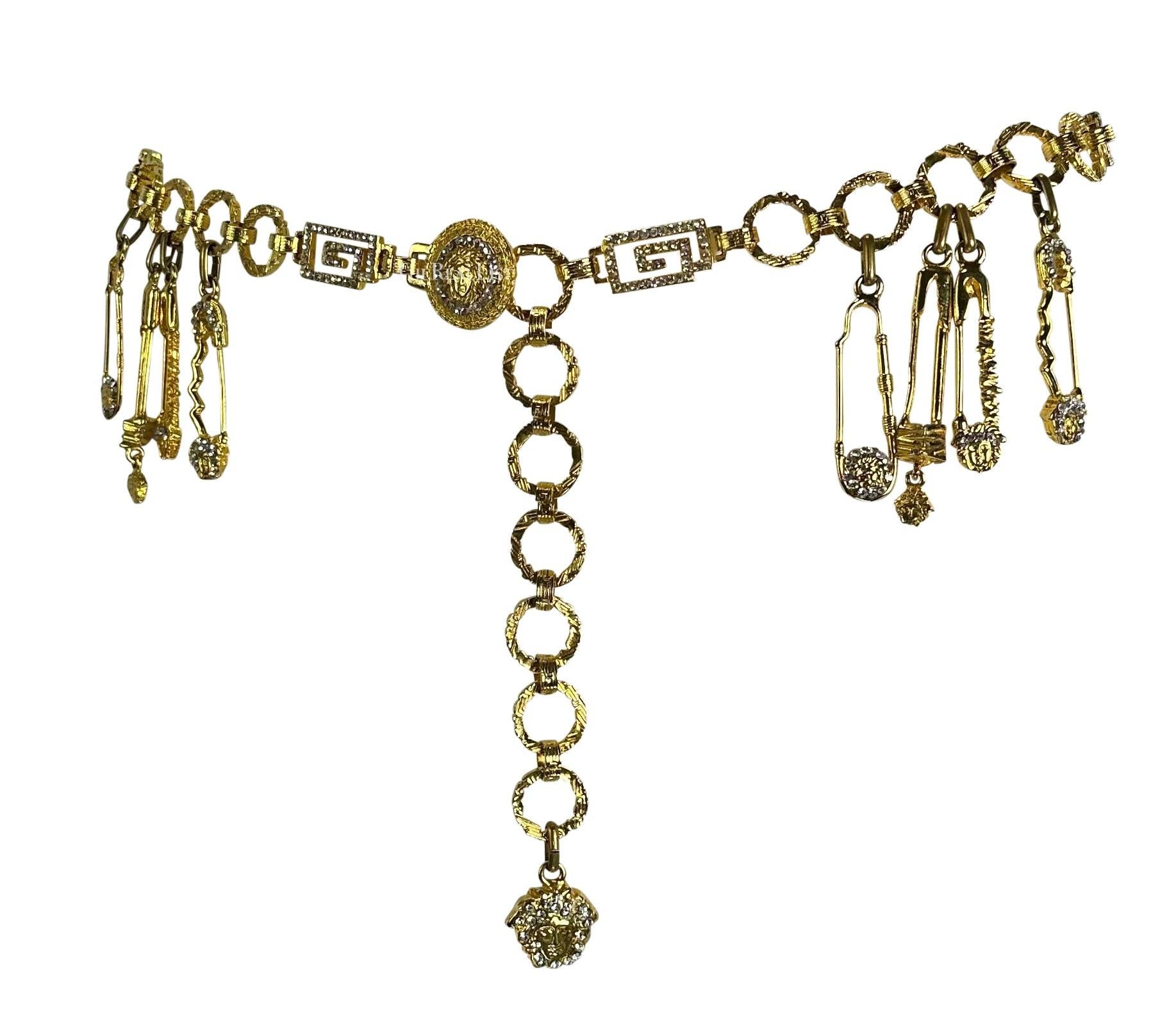 S/S 1994 Gianni Versace Gold Tone Rhinestone Safety Pin Medusa Chain Belt