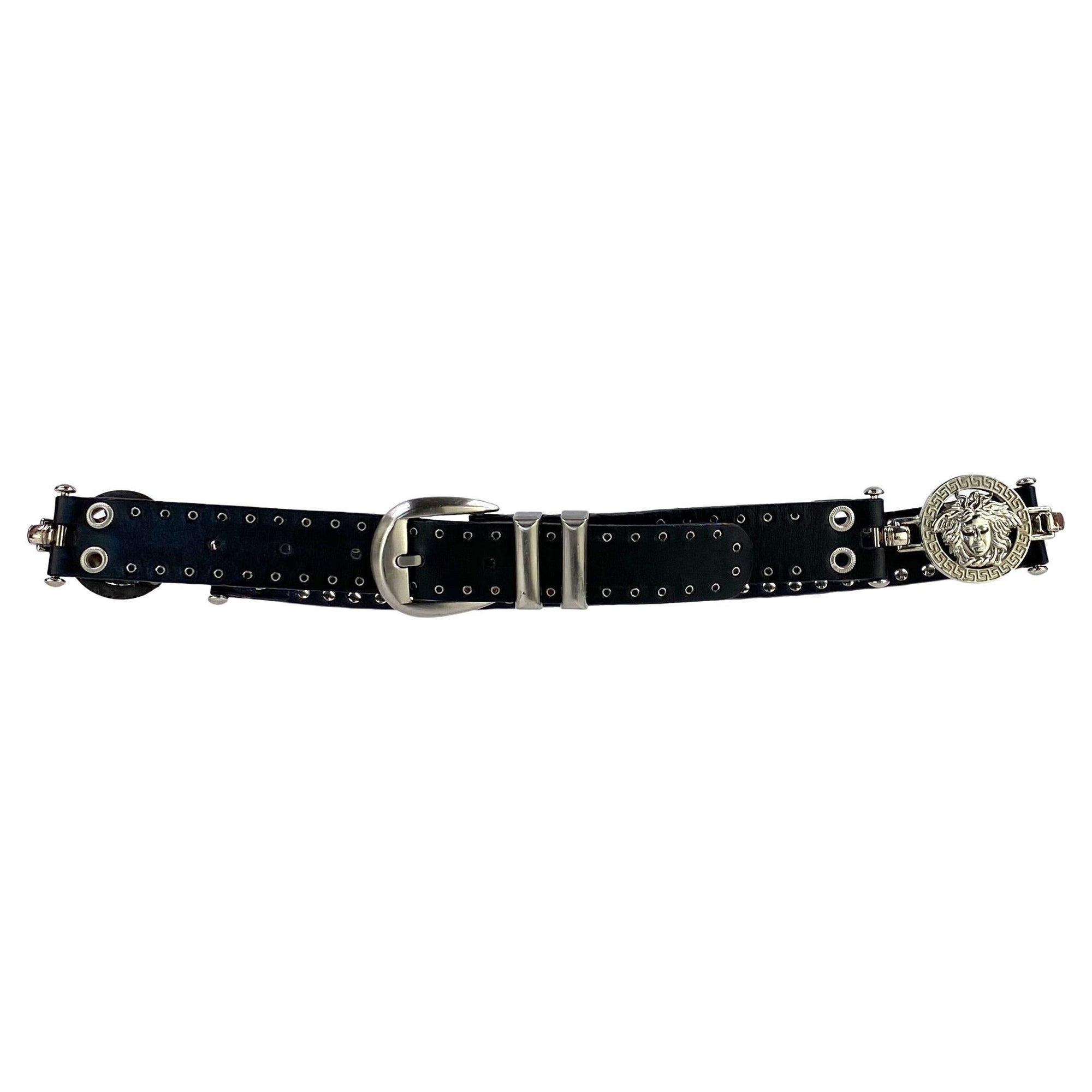 Presenting a punk-inspired metal and leather belt designed by Gianni Versace for his Spring/Summer 1994 collection. This belt features small silver-toned grommets and two large Medusa medallion accents.