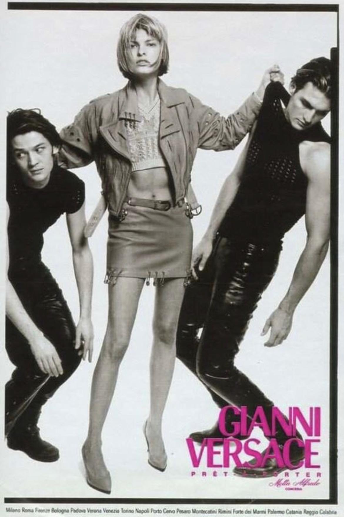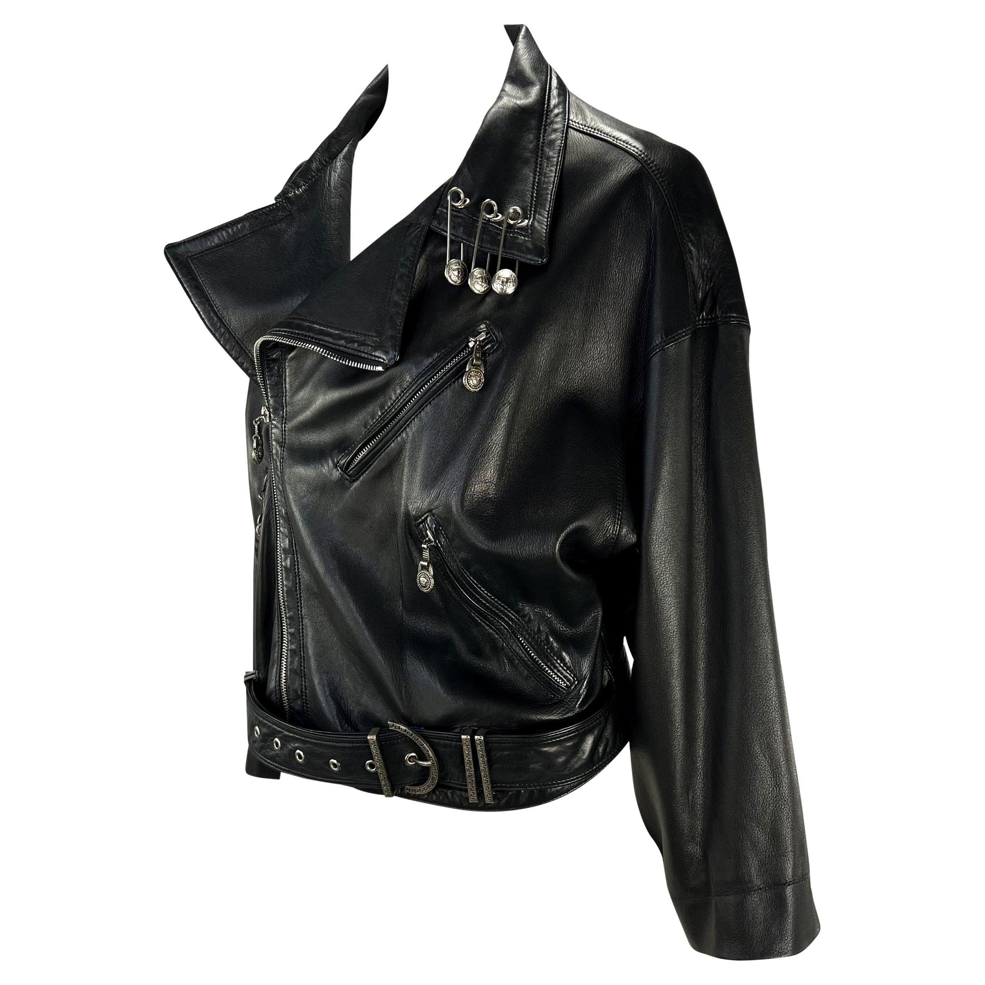 Presenting a biker-style Gianni Versace Couture safety pin leather jacket designed by Gianni Versace. From the Spring/Summer 1994 collection, a version of this jacket with cut eyelets debuted on the season's runway as part of Look 34, modeled by Kate Moss. Linda Evangelista also wore the eyelet version of this jacket in the season's ad campaign. This collection also marked the release of Versace's now-infamous safety pin. Elizabeth Hurley famously wore a safety pin dress from this collection, which solidified the importance of the pin in Versace's arsenal. This beautiful black leather jacket features three safety pins at the jacket's lapel, an asymmetric zipper, and a belt at the bottom of the coat. Slip into this piece of iconic Gianni Versace!