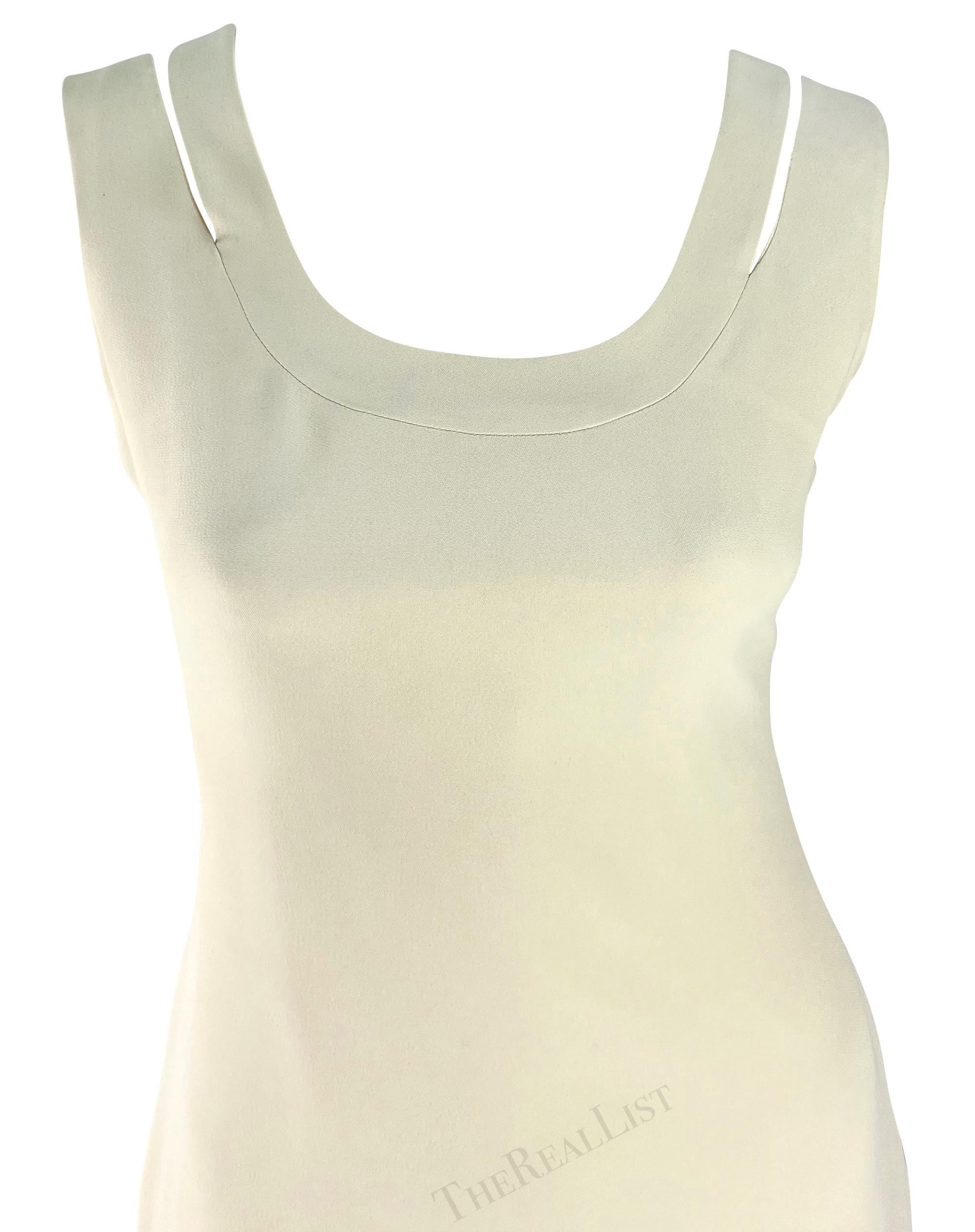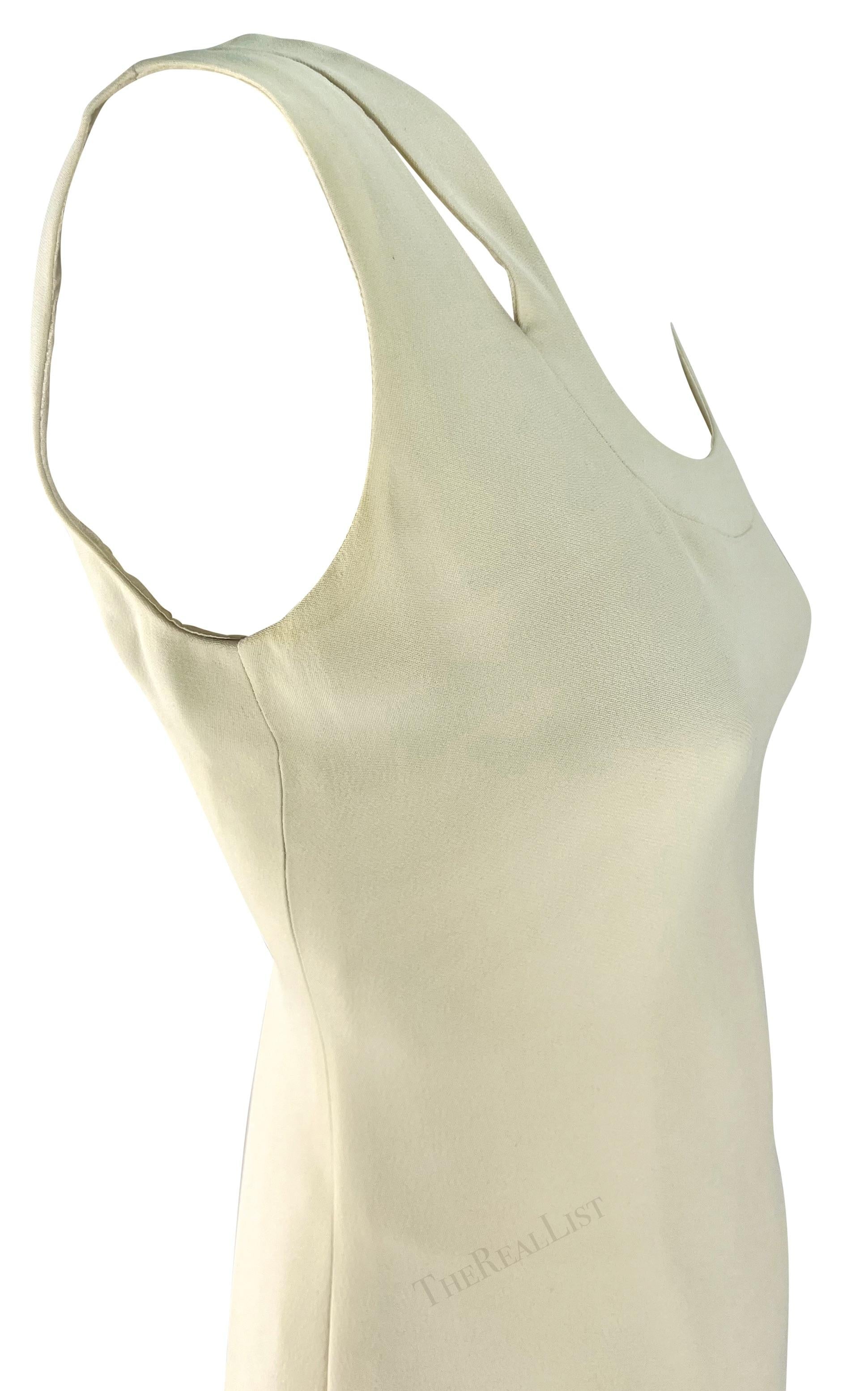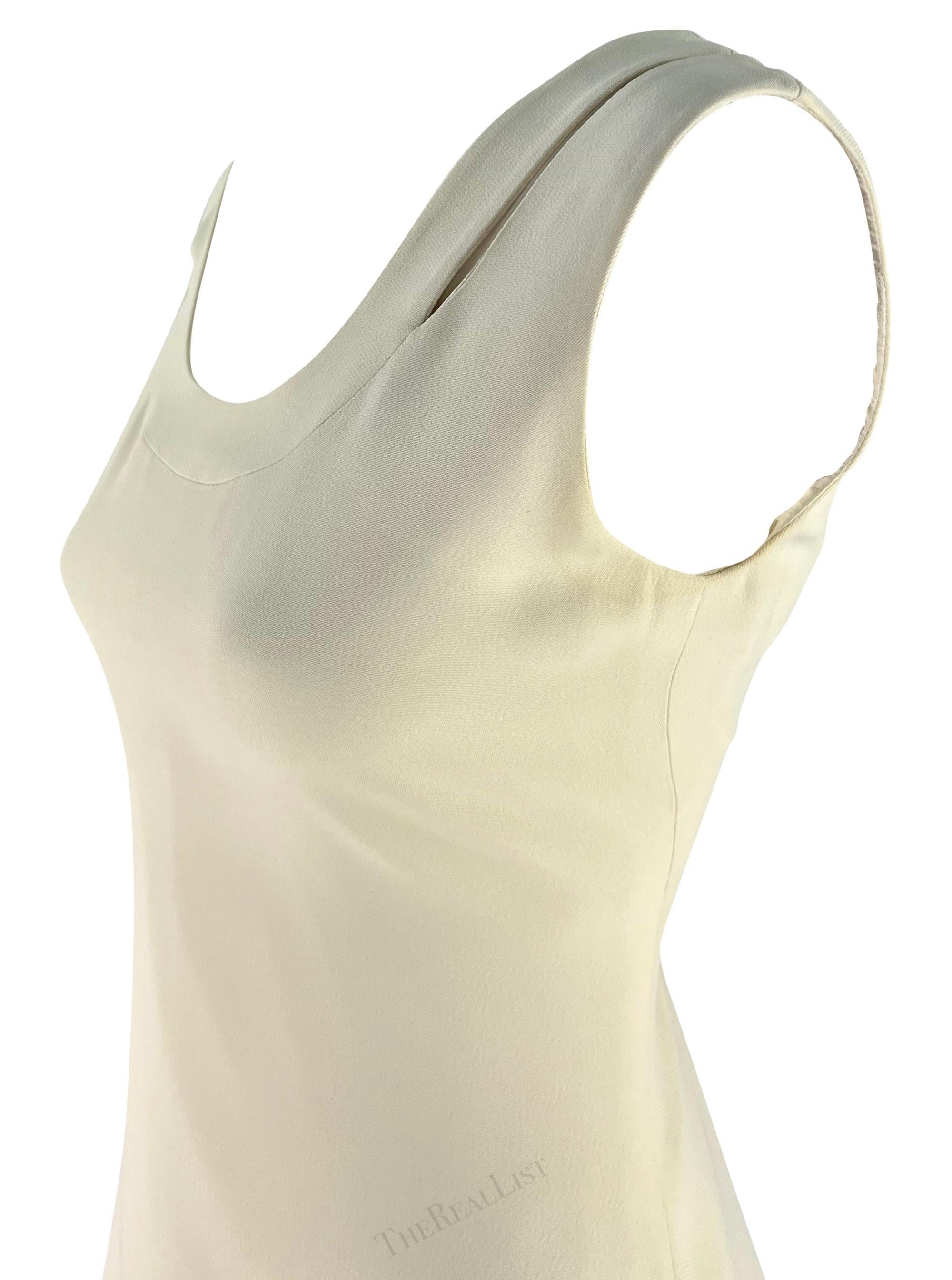 This off-white two-piece dress set from Gianni Versace’s Spring/Summer 1994 collection was designed by Gianni Versace. Featuring the iconic safety pin accents first introduced this season, later becoming a lasting house code, the set consists of a sleeveless ankle-length dress and a matching cropped jacket. The dress is cut with a scoop neckline, shoulder strap slits, and a low-exposed back. The oversized jacket, finished with a fold-over collar, is secured with a gold-tone rhinestone safety pin at the collar and silver-tone safety pins at the cuffs. Refined yet instantly recognizable, this set embodies Gianni Versace’s bold and unmistakable aesthetic of the mid-1990s.