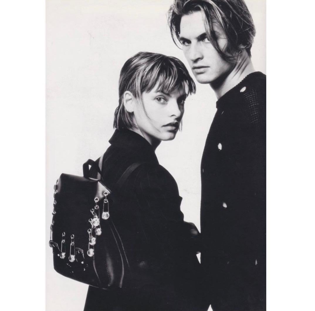 This punk-inspired mini backpack from Gianni Versace’s Spring/Summer 1994 collection is a rare archival accessory. Variations of this design appeared throughout the season’s runway presentation and in the ad campaign featuring Linda Evangelista, photographed by Richard Avedon. The bag is adorned with the house’s iconic Medusa safety pins, made famous by the safety pin dress worn by Elizabeth Hurley to the 1994 premiere of Four Weddings and a Funeral. It features dual magnetic closures beneath faux buckle fastenings, a drawstring beneath the top flap, and bold geometric cut-out detailing. A coveted piece for collectors, this backpack exemplifies the rebellious glamour of 1990s Versace.