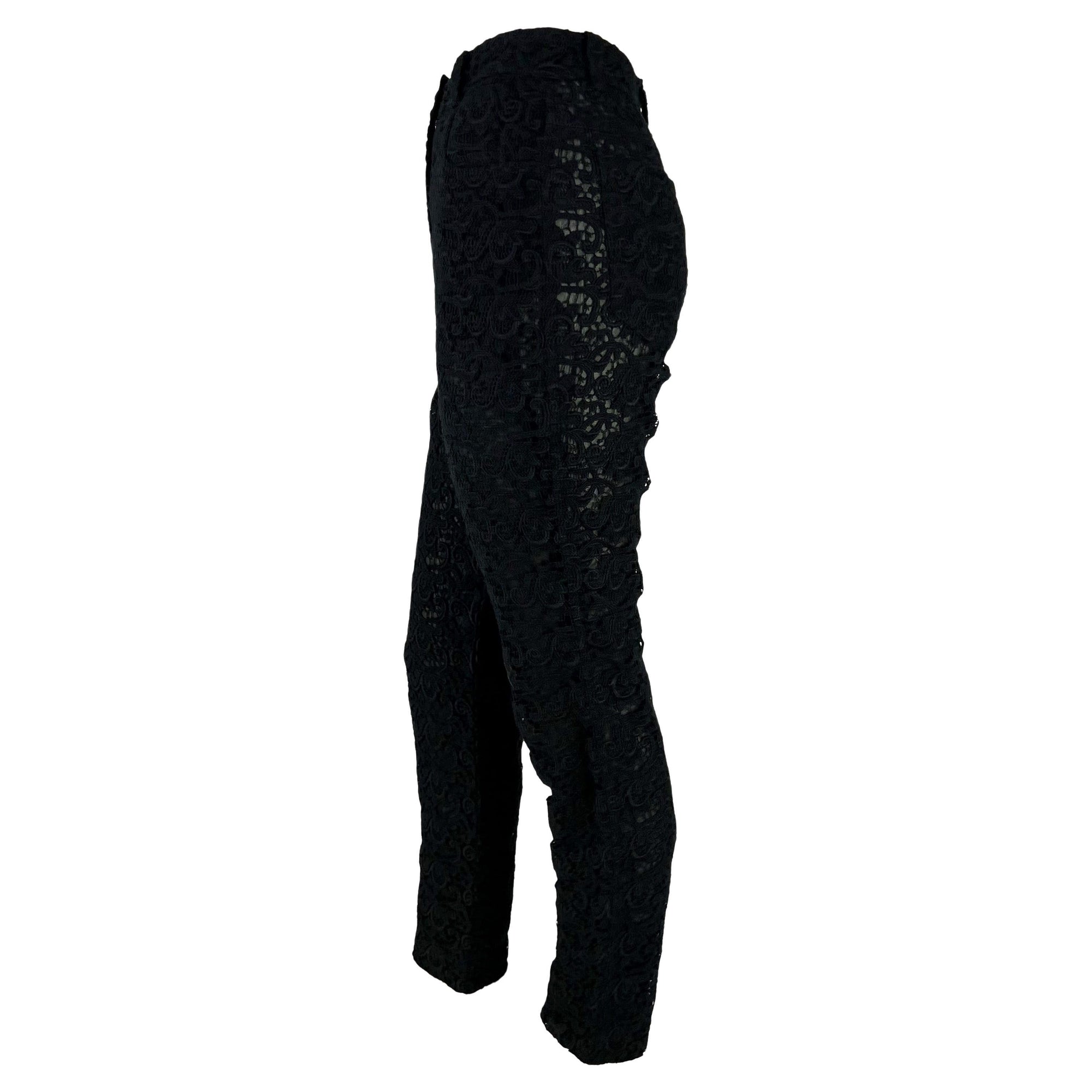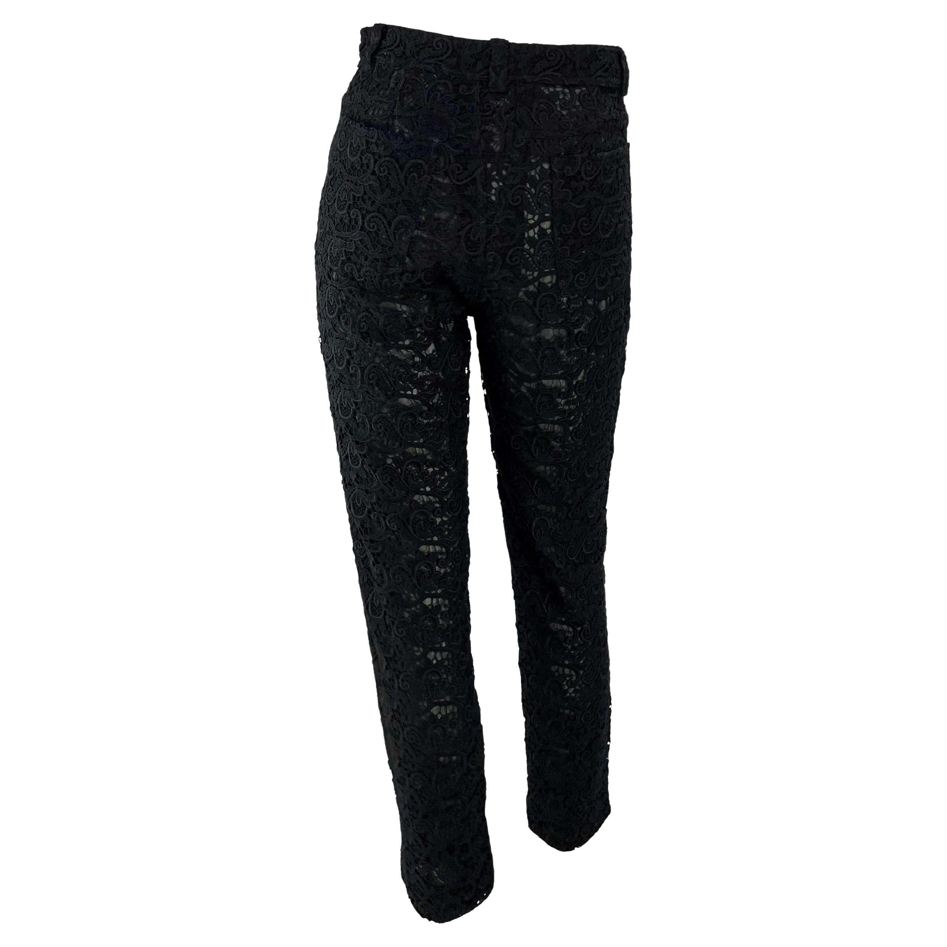 Presenting a pair of black lace Gianni Versace Couture pants designed by Gianni Versace. From the Spring/Summer 1994 collection, these pants are constructed entirely of intricate lace with a sheer black lining underneath. These pants are made complete with a black Versace Medusa button closure. Snag these rare pants while they're available!