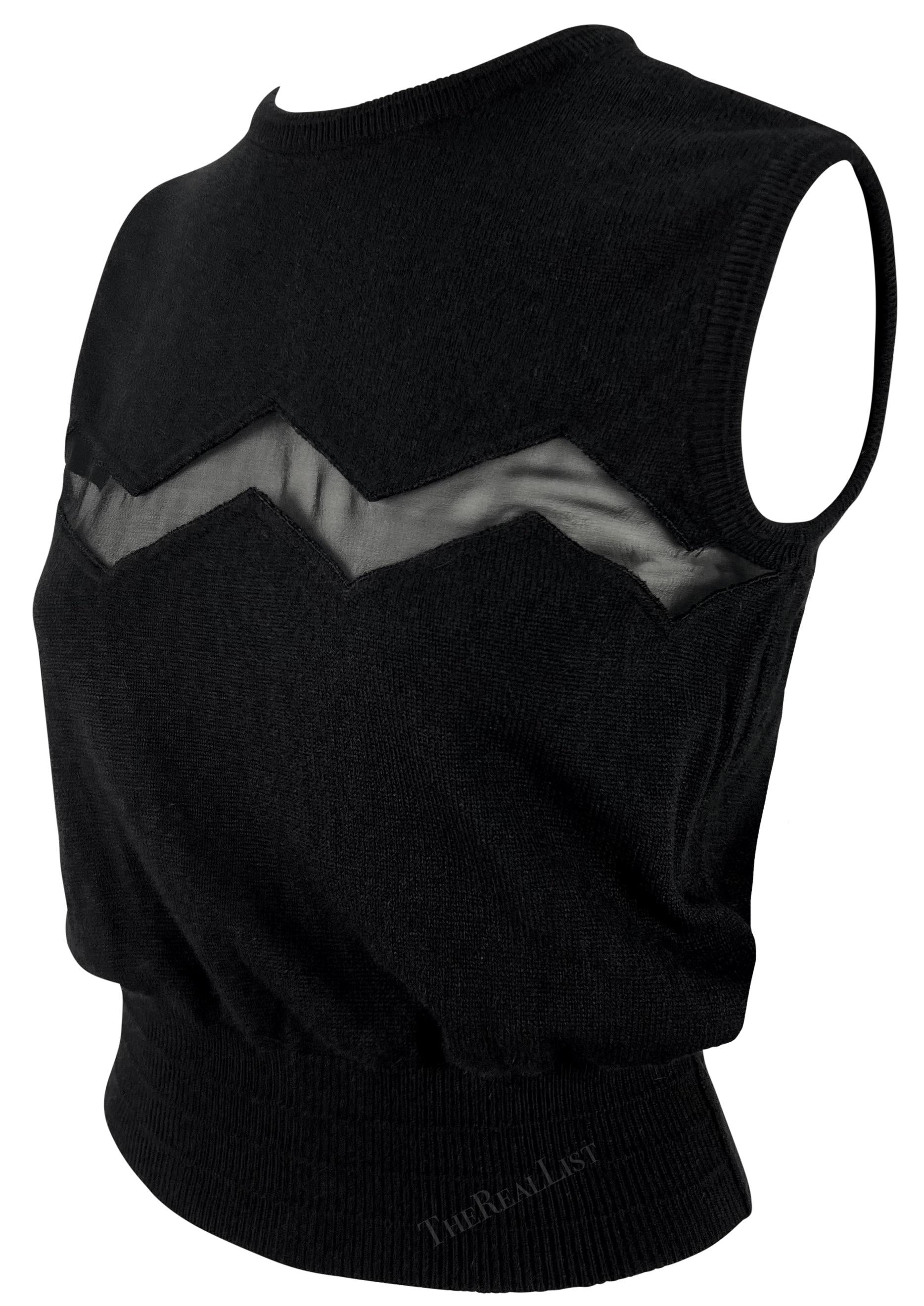 This chic black Gianni Versace sleeveless sweater vest was designed by Gianni Versace for the Spring/Summer 1994 collection. This sleeveless sweater features a crew neck and is made complete with a sheer zig-zag panel that runs across the bust.