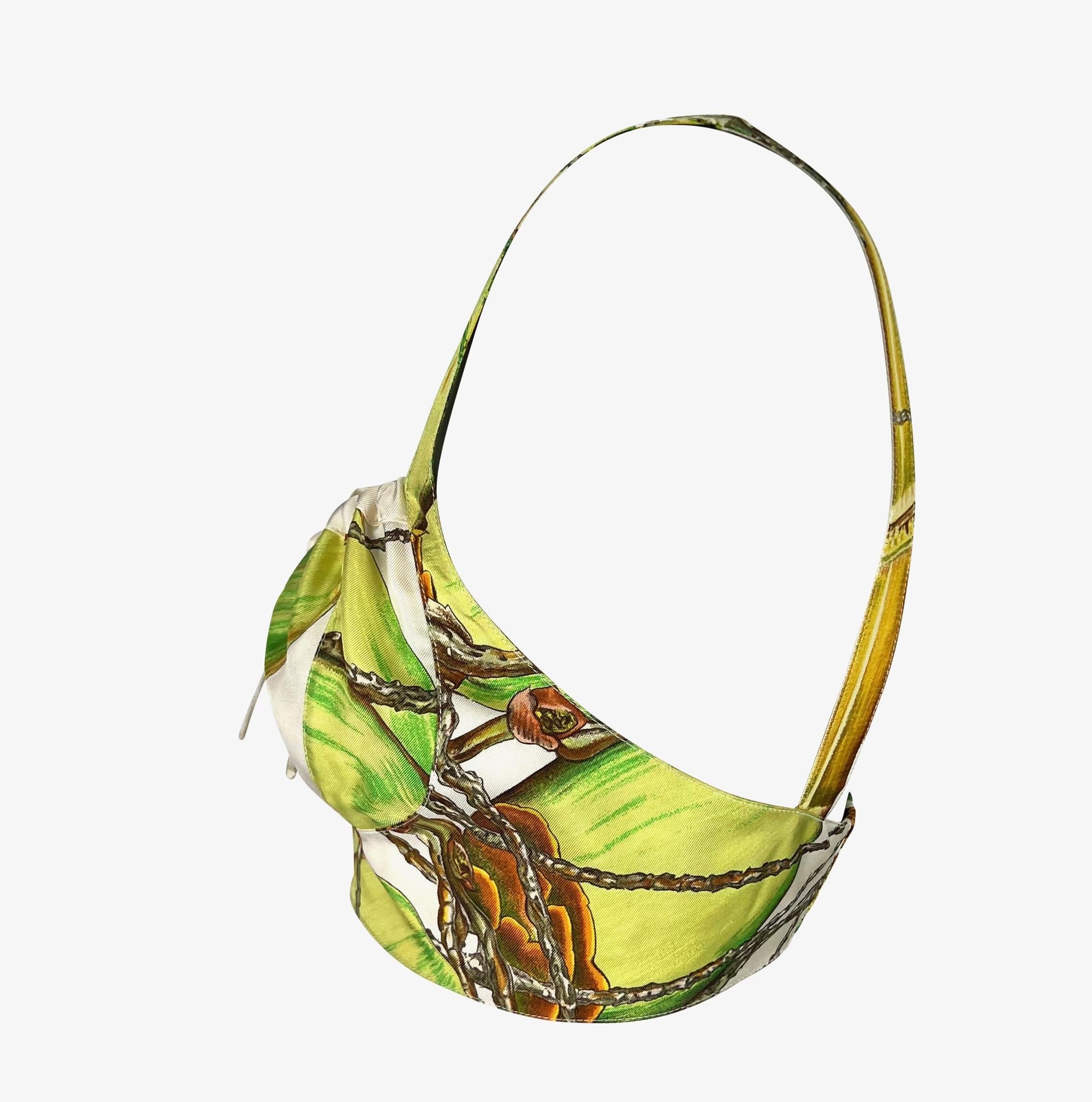 This “Jardin Créole” jungle print bralette crop top is from Hermès’s Spring/Summer 1994 collection. An identical version debuted on the runway in black. The design features a branded button closure at the front, an adjustable drawstring bow, and an elastic back band stamped with the print’s name, Jardin Créole. Designed by Valérie Dawlat-Dumoulin, the bold vintage print captures Hermès’s mastery of vibrant, collectible textiles.
