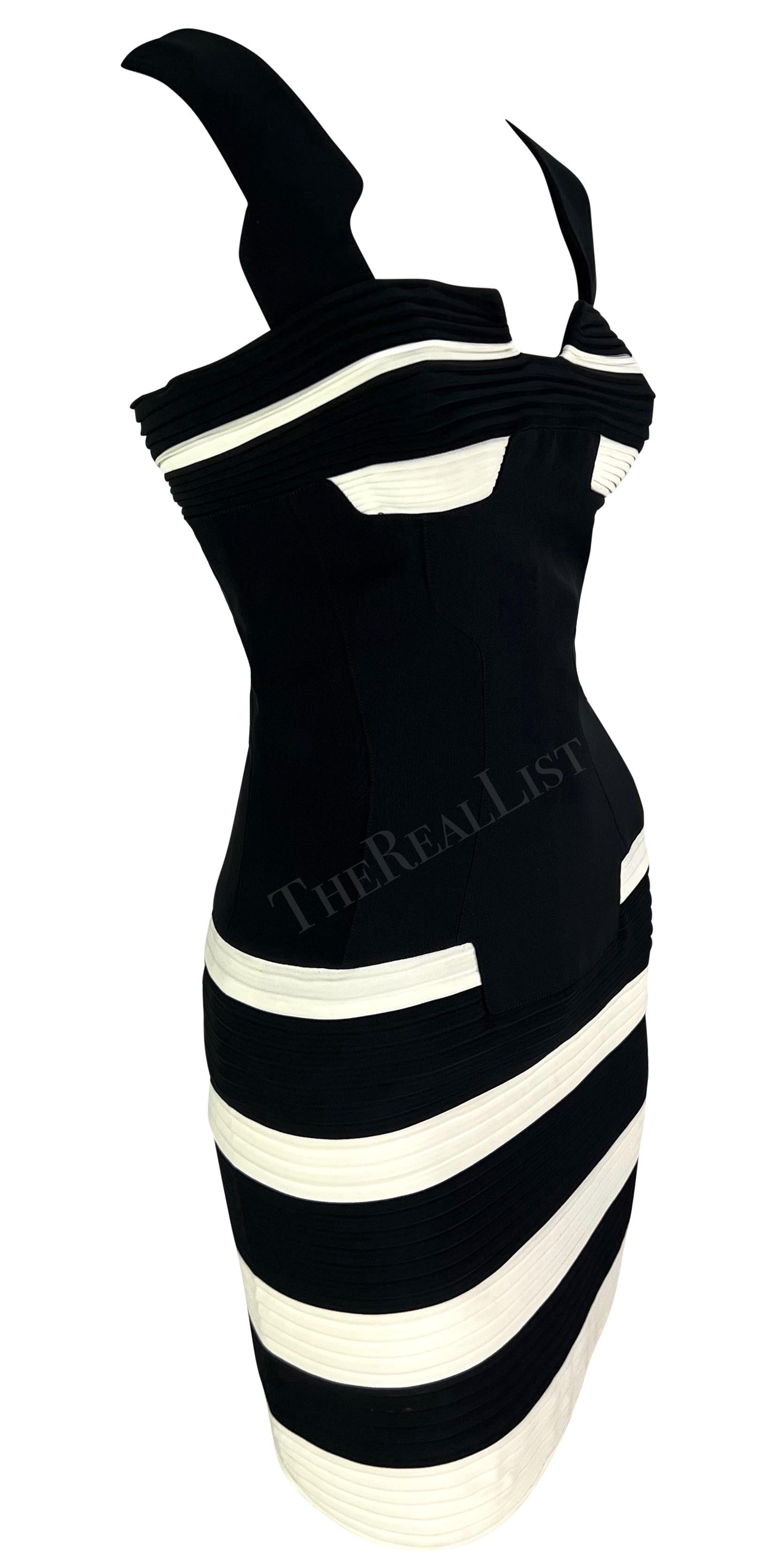 Manfred Thierry Mugler designed this striking black and white sleeveless mini dress for his Spring/Summer 1994 collection. Debuting in the season's runway presentation on Eva Herzigova, this bombshell of a dress features an hourglass silhouette, accordion pleating at the bust and skirt, and a unique angular neckline. Check out our storefront for more archival Mugler!