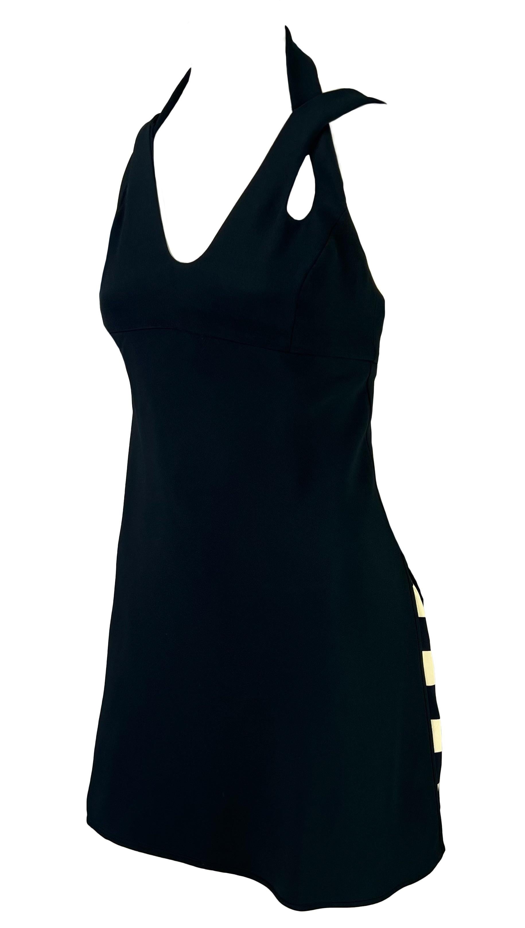 This chic dark blue mini dress was designed by Valentino Garavani for his Spring/Summer 1994 collection. The opening look in the season's runway presentation on Amber Valletta and featured in the season's ad campaign on Christy Turlington, captured by Mario Testino. This fabulous sleeveless dress features shoulder straps that intertwine with a halter neck strap, creating cutouts at the chest. The dress is made complete with high slits on either side which provide a preview of the navy blue and white striped accent underneath. Perfectly versatile, this vintage Valentino dress is easily dressed up or down and is the perfect dress for an elevated day boat trip. Check out our storefront for more archival Valentino!