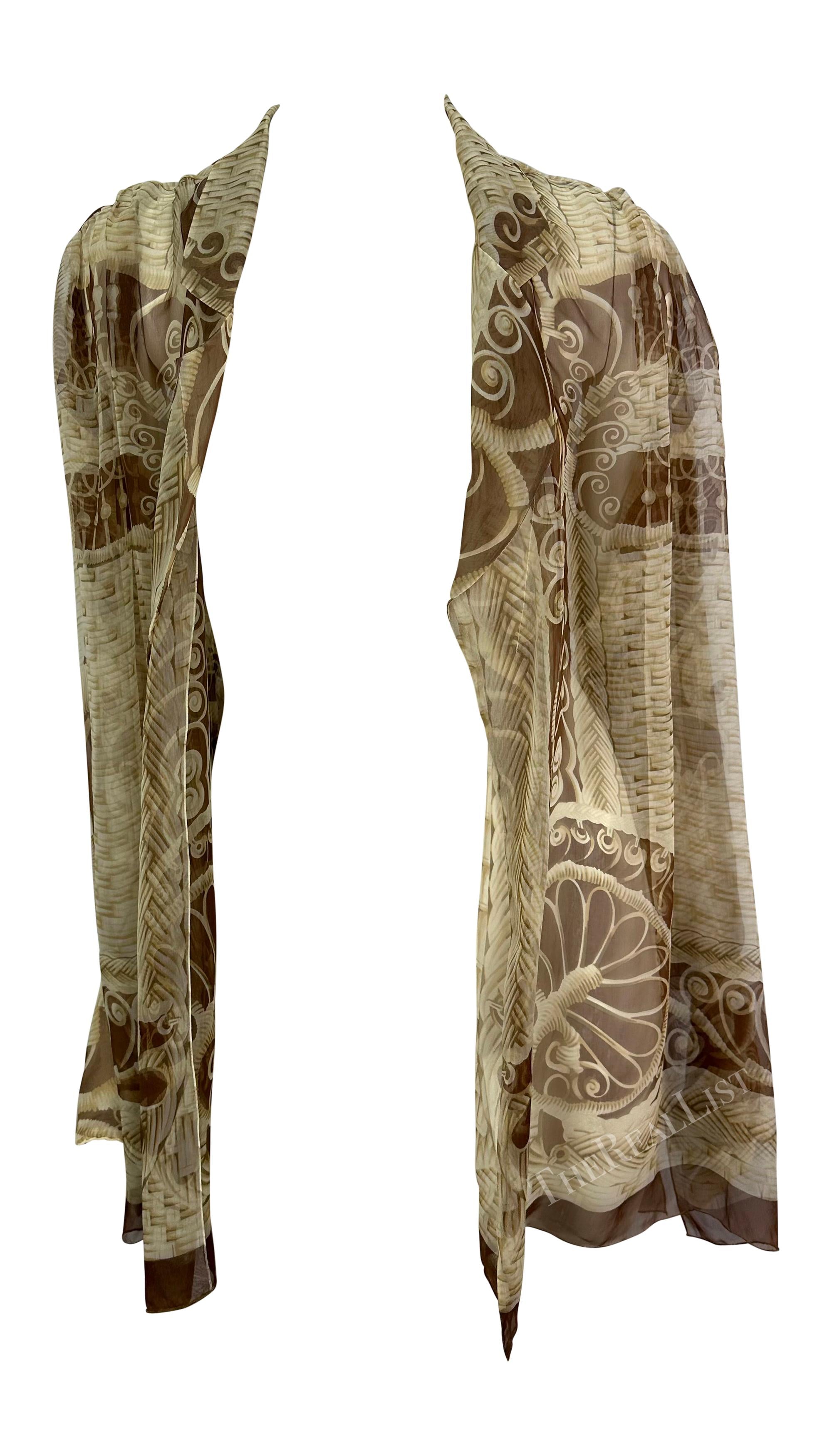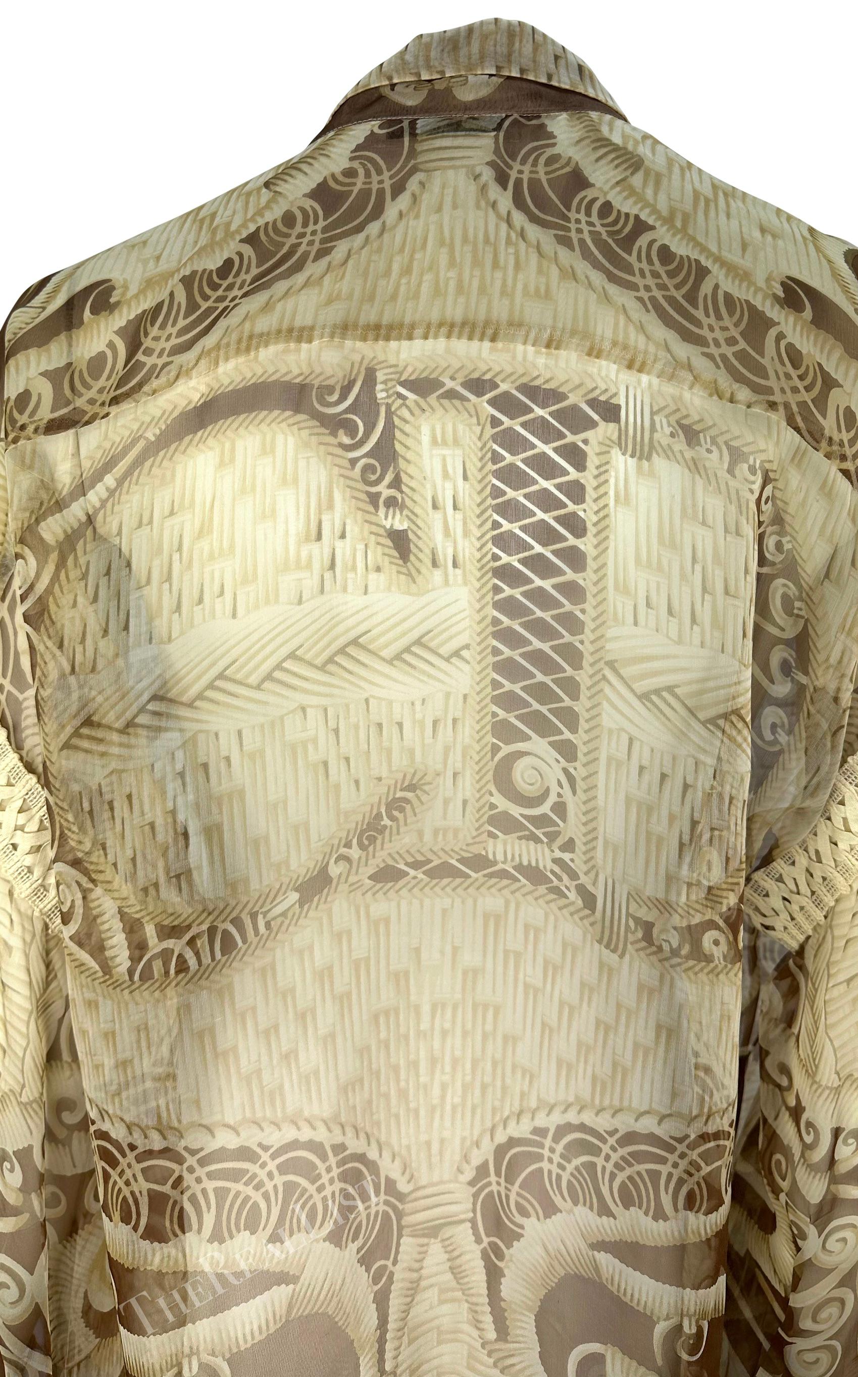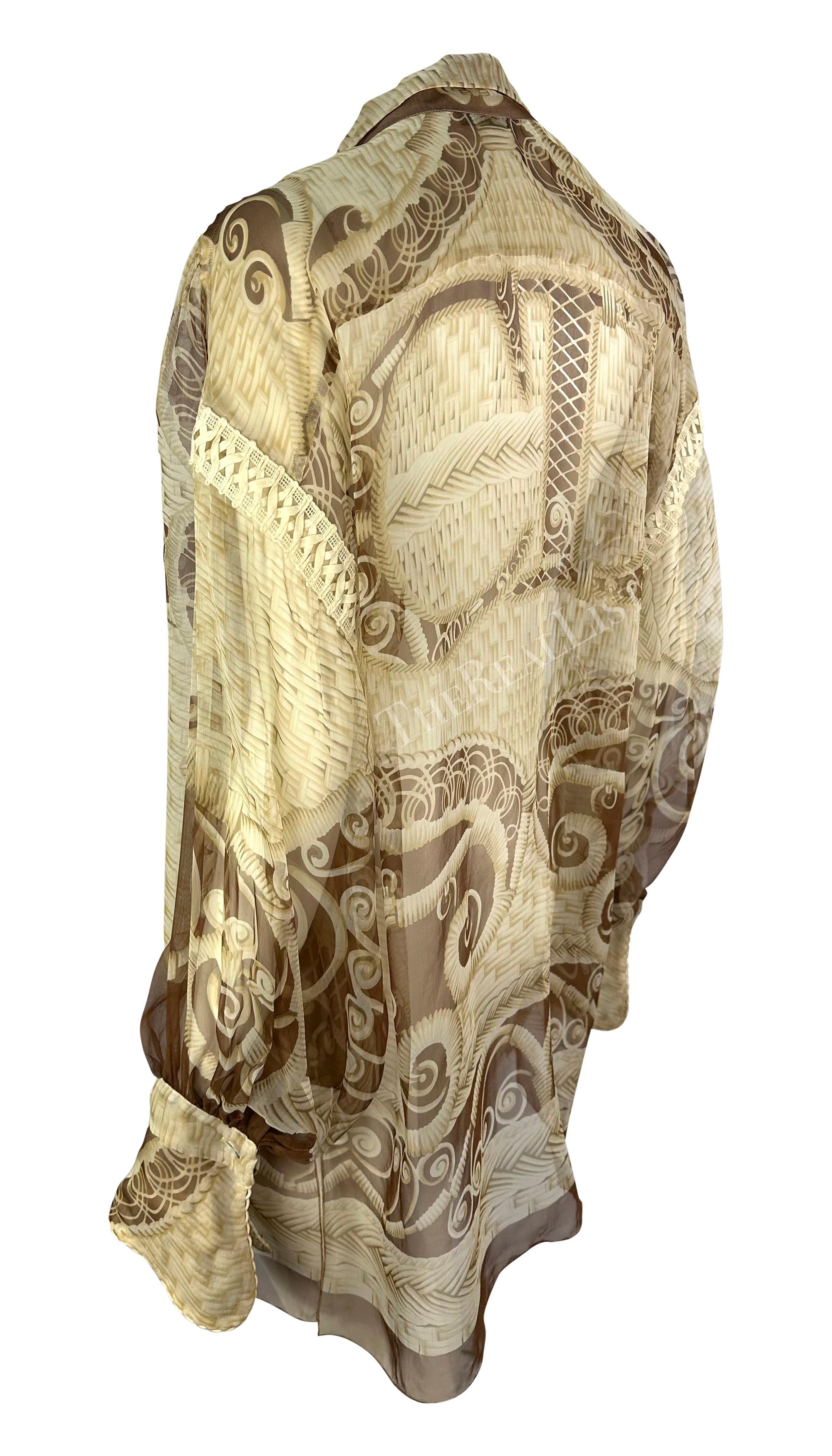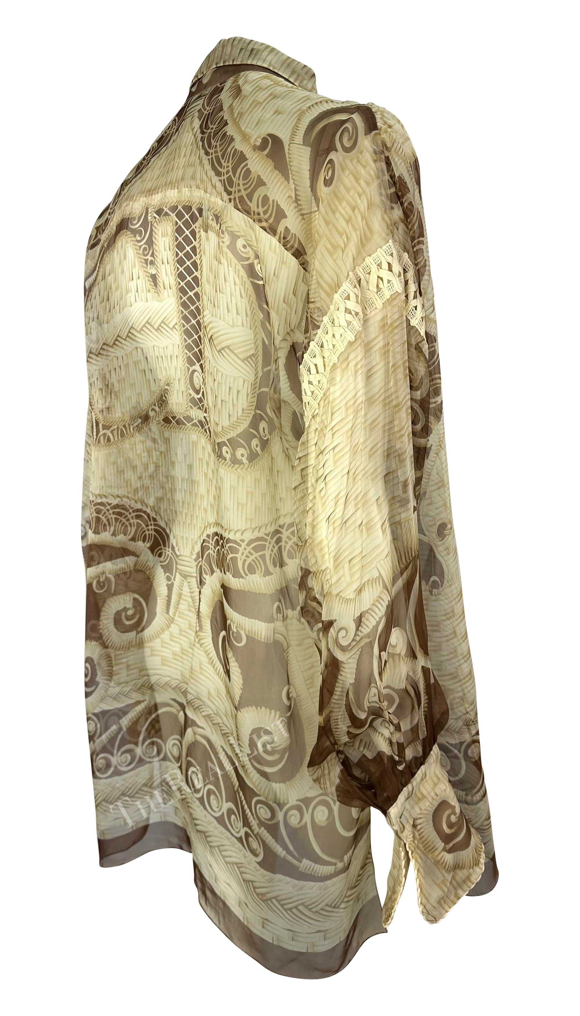 From the Spring/Summer 1995 collection, this tan sheer Christian Dior monogram blouse designed by Gianfranco Ferré debuted on the runway, modeled by Carla Bruni. Covered in a scrolling wicker pattern, this chic button-up collared blouse features a large 'CD' monogram on the back.