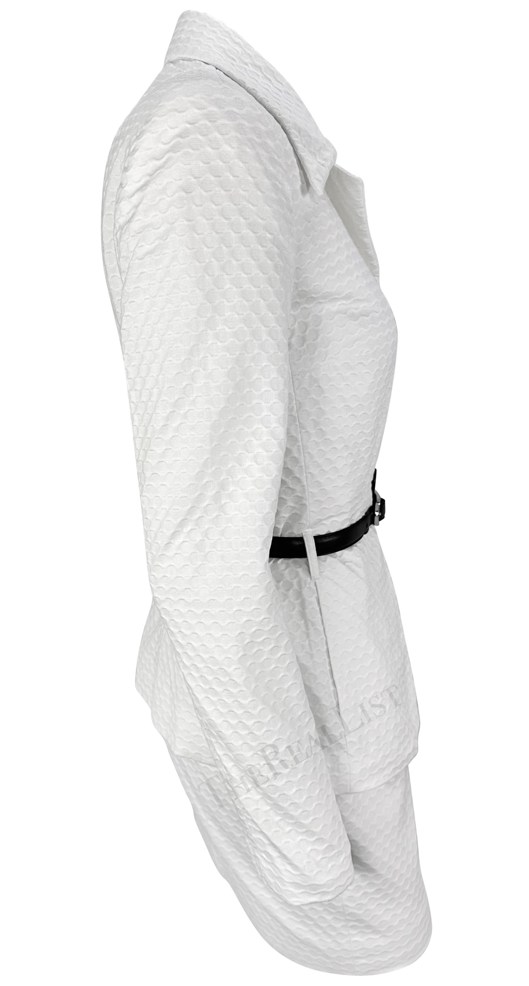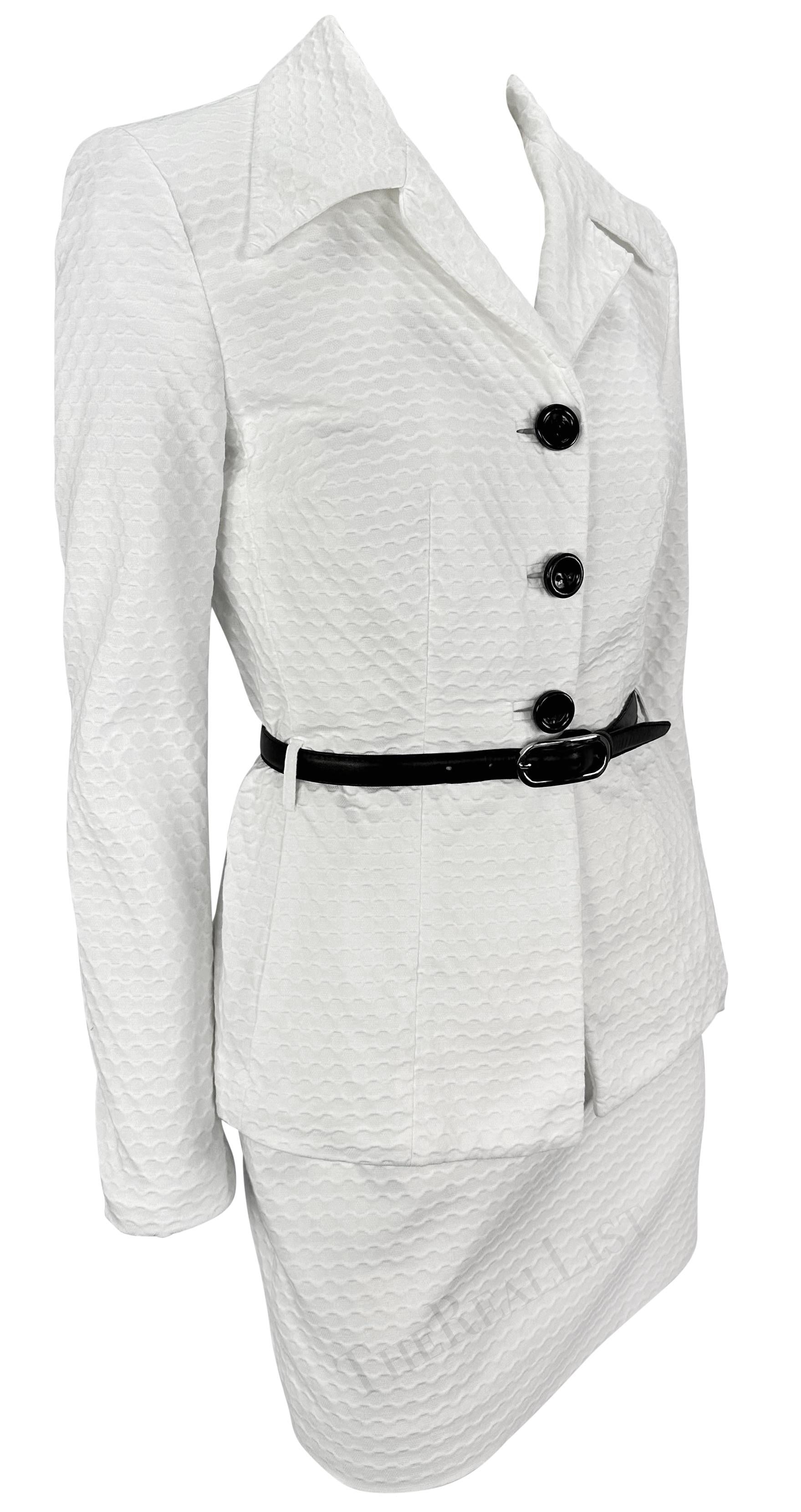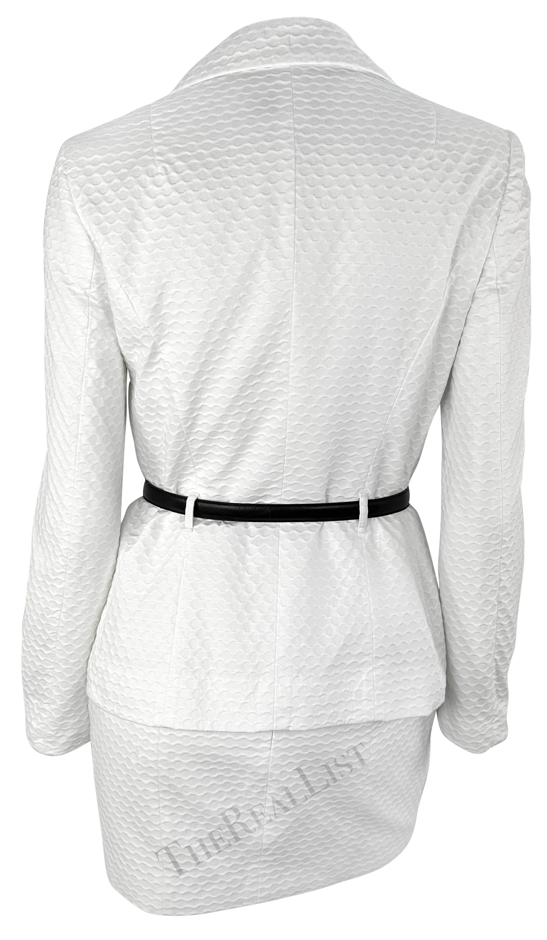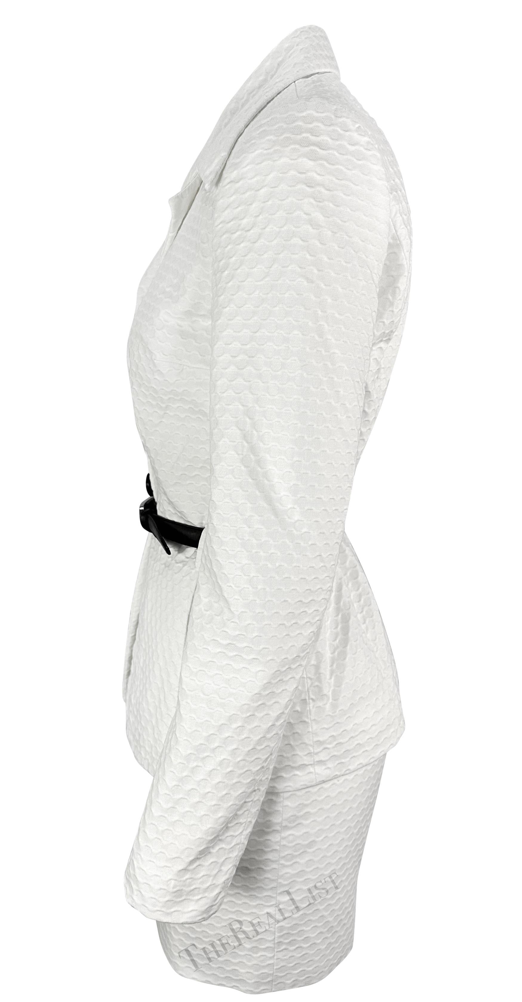 From the Spring/Summer 1995 Dolce & Gabbana collection, the longer version of this white waffle knit mini-skirt suit debuted on the season's runway, modeled by Amber Valletta. This three-piece suit set comprises a textured blazer with a matching skirt and black leather belt. The blazer features three large round black buttons, a pointed collar, and a honeycomb-shaped waffle knit, perfectly matching the mini skirt.