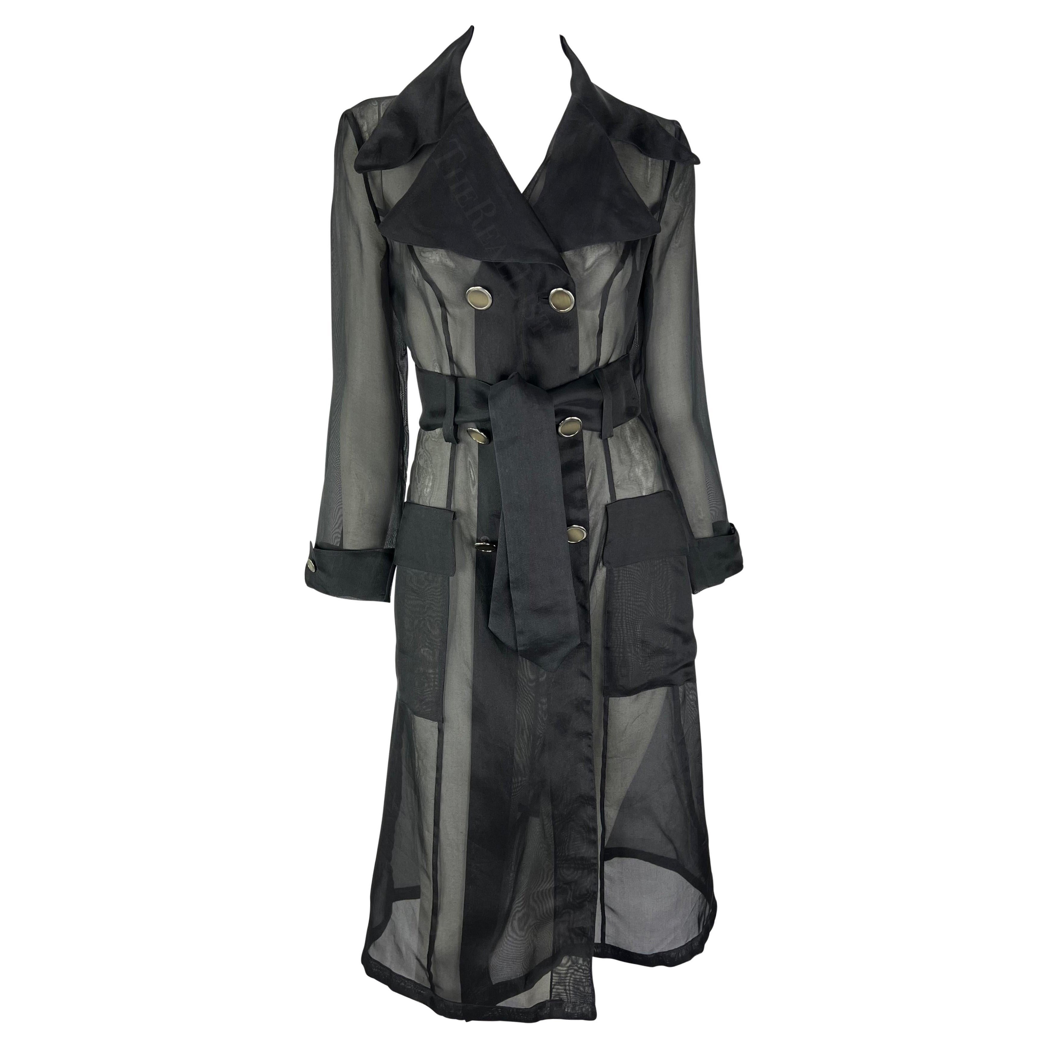 Presenting a fabulous black sheer Dolce & Gabbana trench coat. From the Spring/Summer 1995 collection, this coat debuted on the season's runway on Carla Bruni. This classic trench coat is constructed entirely of sheer black silk and is made complete with silver-tone buttons at the cuffs and double-breasted closure. Whether layered or worn with little to nothing underneath, this unique Dolce & Gabbana trench coat is the perfect addition to any wardrobe or collection!