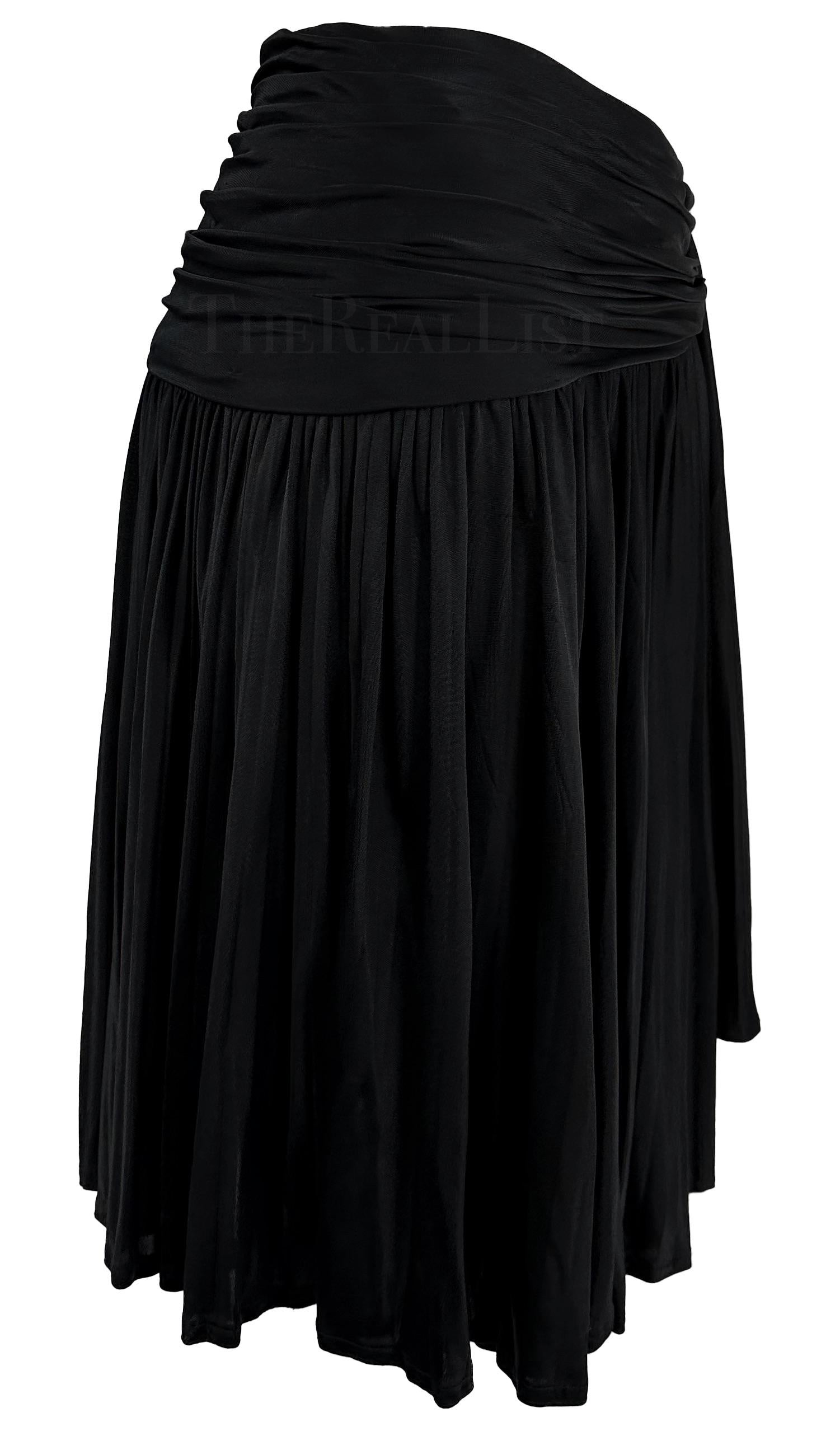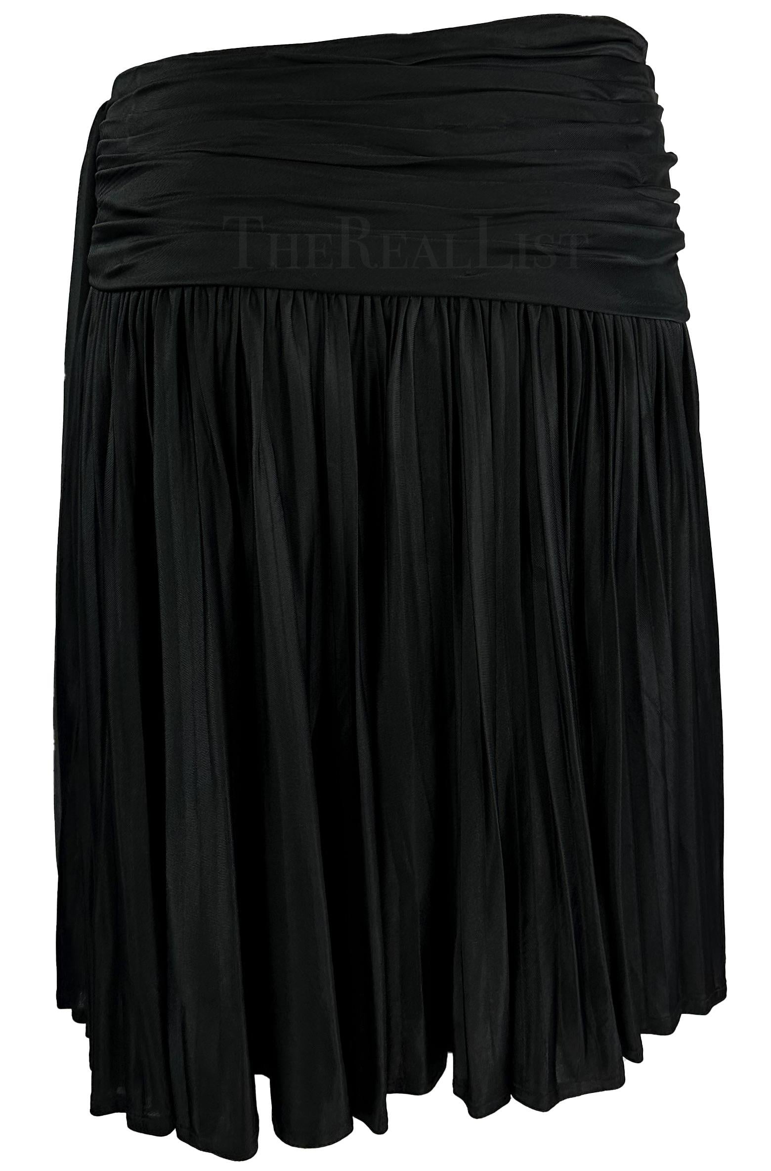 This black pleated Gianni Versace wrap-style skirt was designed by Gianni Versace for his Spring/Summer 1995 collection. This pleated flare skirt is made complete with an asymmetrical wrap design at the waist.