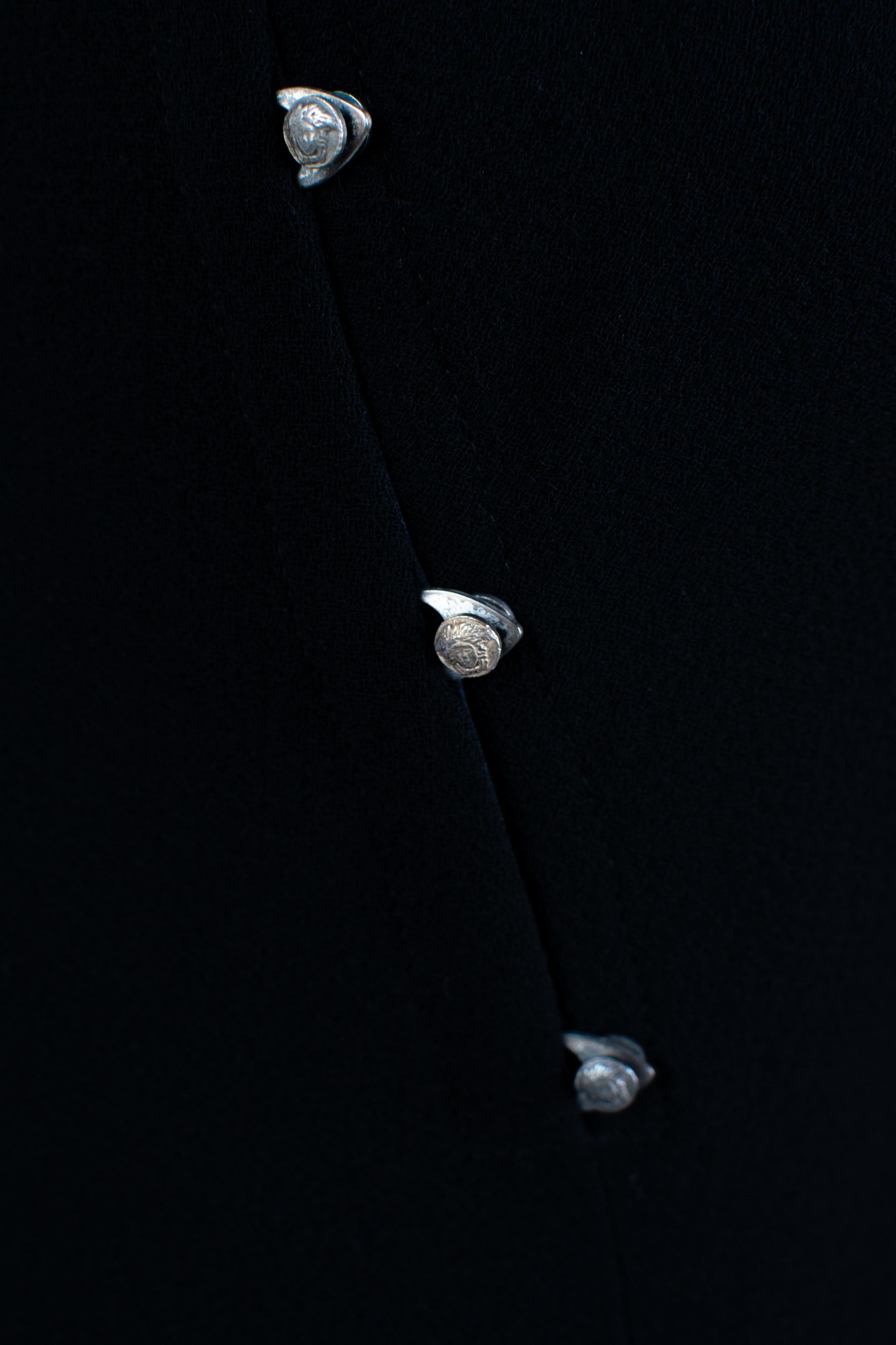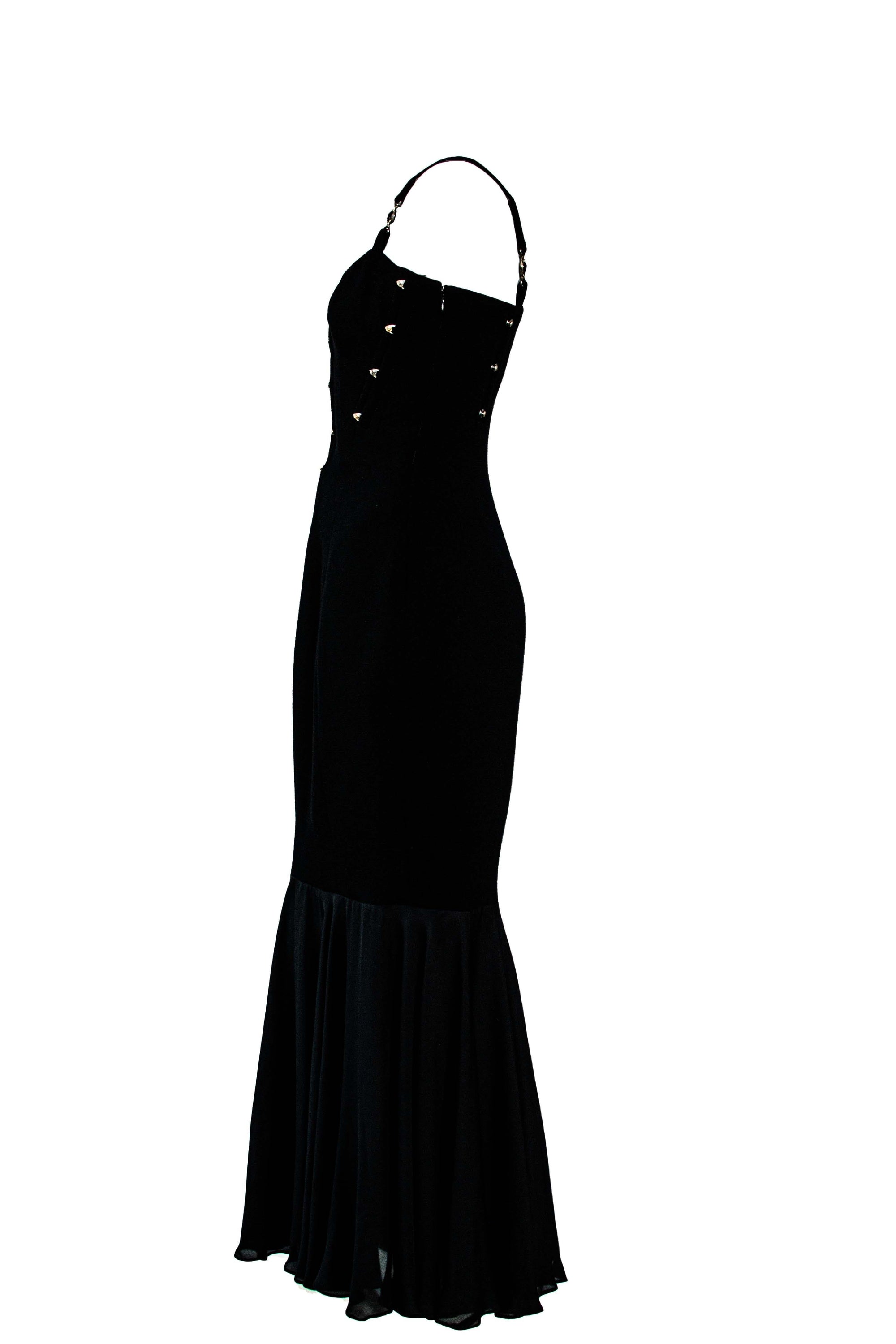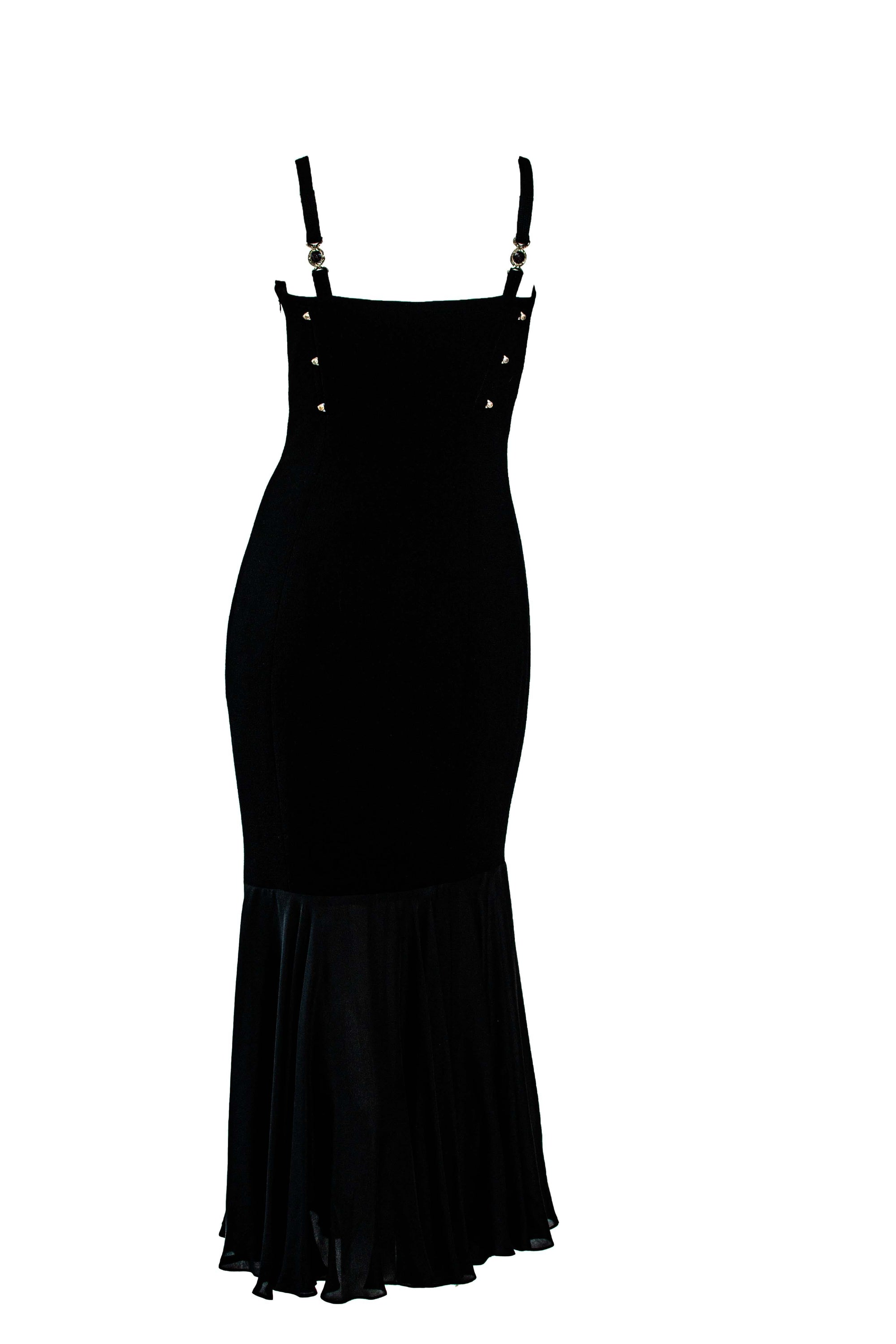 Gianni Versace designed this black number for his Spring/Summer 1995 collection and stuns with a form-fitting body cut and a flared hem. The upper body features eyelets on both the front and back with Medusa heads, which help to sculpt the dress; this design is present on many garments from this collection. The straps feature Versace Medusa emblems on both the front and back. A stunner, dresses like this with meticulous design and quality are a rarity!