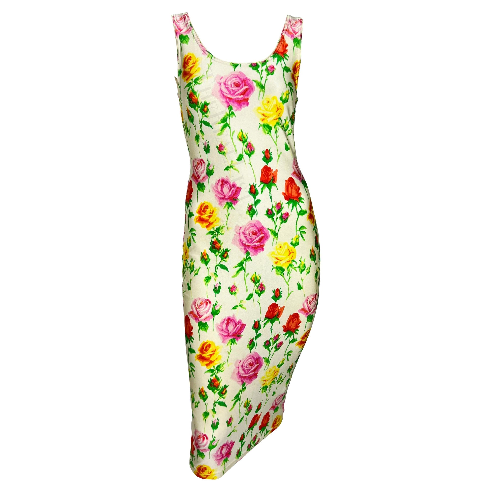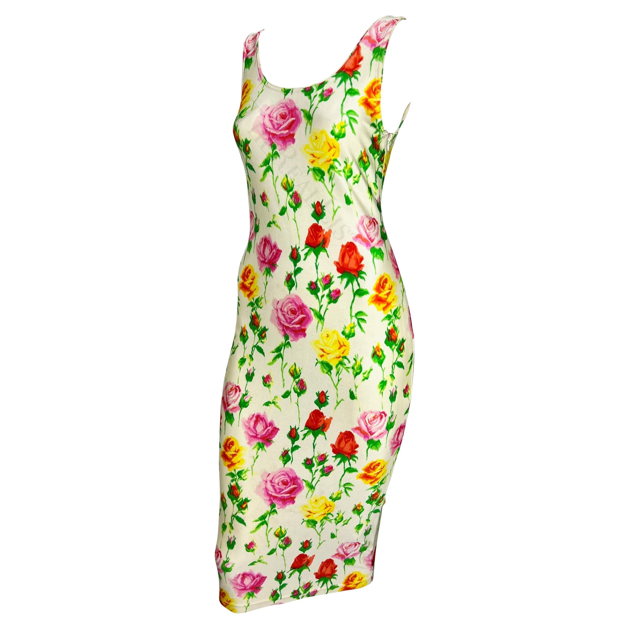 Presenting an incredible creme rose print Gianni Versace body con dress, designed by Gianni Versace. From the Spring/Summer 1995 collection, this dress debuted as part of look 27, modeled by Karen Mulder. The dress was also highlighted in the season's ad campaign, modeled by Kristen McMenamy and captured by Richard Avedon. Covered in a multi-color rose print, this sleeveless dress features a scoop neckline and a midi cut. The perfect 1990s runway dress, this Gianni Versace masterpiece is a must-have addition to any wardrobe.
