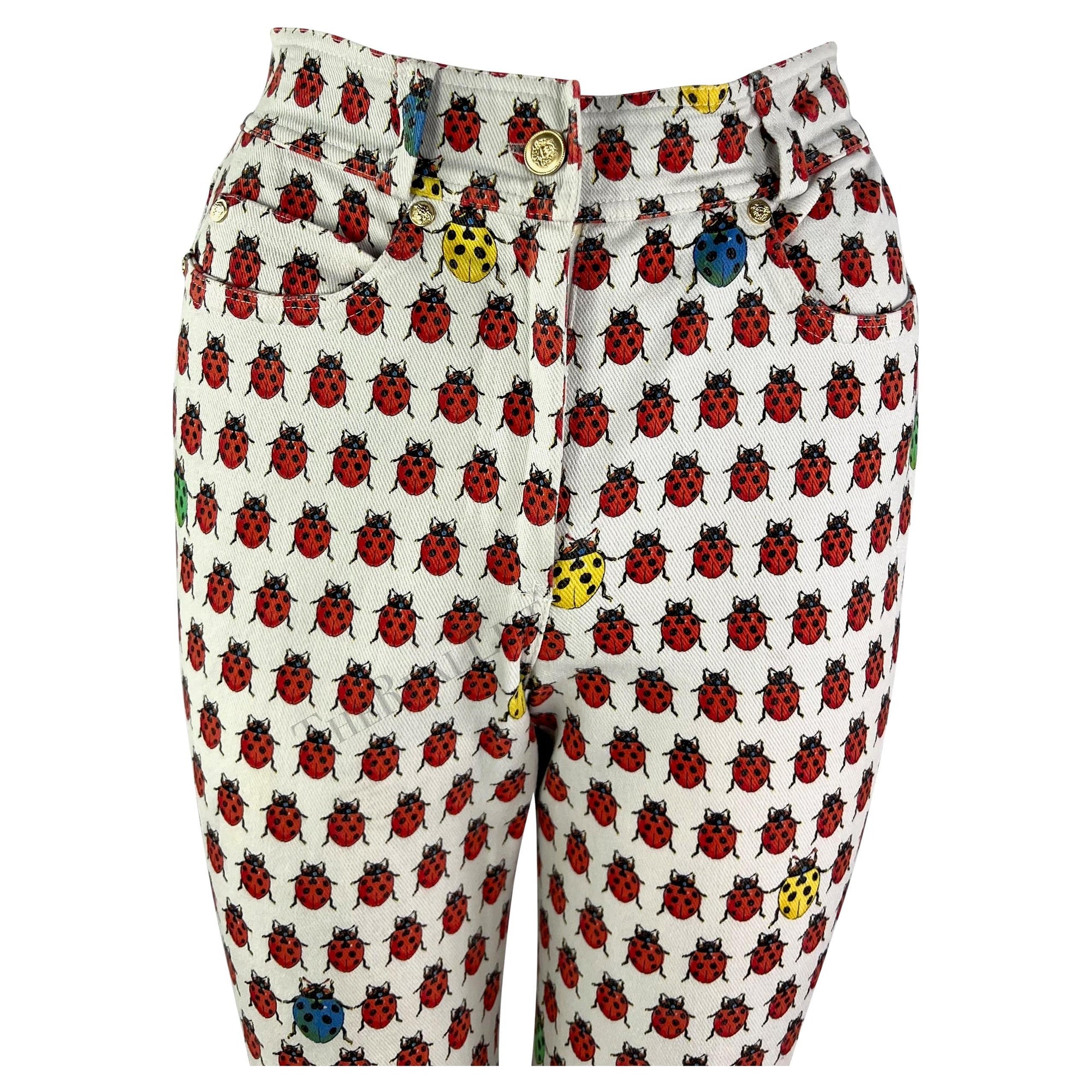Presenting a pair of white ladybug print Gianni Versace jeans, designed by Gianni Versace. From the Spring/Summer 1995 collection, these high-waisted tapered pants are covered in multi-colored ladybugs, a print that first debuted on the season's runway and has since become a house code. A fabulous addition to any collection or wardrobe, these Gianni Versace jeans are the perfect encapsulation of 1990s Versace.