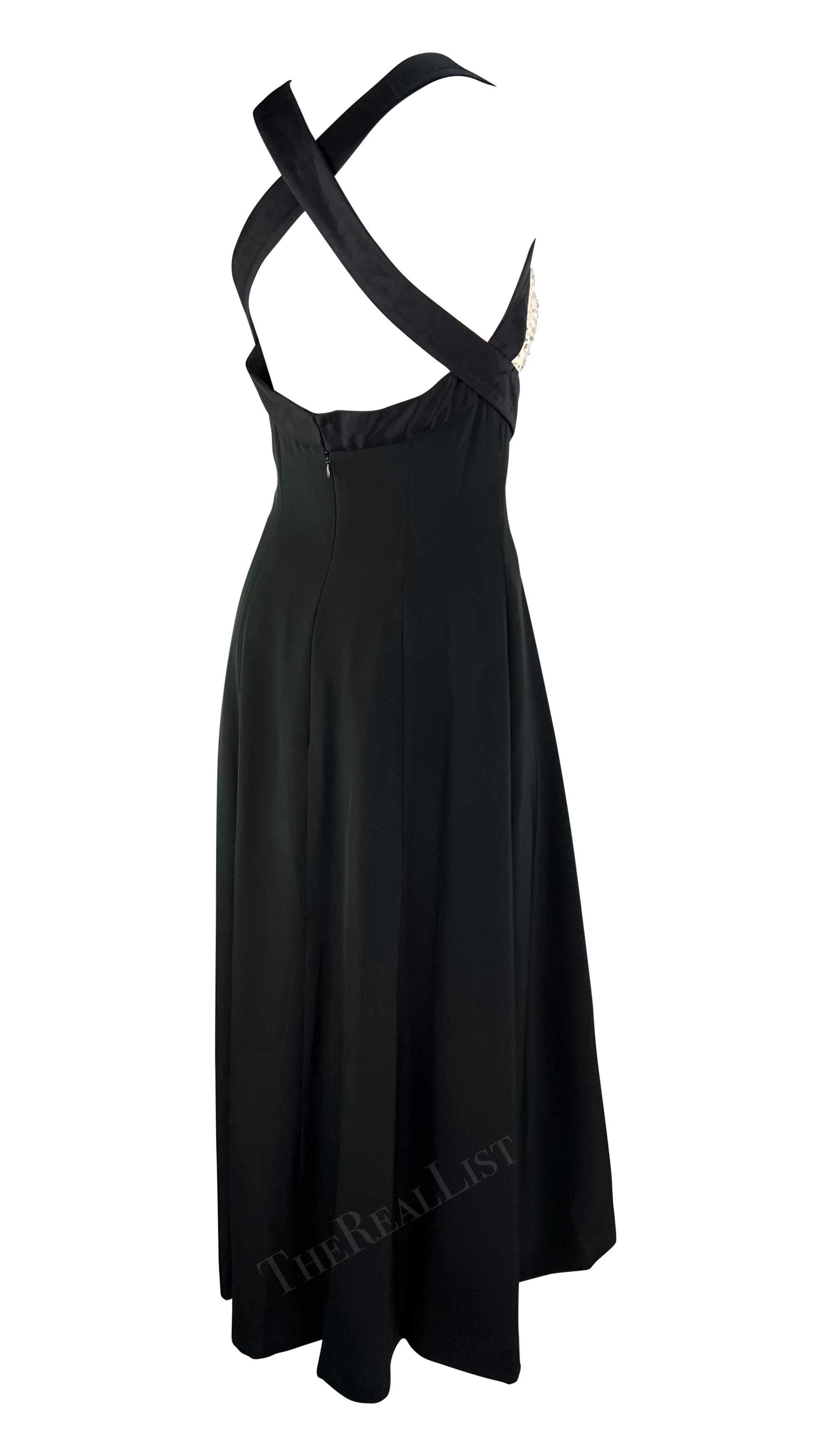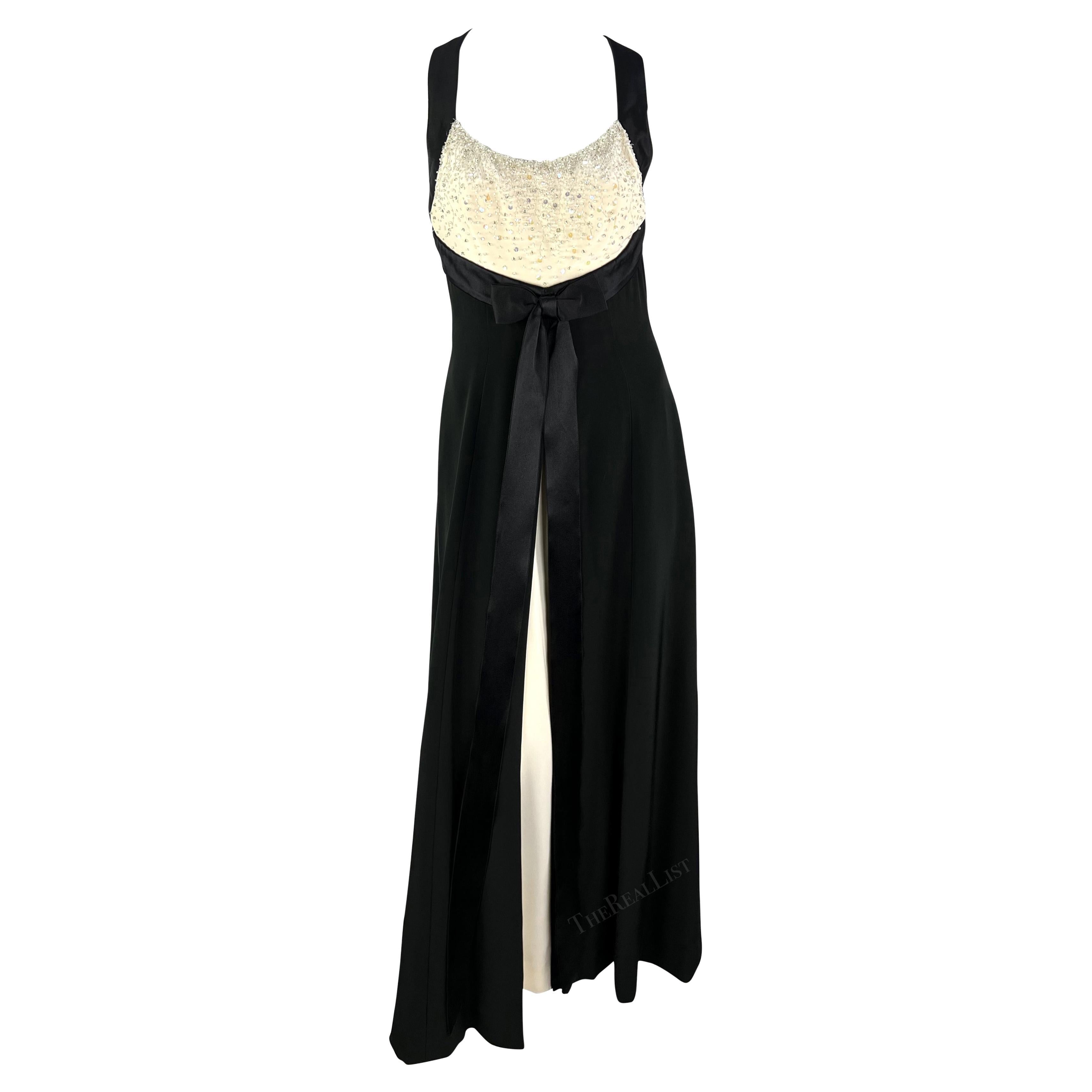 Presenting a gorgeous black and white Jacques Fath gown. From the Spring/Summer 1995 collection, this gown debuted on the season's runway, modeled by Yasmeen Ghauri. Meticulously crafted by hand, this demi-couture masterpiece showcases all the exquisite details of a true haute couture garment. The sleeveless gown features a scoop neckline, a bow below the bust, and wide shoulder straps that wrap over the shoulders and cross over the semi-exposed back. The dress is made complete with a large slit at the front revealing the inner white skirt and hand-embellished beads and sequins at the bust. This stunning handmade Jacques Fath gown is the perfect timeless addition to any wardrobe!
