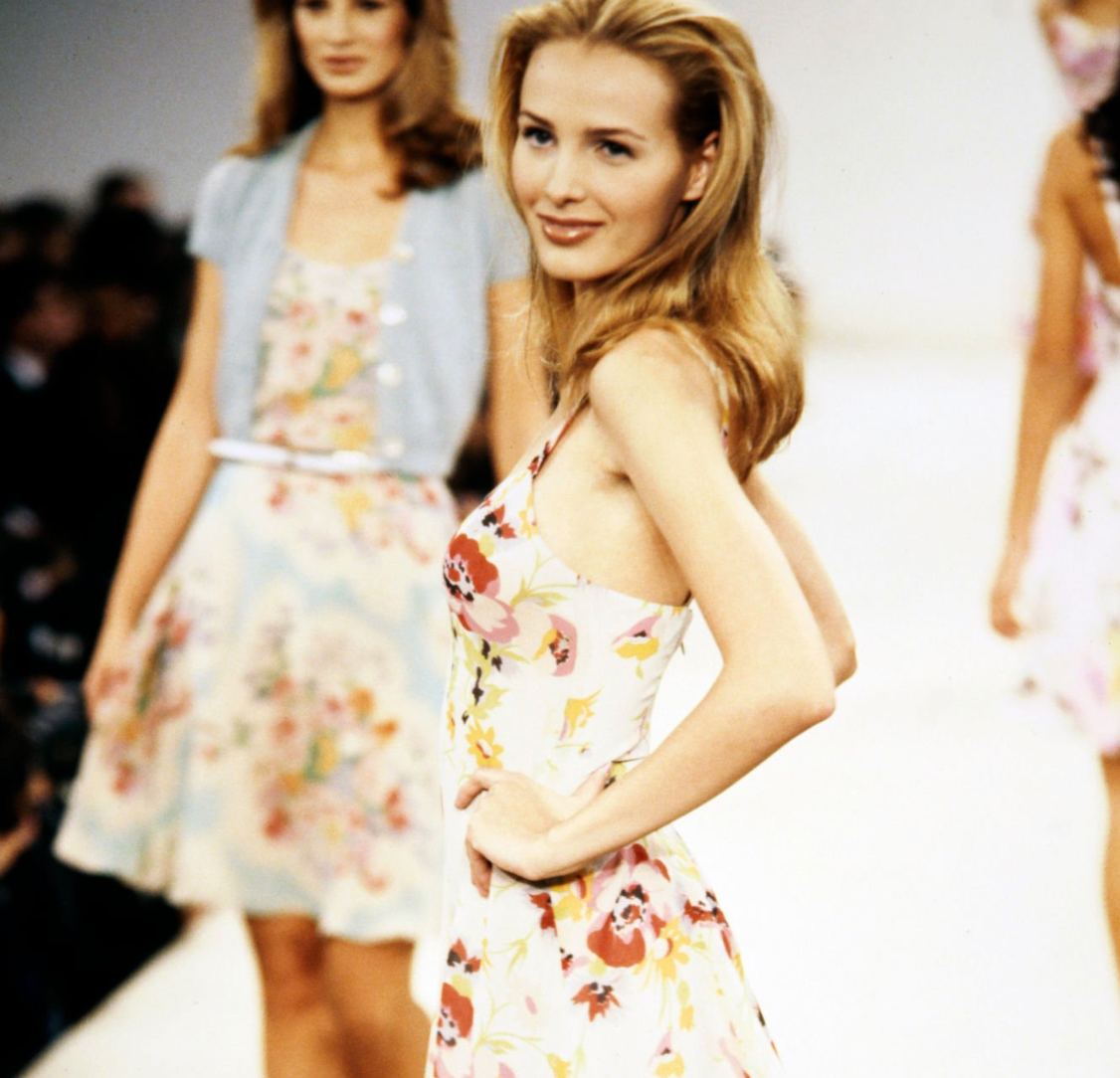 From Ralph Lauren’s Spring/Summer 1995 collection, this off-white crepe silk mini dress features a vibrant floral print in shades of pink, red, and yellow. The silhouette is defined by a scoop neckline, fitted bodice, and softly flared skirt. A variation of this design debuted on the season’s runway.