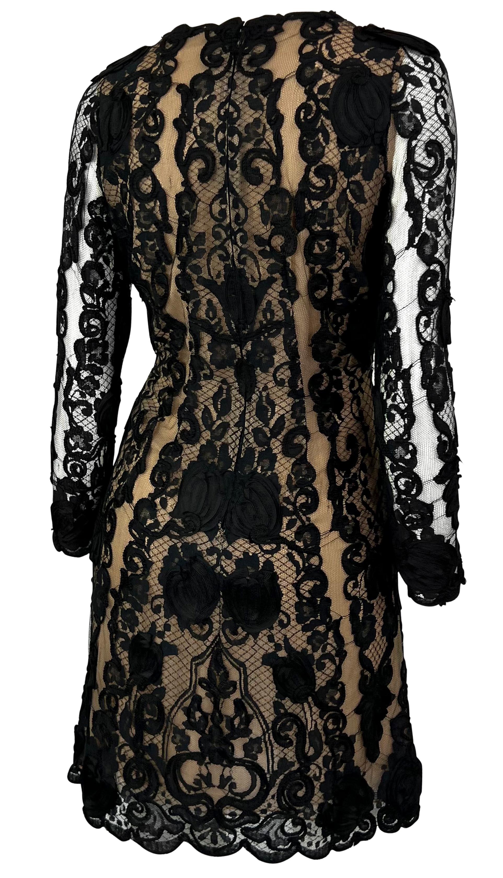 This Bill Blass dress from the Spring/Summer 1996 collection features intricate black ribbon lace over a tan lining, creating a striking contrast. The long-sleeved design debuted on the season's runway and showcases a fitted silhouette with a scalloped hem and neckline, highlighting the detailed floral lace pattern.