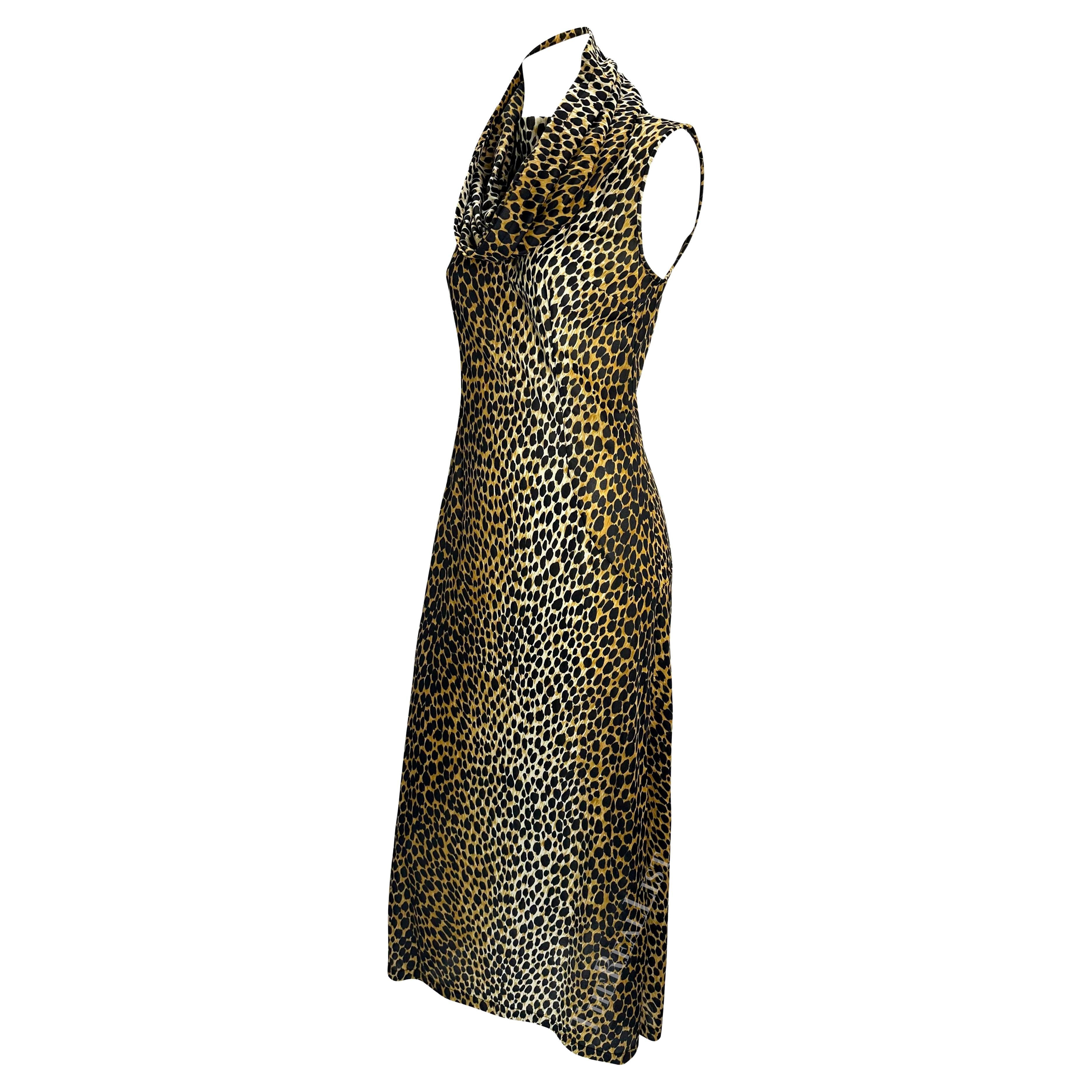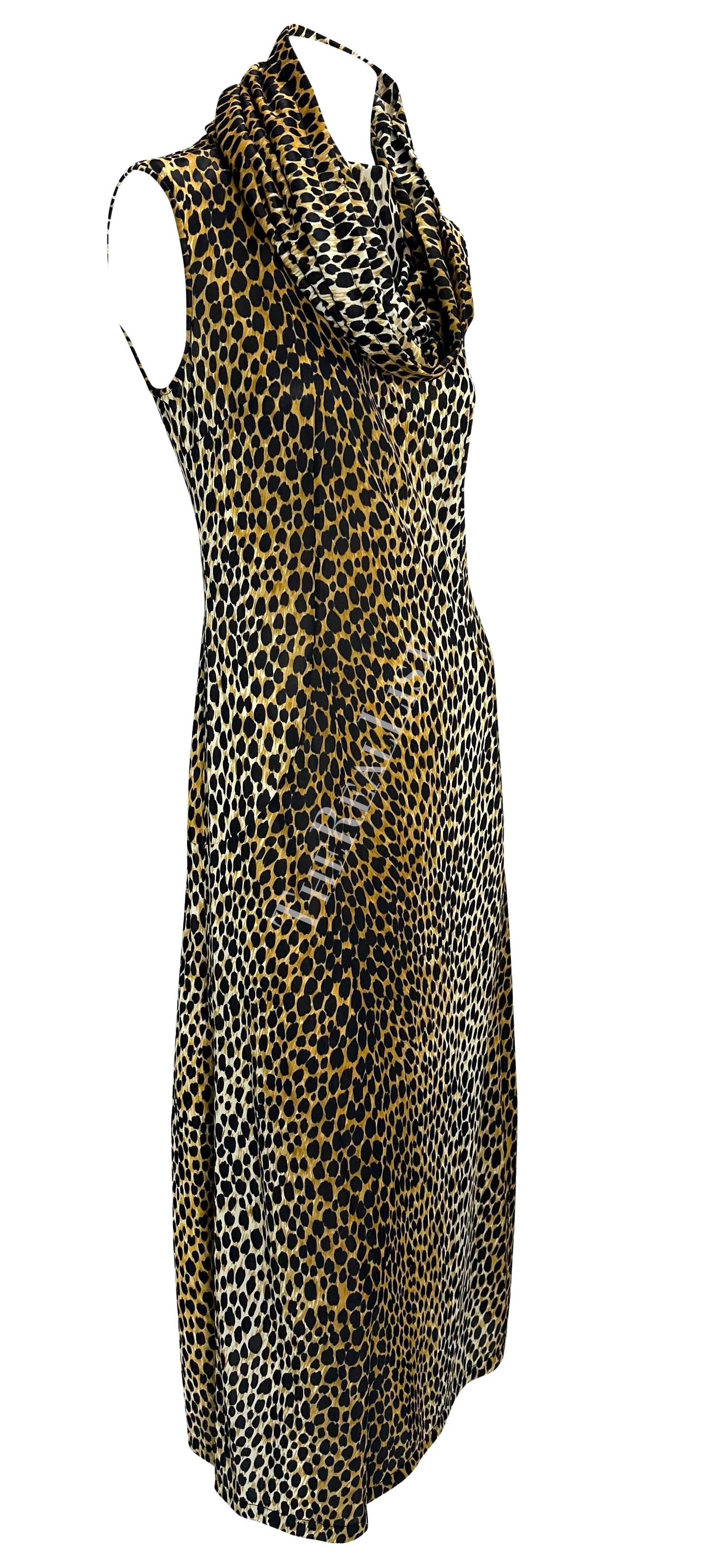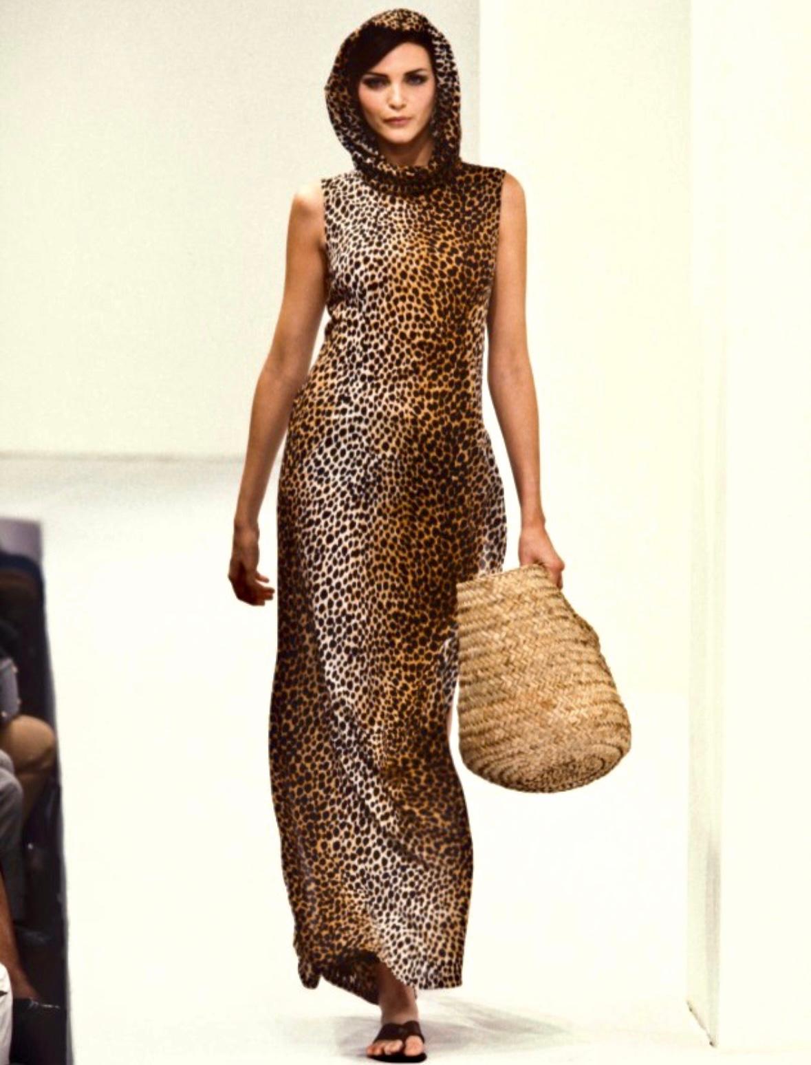 This cheetah print hooded dress from Dolce & Gabbana’s Spring/Summer 1996 collection was modeled on the runway by Nadja Auermann and appeared in the season’s ad campaign on Linda Evangelista, photographed by Steven Meisel. Inspired by Monica Vitti’s timeless style in the 1960 Italian film L’Avventura, the collection was described by the designers as “the Sicilian holiday of a glamorous socialite.” This sleeveless column dress is covered in cheetah print, with slits at both sides, and a hood that can be worn up or gathered into a cowl neckline. A striking archival Dolce & Gabbana piece, it captures the house’s iconic 1990s vision of Italian summer glamour.