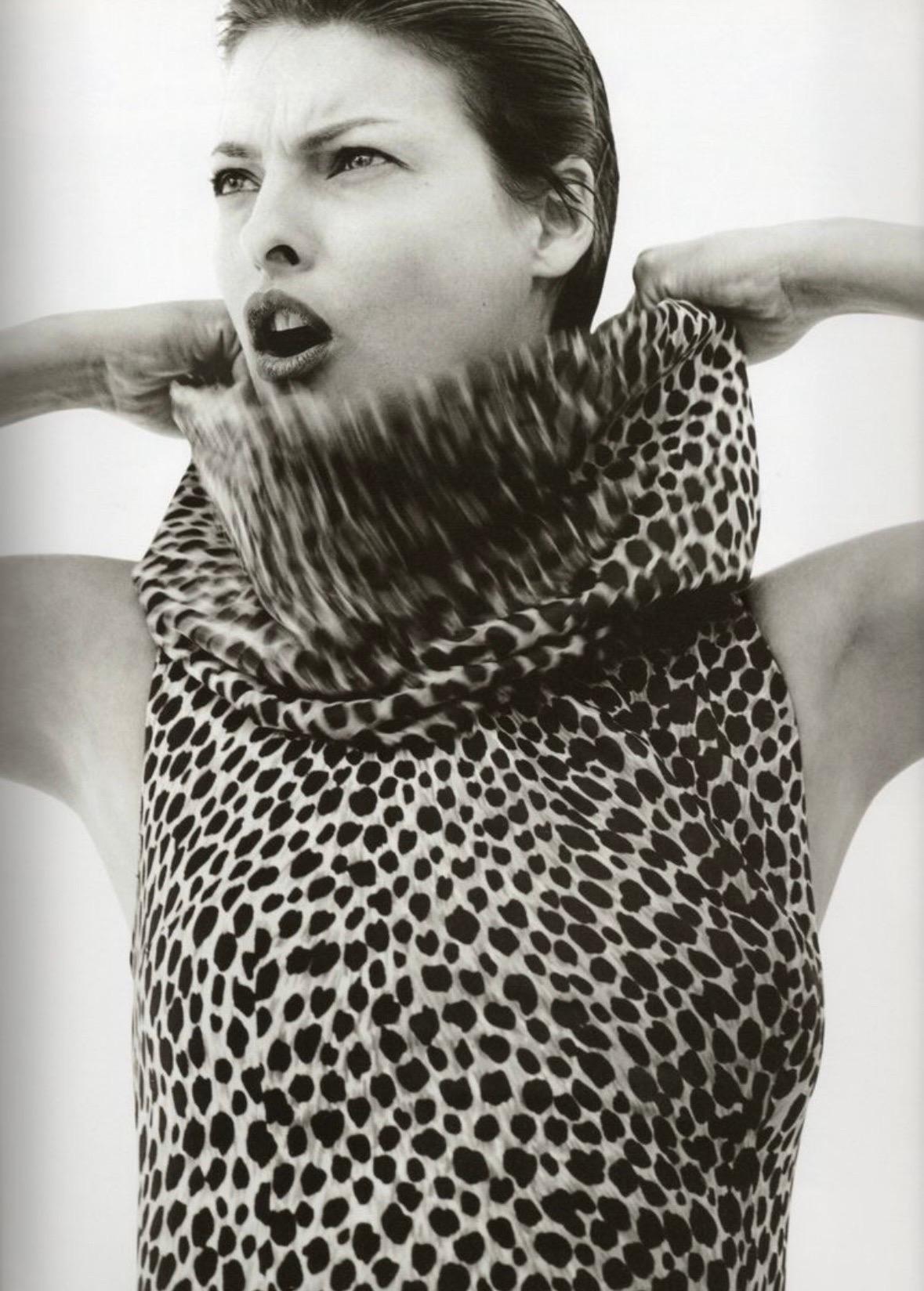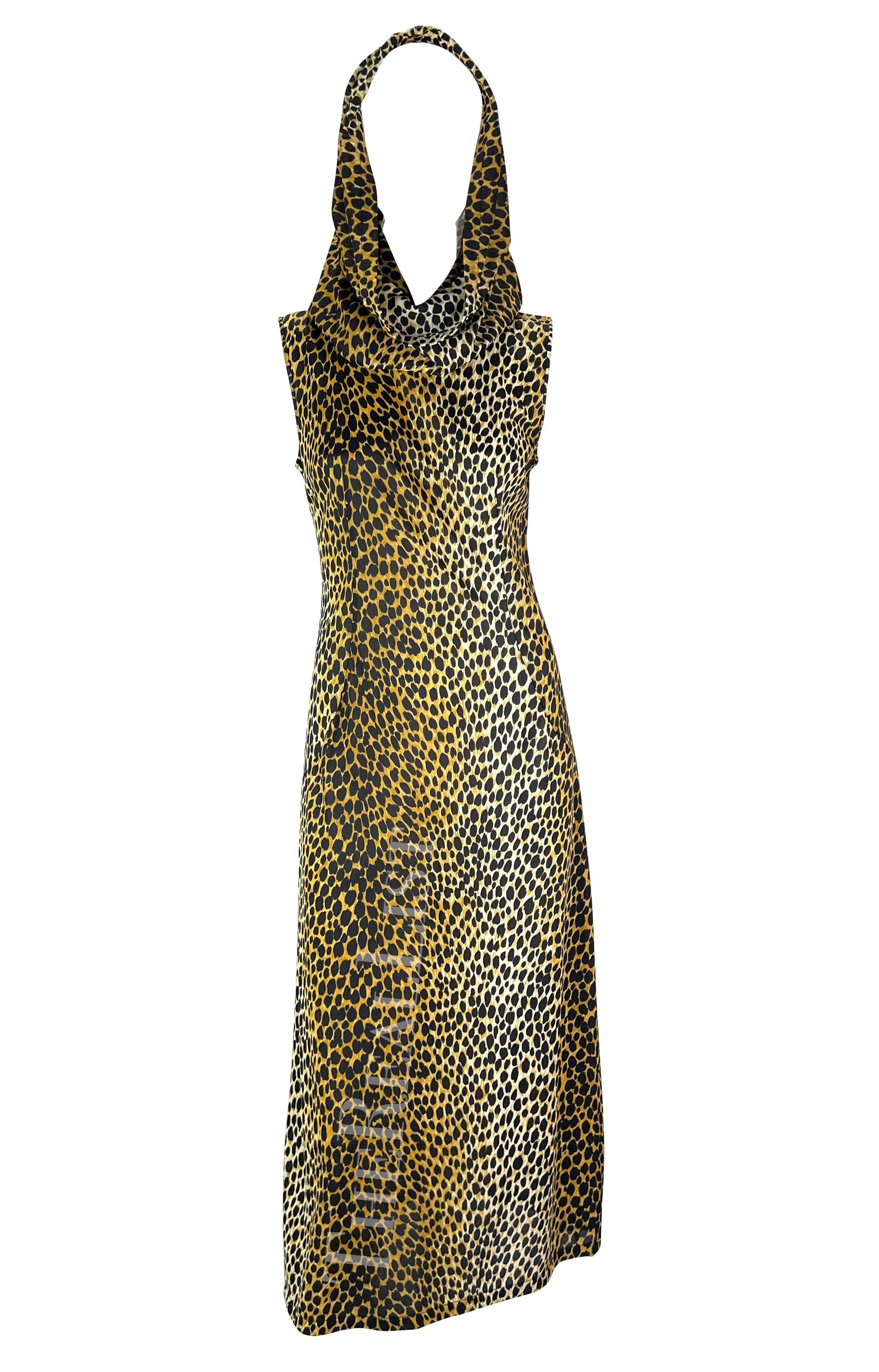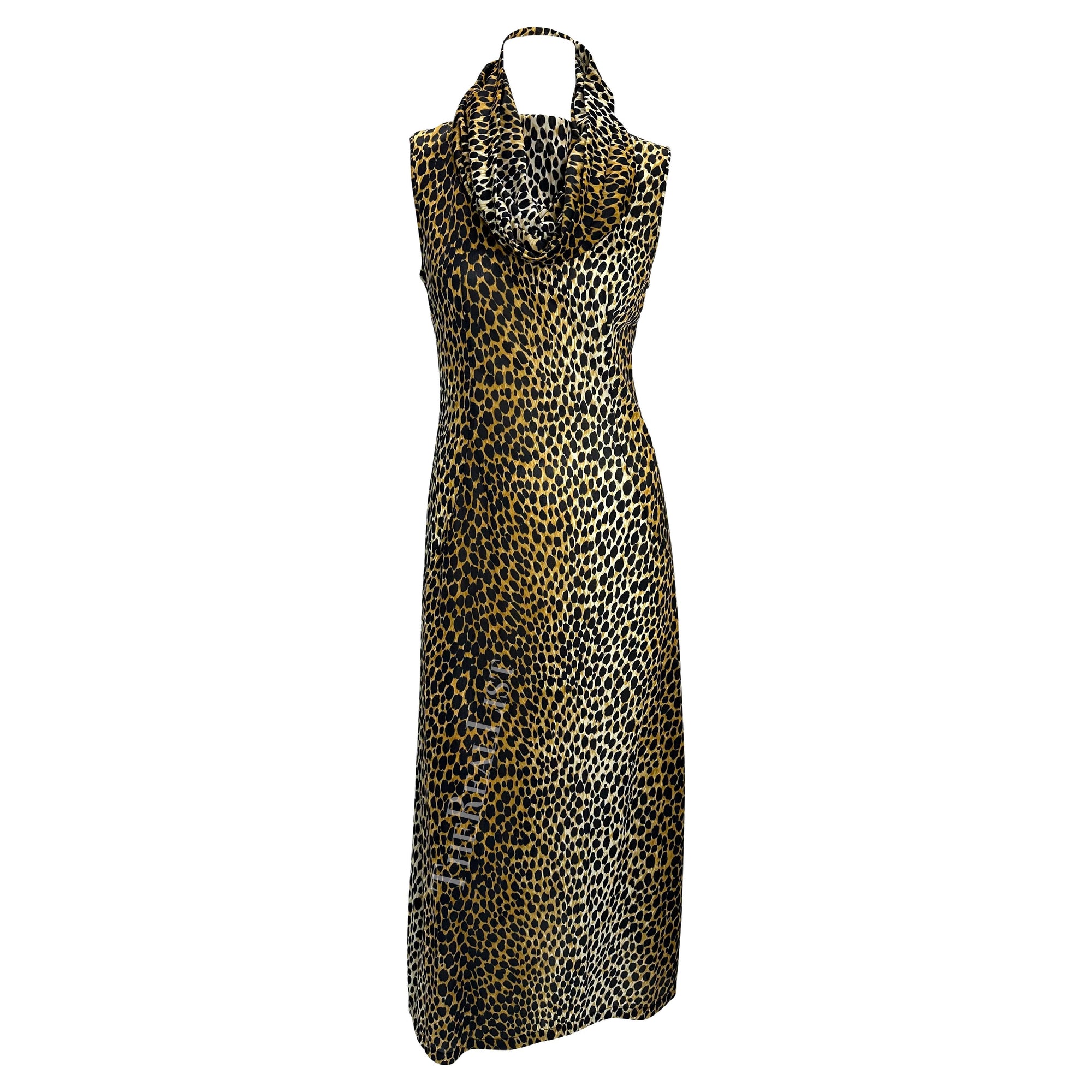 This cheetah print hooded dress from Dolce & Gabbana’s Spring/Summer 1996 collection was modeled on the runway by Nadja Auermann and appeared in the season’s ad campaign on Linda Evangelista, photographed by Steven Meisel. Inspired by Monica Vitti’s timeless style in the 1960 Italian film L’Avventura, the collection was described by the designers as “the Sicilian holiday of a glamorous socialite.” This sleeveless column dress is covered in cheetah print, with slits at both sides, and a hood that can be worn up or gathered into a cowl neckline. A striking archival Dolce & Gabbana piece, it captures the house’s iconic 1990s vision of Italian summer glamour.