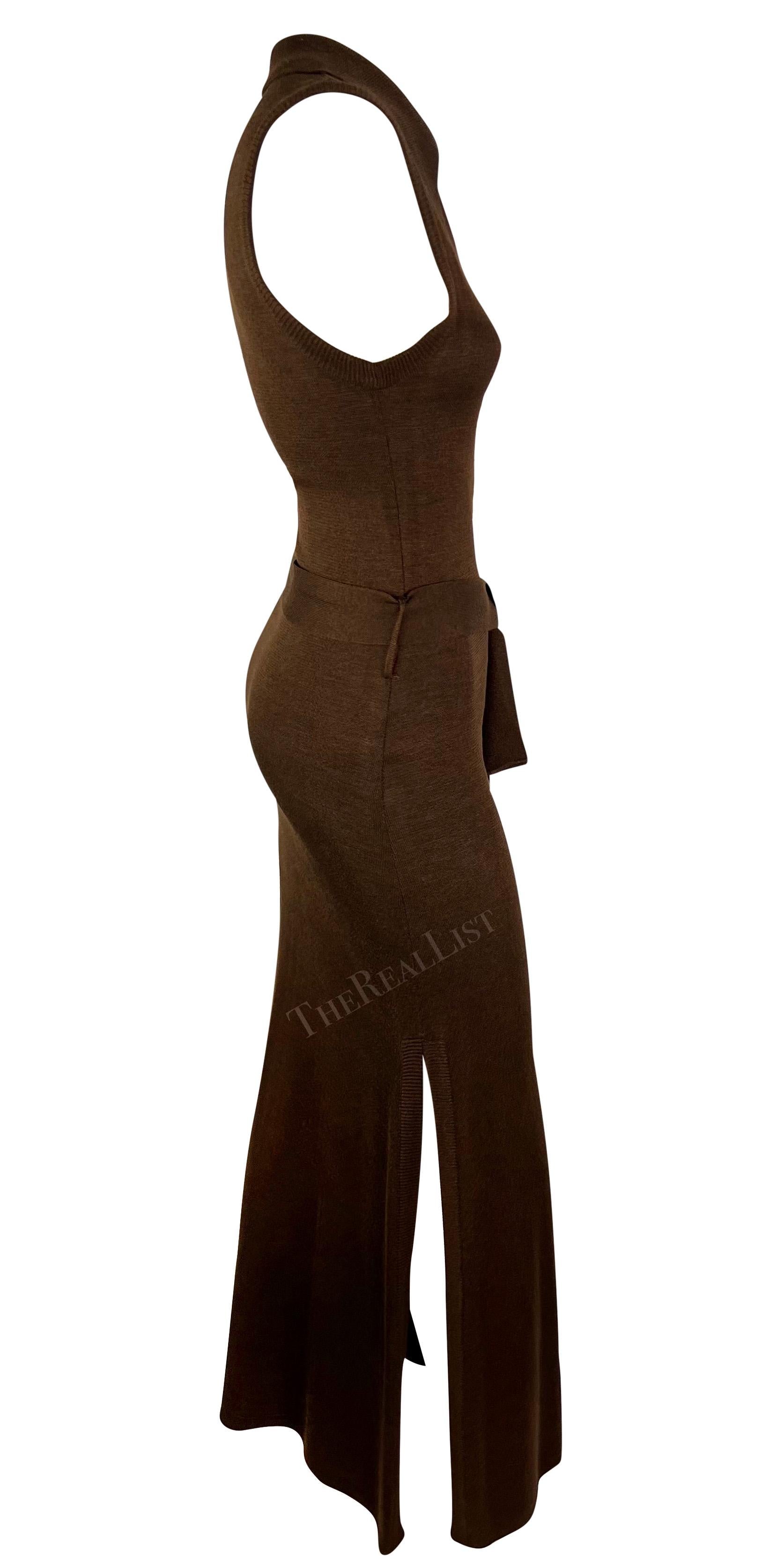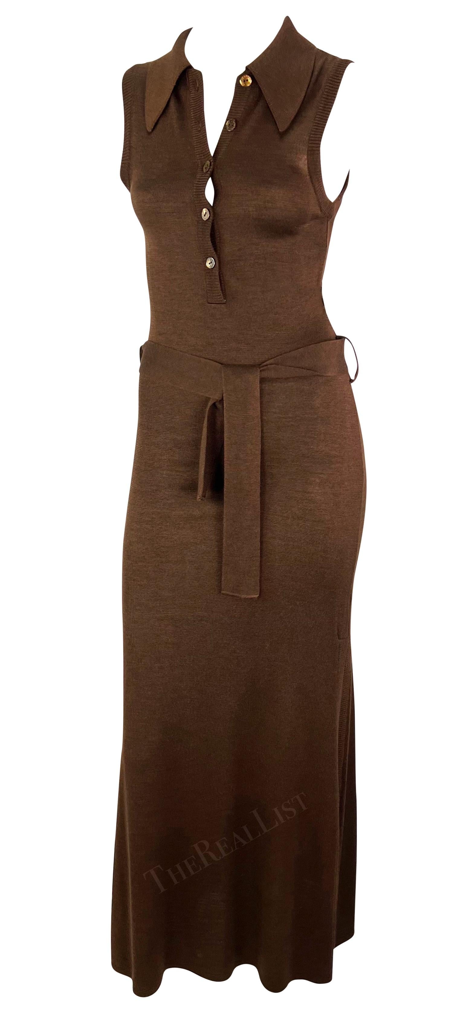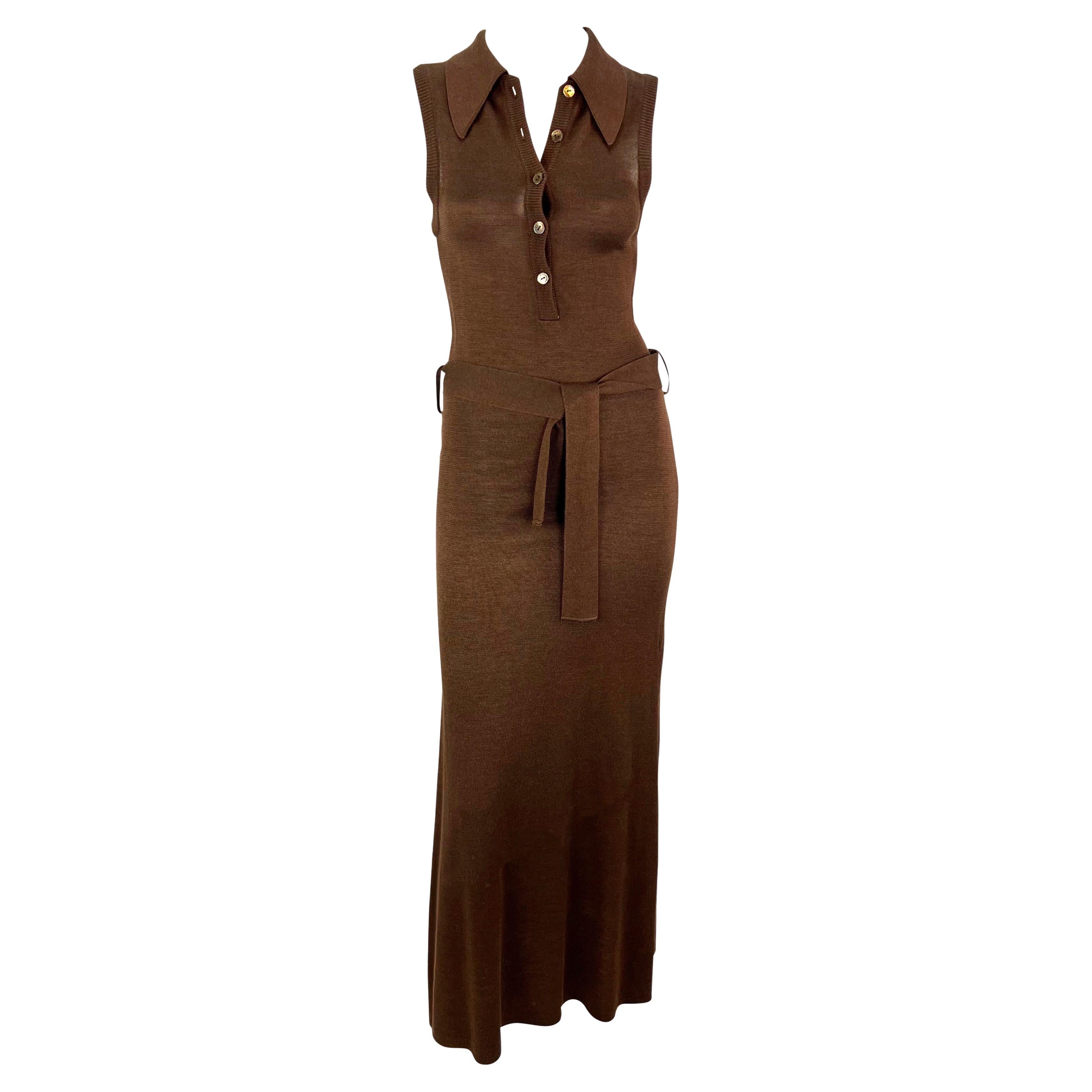 S/S 1996 Dolce & Gabbana Runway Brown Knit Bodycon Belted Maxi Collared Dress