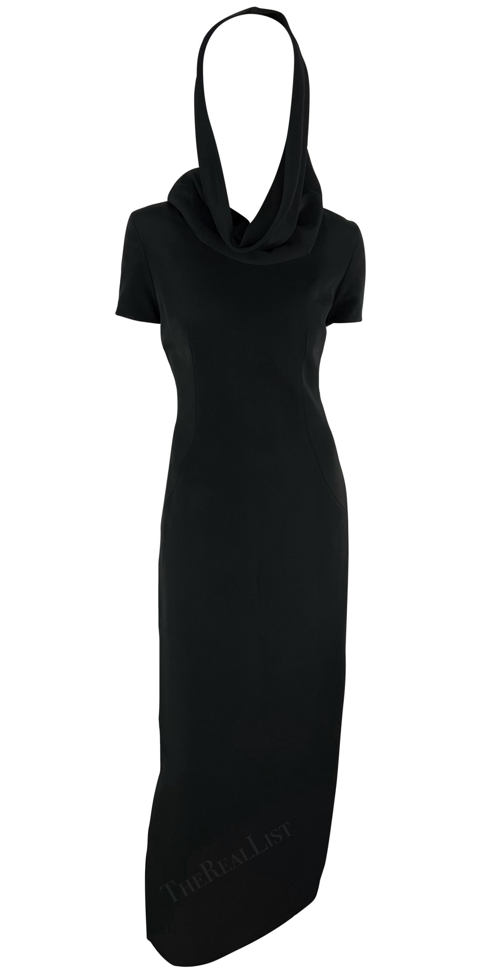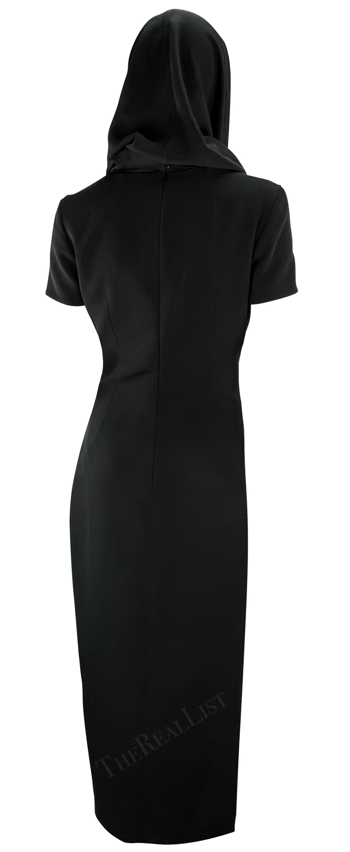 From the Spring/Summer 1996 collection, this gorgeous black Dolce & Gabbana maxi dress debuted on the season's runway, modeled by Kirsty Hume. This nearly floor-length gown features short sleeves, high slits on either side, and is made complete with an oversized cowl neck that doubles as a hood. The idea for this collection was found in the timeless style of Monica Vitti in the 1960 Italian classic film, L'Aventura. The resulting Italian summer looks were described by Stefano and Domenico as "the Sicilian holiday of a glamorous socialite. She's going shopping with a headscarf and a basket, in a long black tabard dress, or a tiger-stripe or leopard-spot beach caftan." Add this iconic and documented Dolce and Gabbana runway dress to your collection!