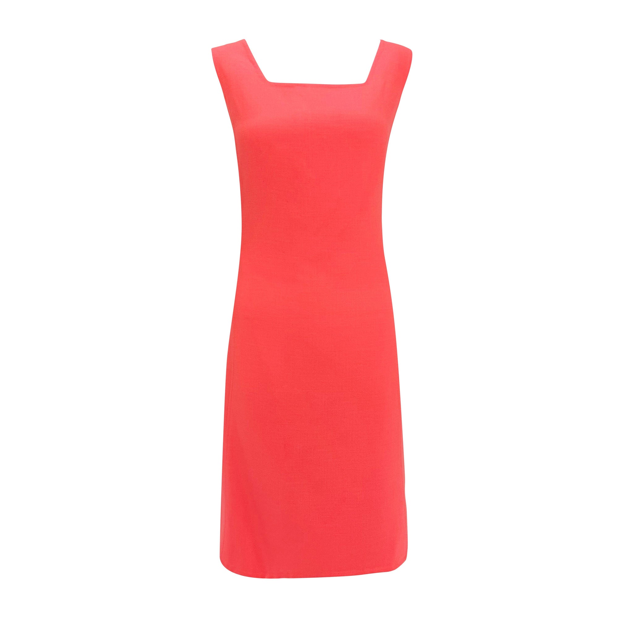 From Donna Karan’s Spring/Summer 1996 collection, this bright pink set includes a fluid stretch wool overcoat and a fitted sheath dress. The overcoat is designed with a softly draped open front, relaxed shoulders, and clean, unstructured lines that create an effortless silhouette. The matching dress features a minimalist square neckline, a tailored bodice, and a straight skirt that falls just below the knee. A coat and skirt version of this ensemble debuted on the season’s runway.