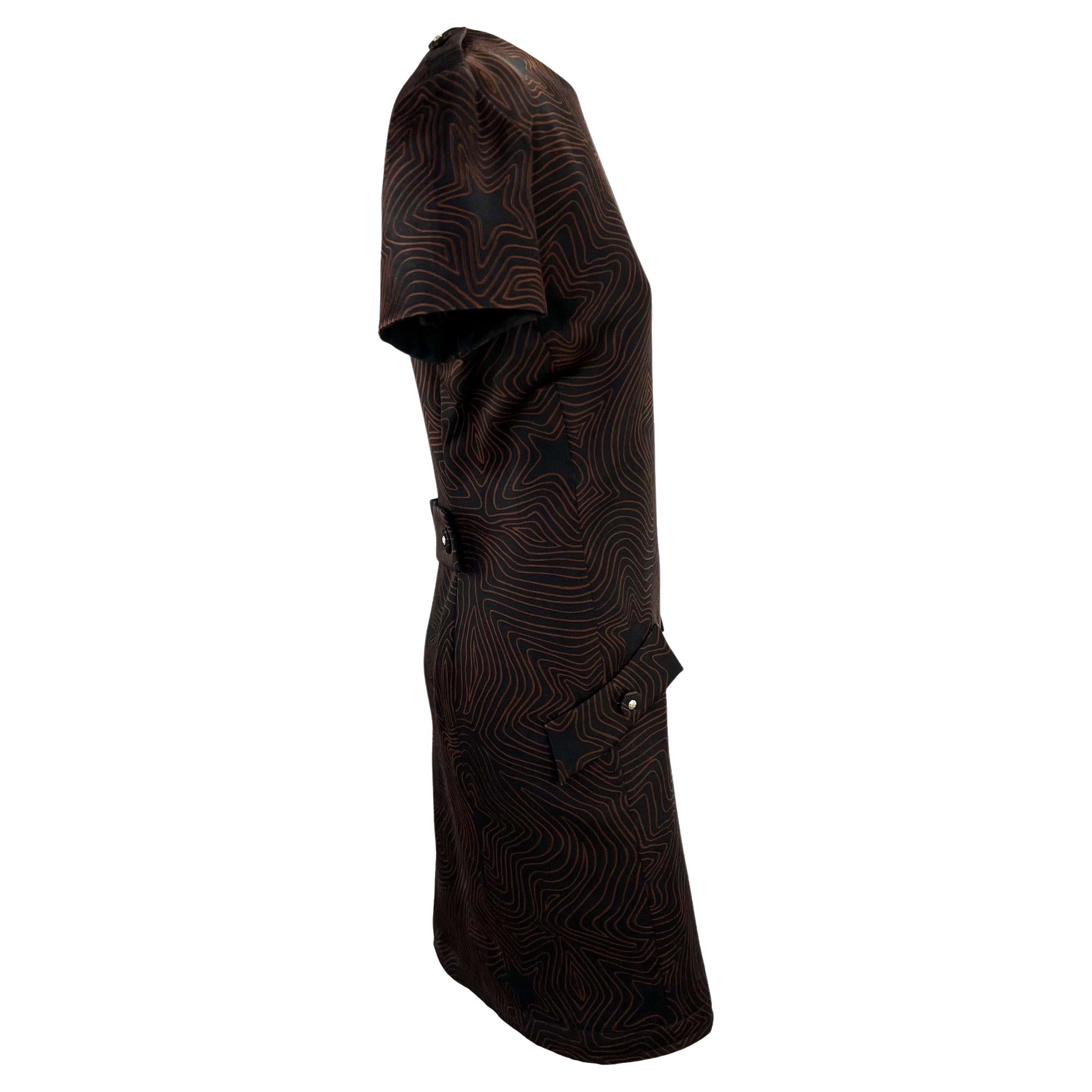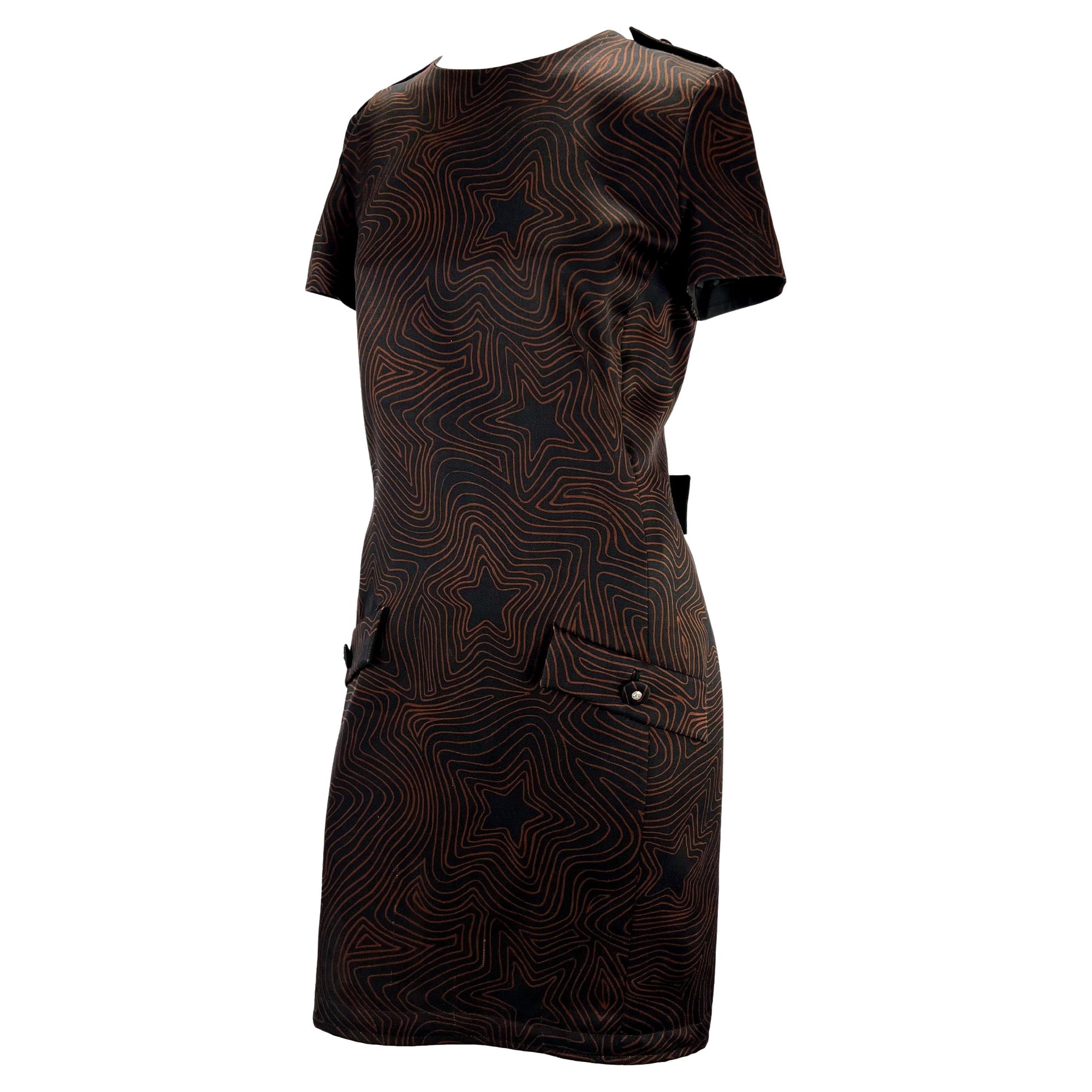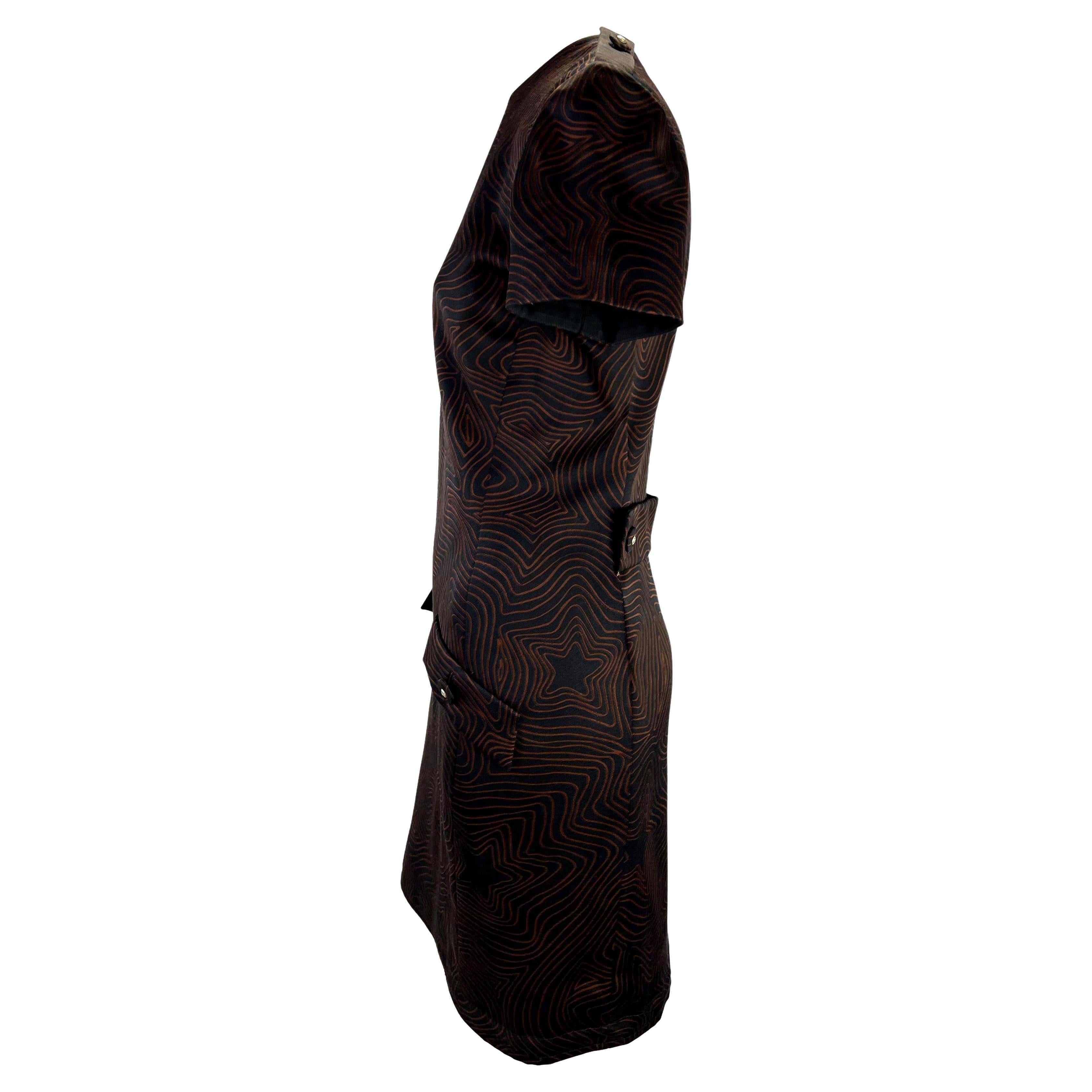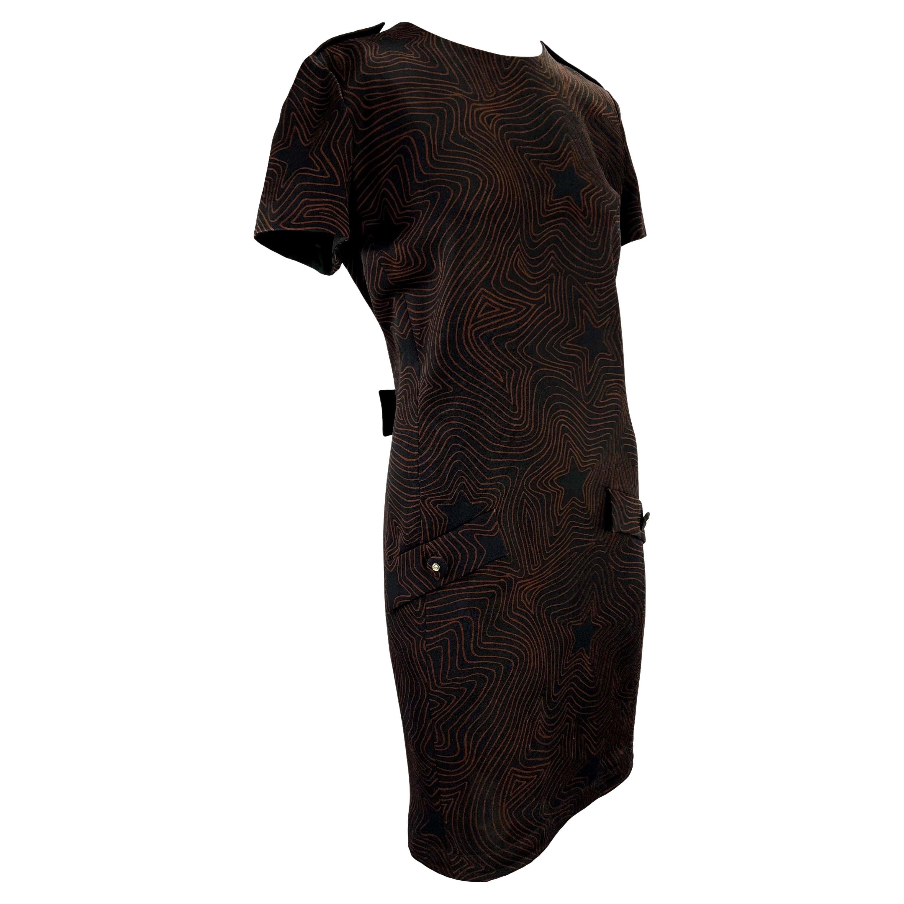 Presenting a beautiful brown star-print Gianni Versace Couture dress designed by Gianni Versace. From the Spring/Summer 1996 collection, this short-sleeve dress is covered in a star pattern with a ripple effect. This pattern was heavily used in the corresponding Atelier Versace Spring collection. The dress features two front hip pockets, epaulets, and a band accent at the lower back. Each of these details is secured with Versace Medusa buttons. A fabulous and fun piece, this is the perfect addition to any wardrobe or collection!