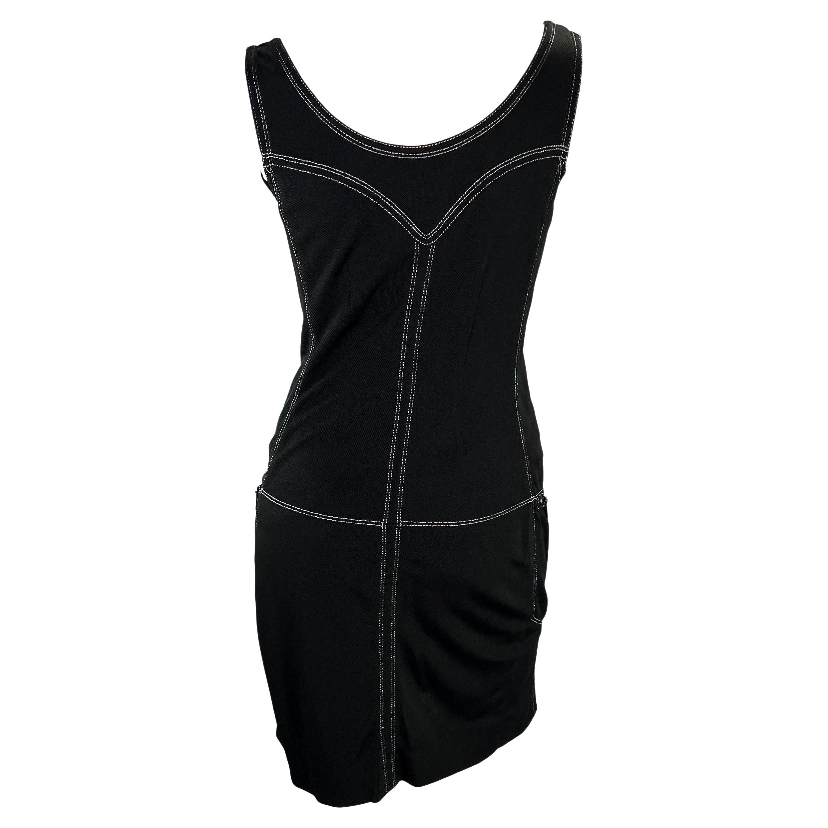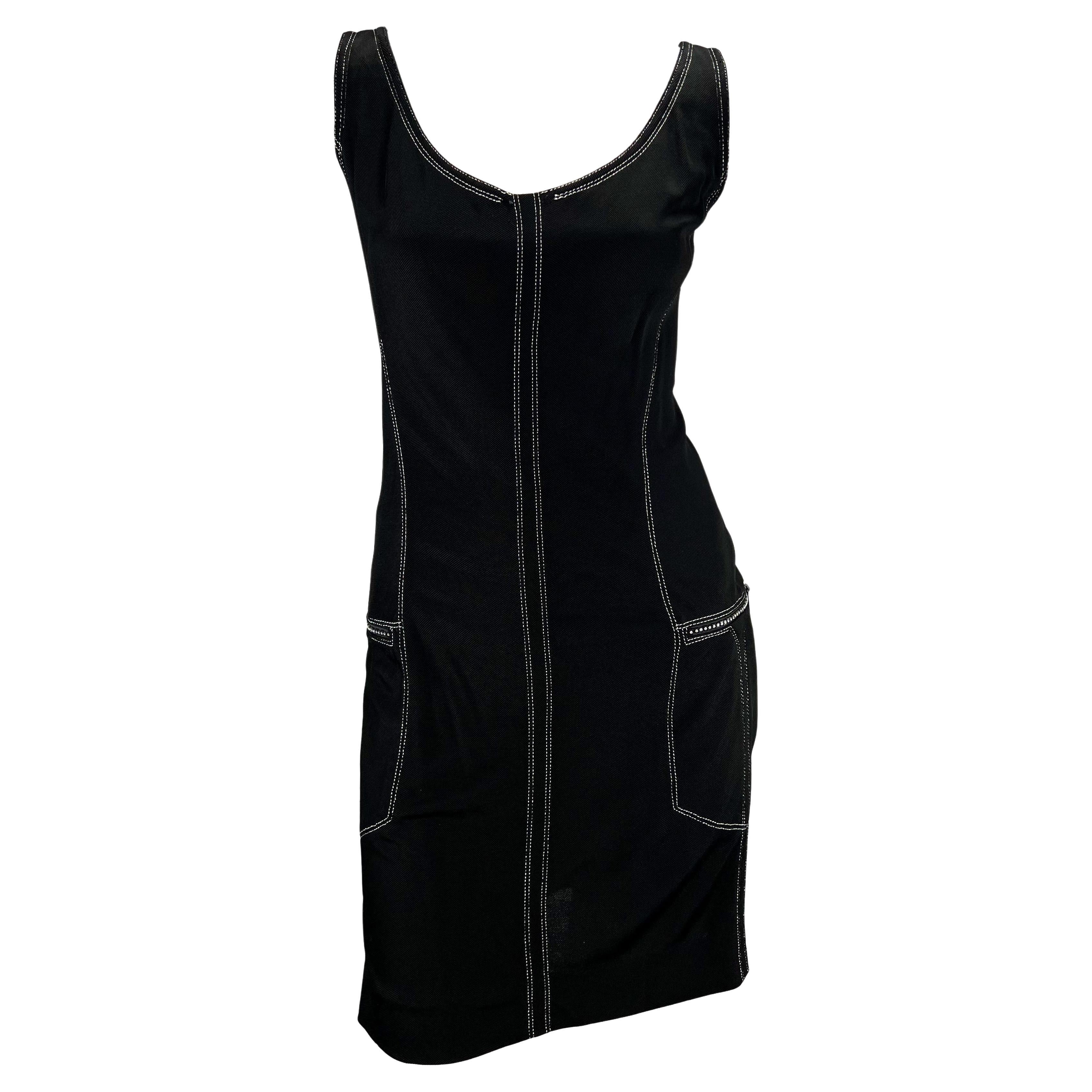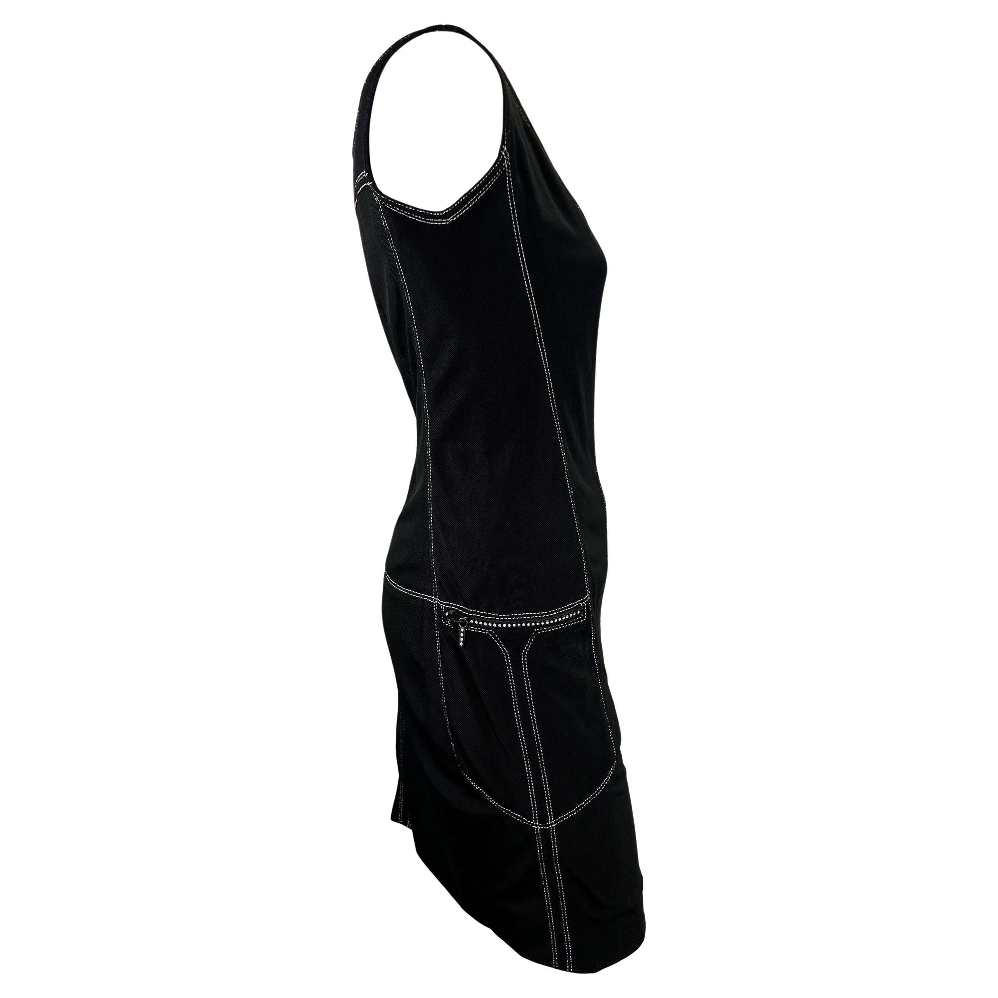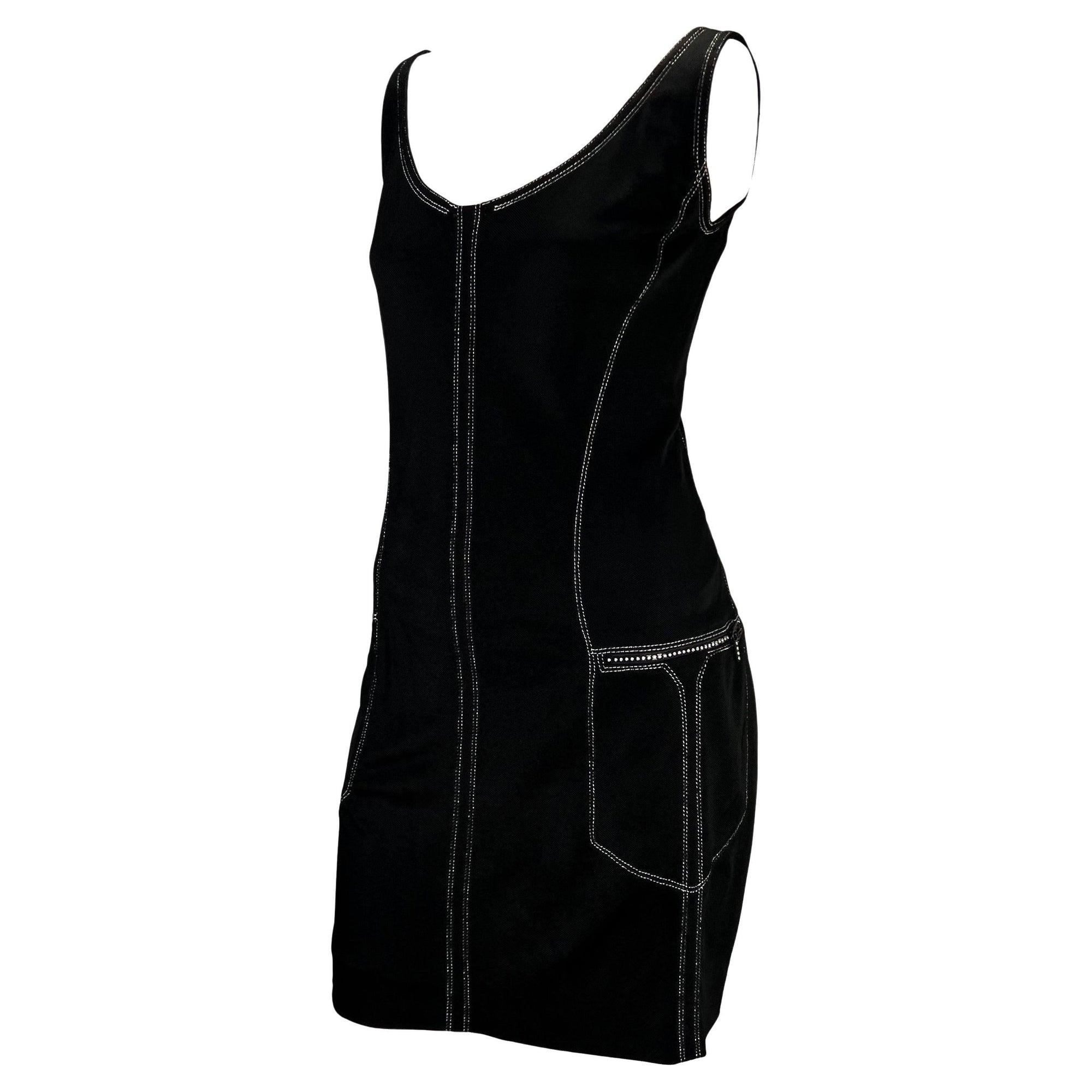 Presenting a black sleeveless Gianni Versace Couture dress, designed by Gianni Versace. From the Spring/Summer 1996 collection, this knit dress is finished with silver stitching and rhinestone accented zipper pockets at either hip. A fabulous and fun piece of late 1990s Gianni Versace, this dress remains effortlessly fabulous.