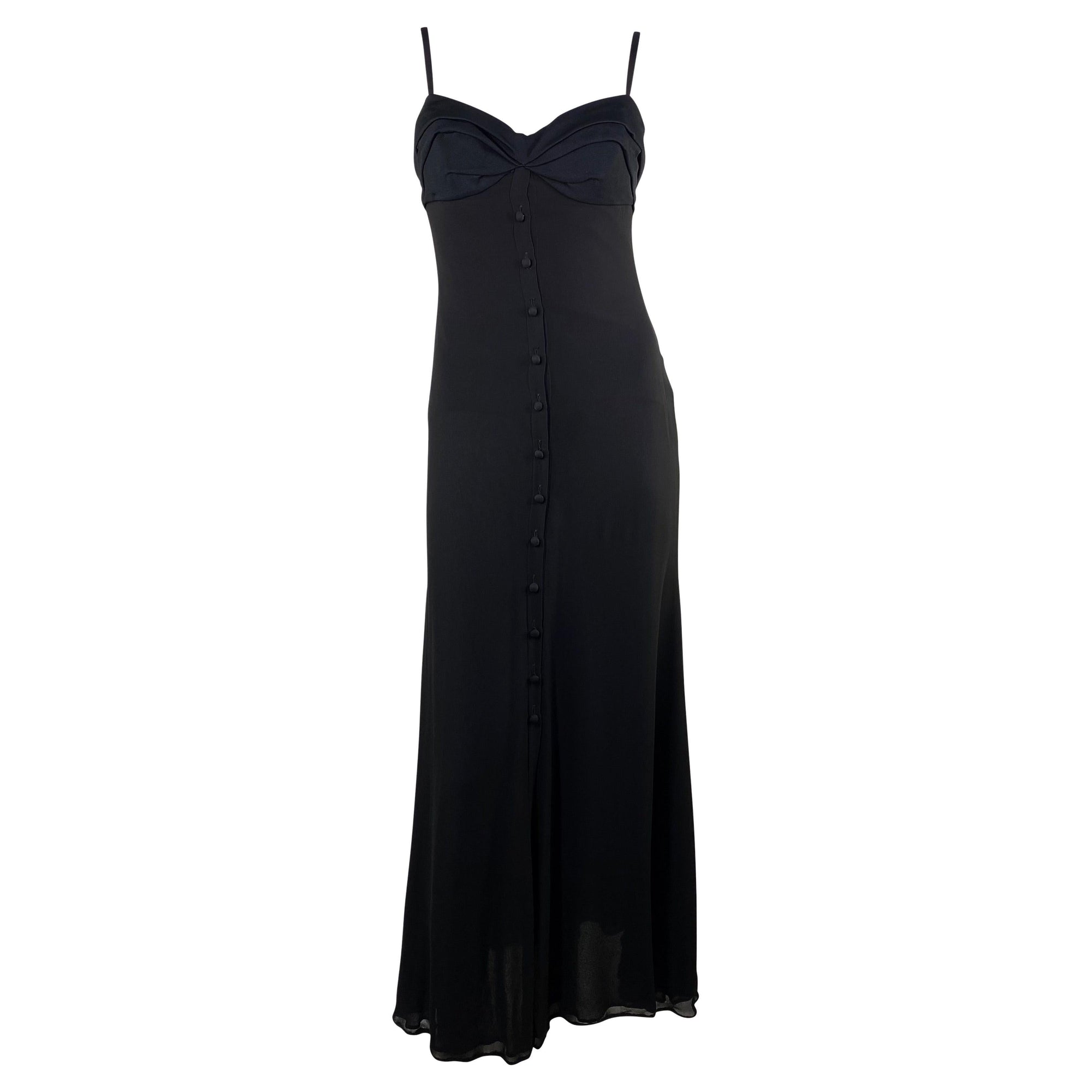 Presenting a beautiful button-up Gianni Versace Couture dress designed by Gianni Versace. This beautiful all-black dress is constructed of black sheer silk and features a faux button-up front closure, spaghetti straps, and a ruched sweetheart neckline. From the Spring/Summer 1996 collection, the runway presentation featured multiple variations of this dress, including a shorter white version on look number 22 on Linda Evangelista and a yellow version on Amber Valletta. Indeed, it is not your average little black dress; this sultry Gianni Versace dress was created to highlight the female form. The interior features a built-in leotard or bodysuit, creating a slim silhouette. This dress is a beautiful piece of fashion history and will surely be your new go-to.